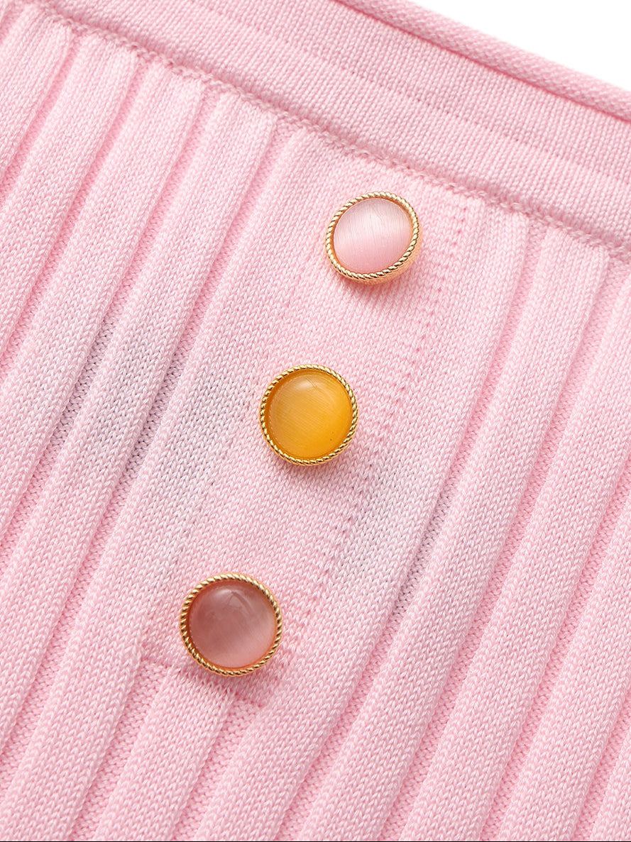 The Ava Dress in pink feels soft, romantic, and quietly playful. The reverse halter neckline opens the shoulders and collarbone, while the fitted bodice flows into a flared skirt that moves lightly with each step. Three gemstone buttons along the front add a delicate point of shine, giving the dress its signature charm.
