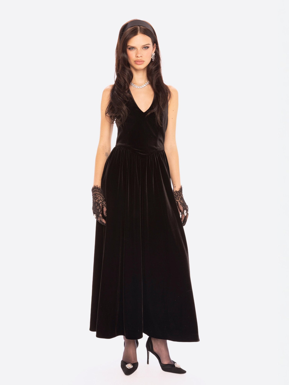 • Material: Stretch black velvet with a soft sheen and luxurious touch.