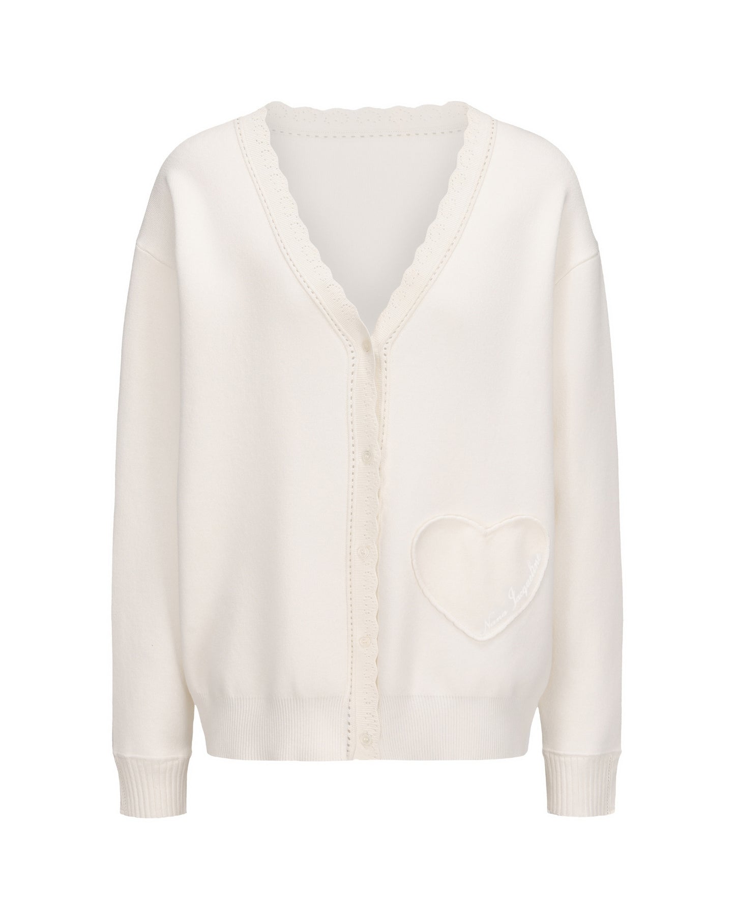 The Carrie Cardigan is a sweet and feminine cardigan made from soft, skin-friendly yarn with a relaxed silhouette. Heart-shaped lace details and tonal buttons bring romantic charm, while a heart-shaped patch pocket with embroidery adds playful elegance. This soft knit cardigan for women is perfect for both lounging at home and stepping out with grace.