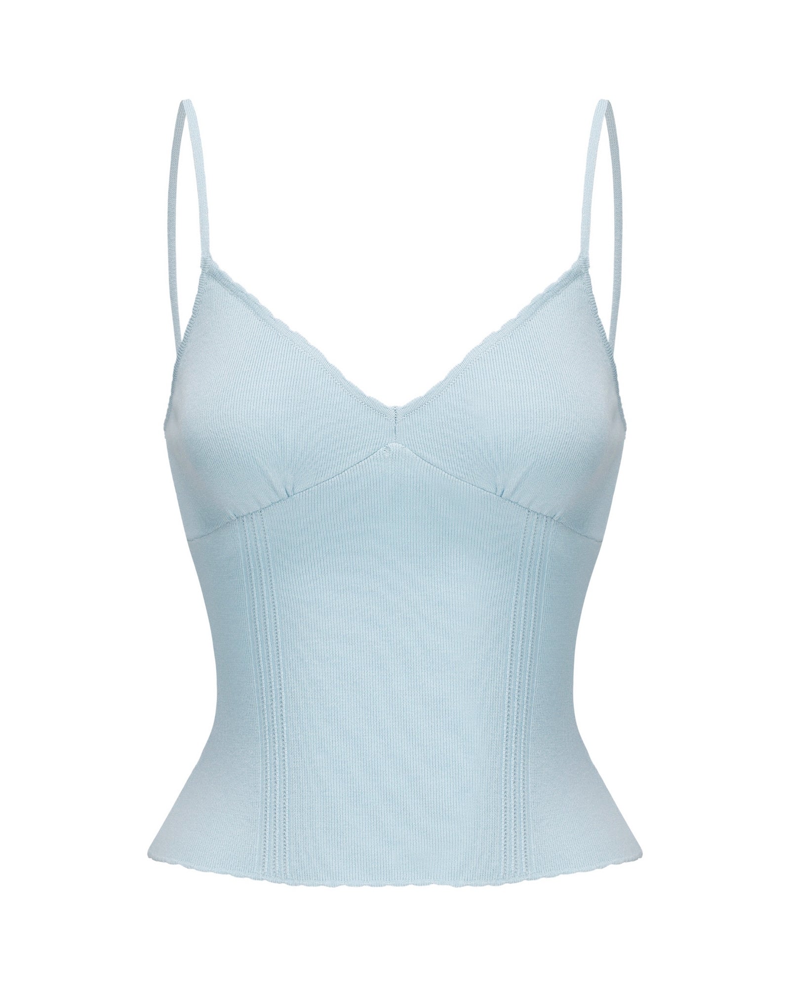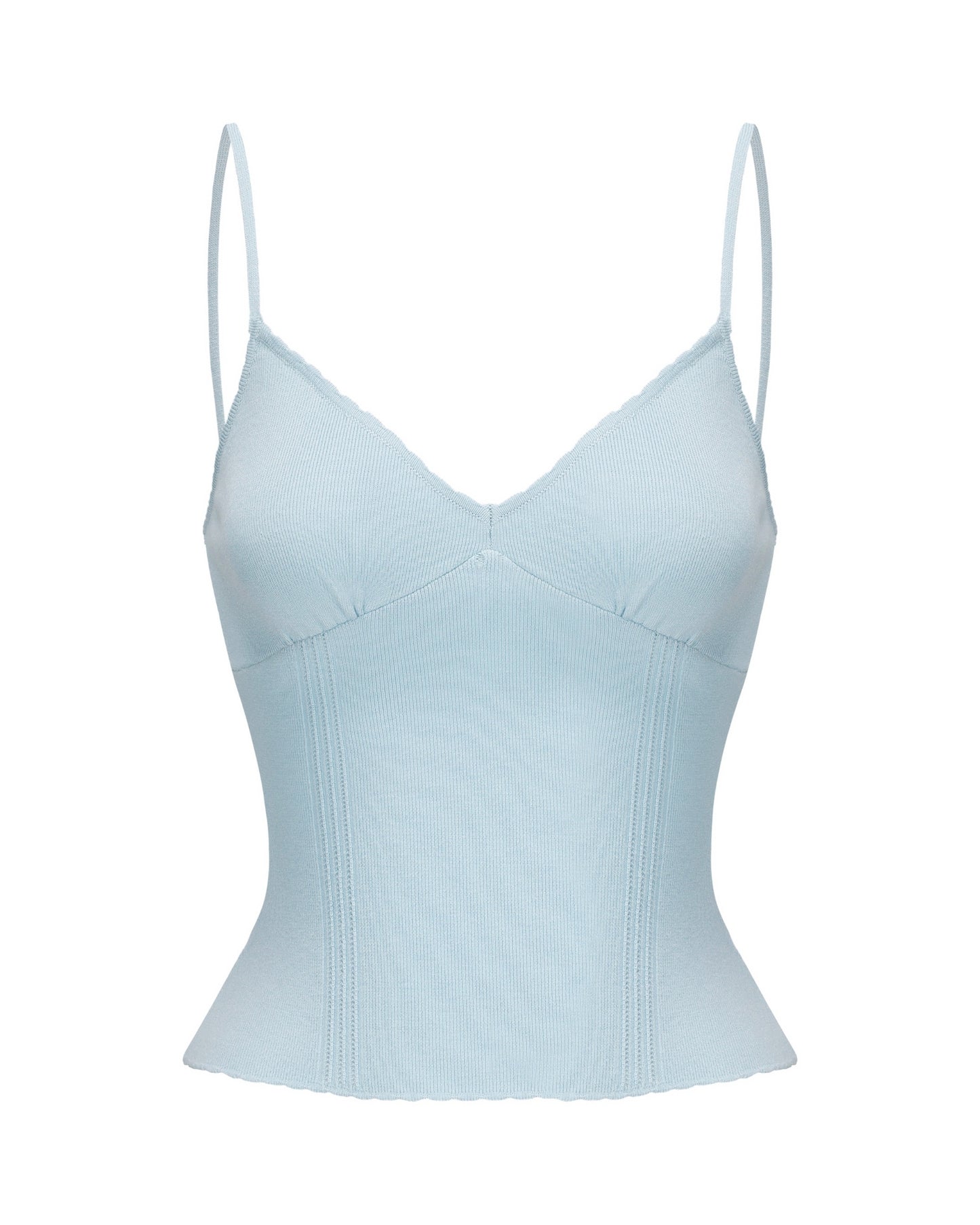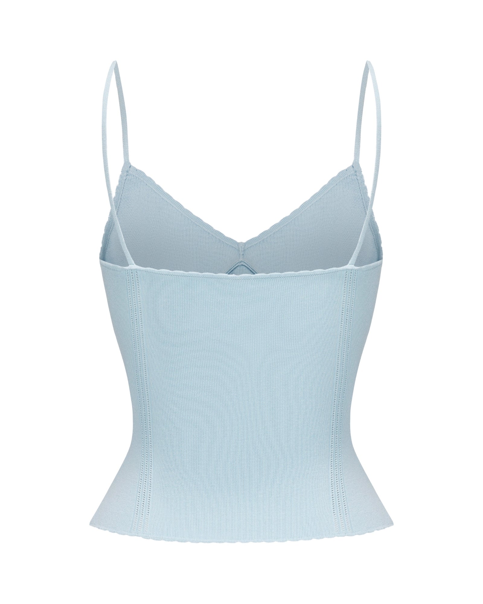 The Carrie Top is a romantic feminine top designed to flatter and charm. Crafted from soft, high-twist core-spun yarn, this elegant knitted tank top features delicate lace trim and a cinched waist that highlights your natural shape. The flattering V-neckline camisole frames the collarbone and creates a graceful, sculpted silhouette.