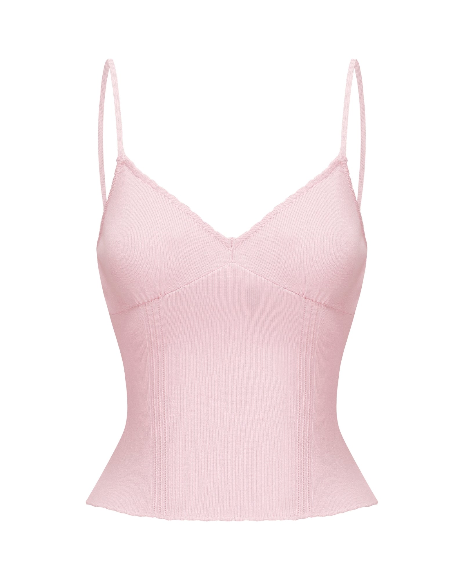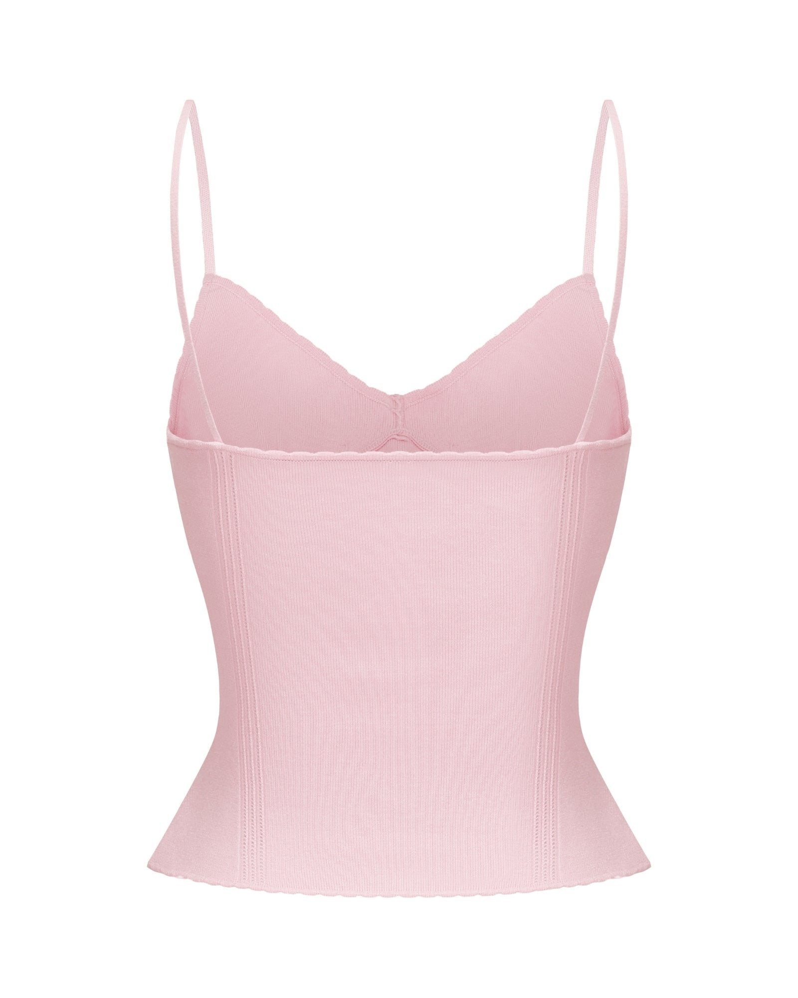 The Carrie Top is a romantic feminine top designed to flatter and charm. Crafted from soft, high-twist core-spun yarn, this elegant knitted tank top features delicate lace trim and a cinched waist that highlights your natural shape. The flattering V-neckline camisole frames the collarbone and creates a graceful, sculpted silhouette.