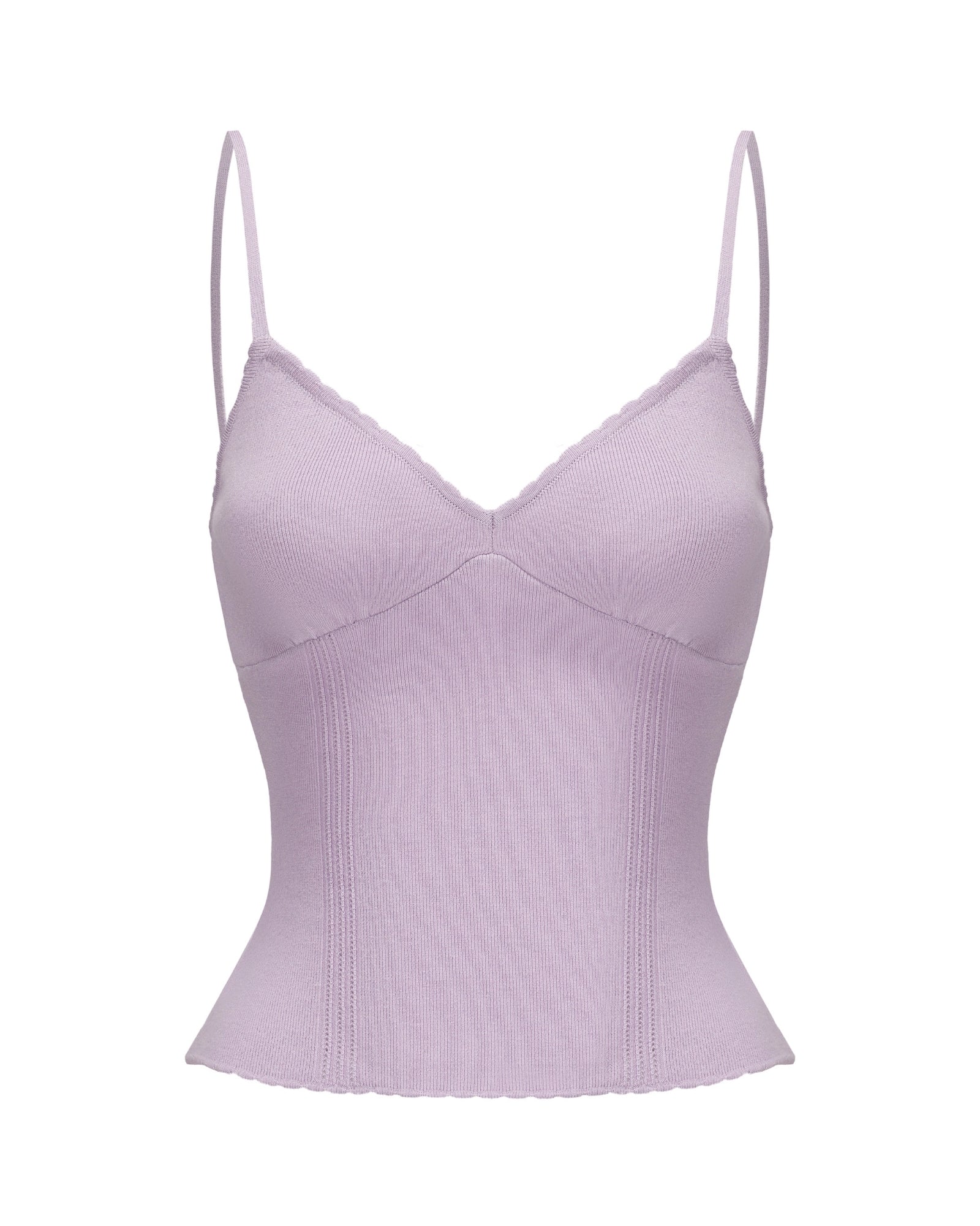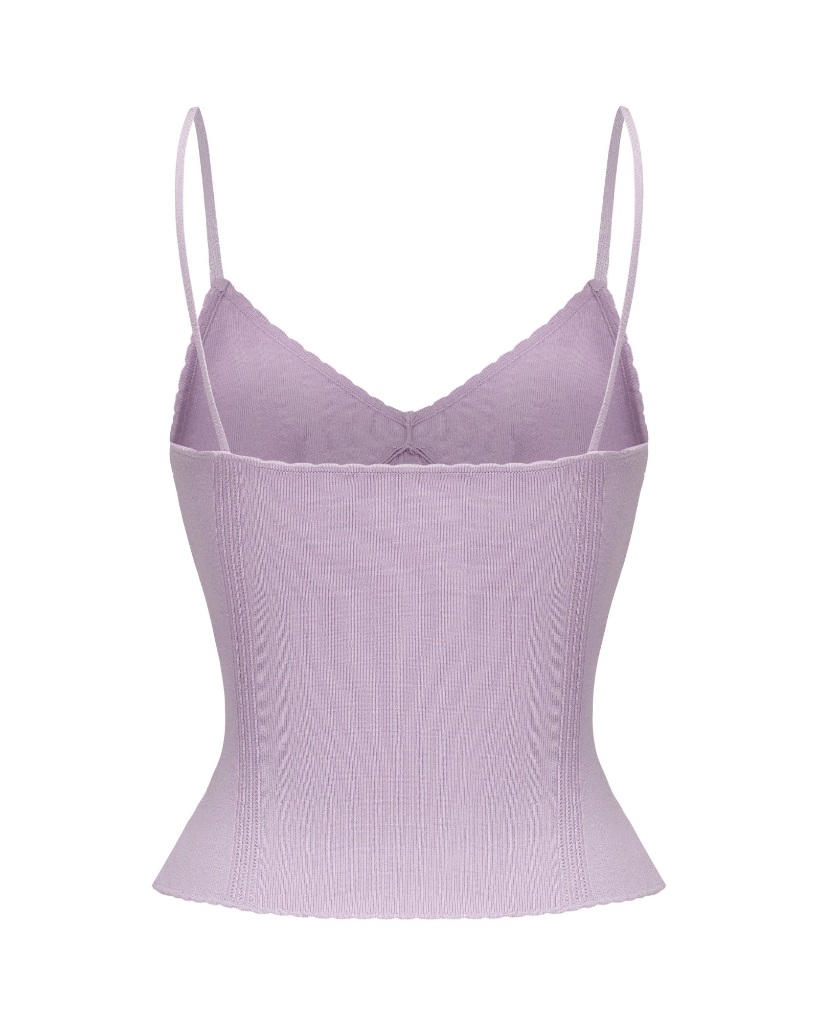 The Carrie Top is a romantic feminine top designed to flatter and charm. Crafted from soft, high-twist core-spun yarn, this elegant knitted tank top features delicate lace trim and a cinched waist that highlights your natural shape. The flattering V-neckline camisole frames the collarbone and creates a graceful, sculpted silhouette.