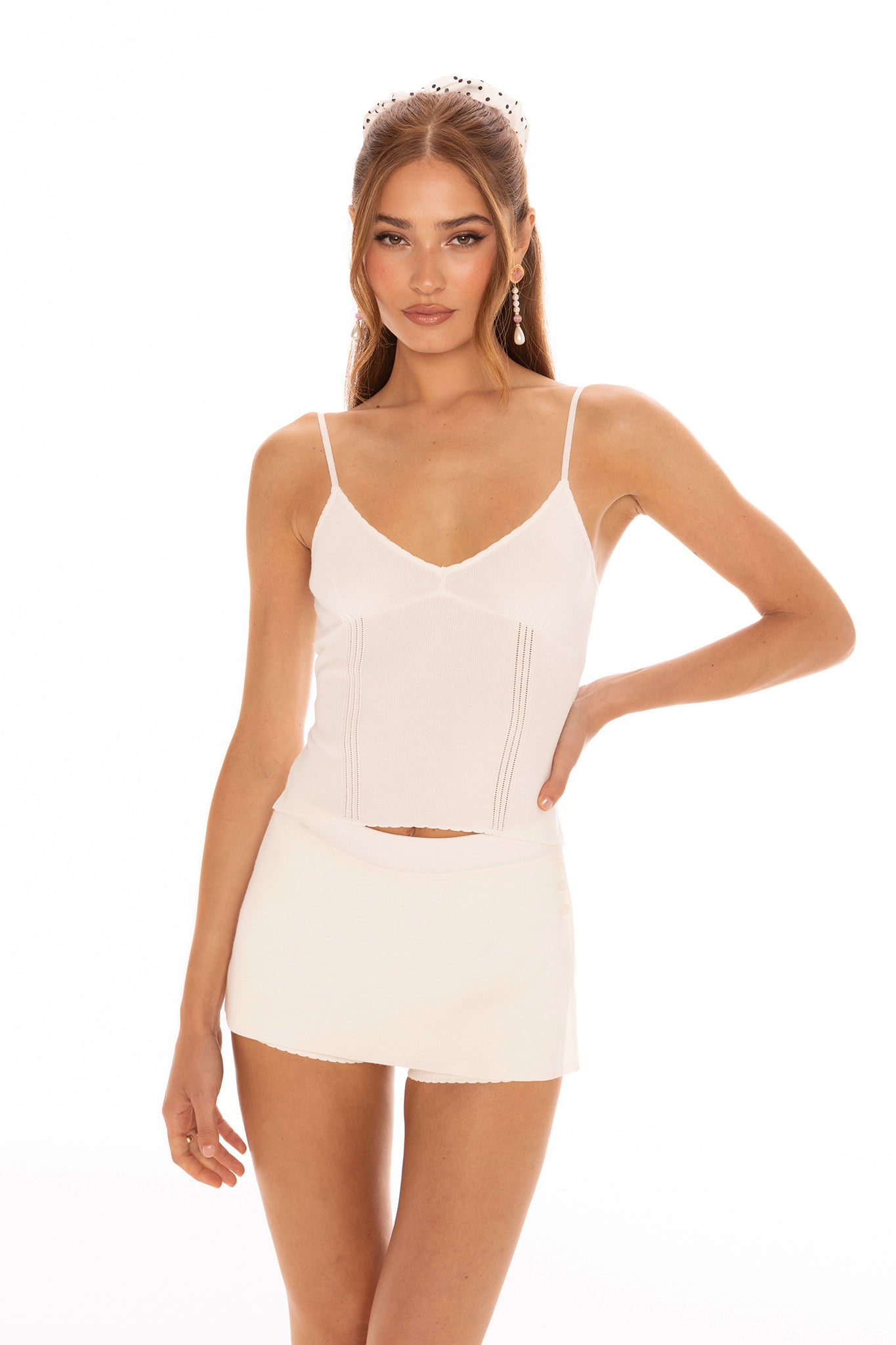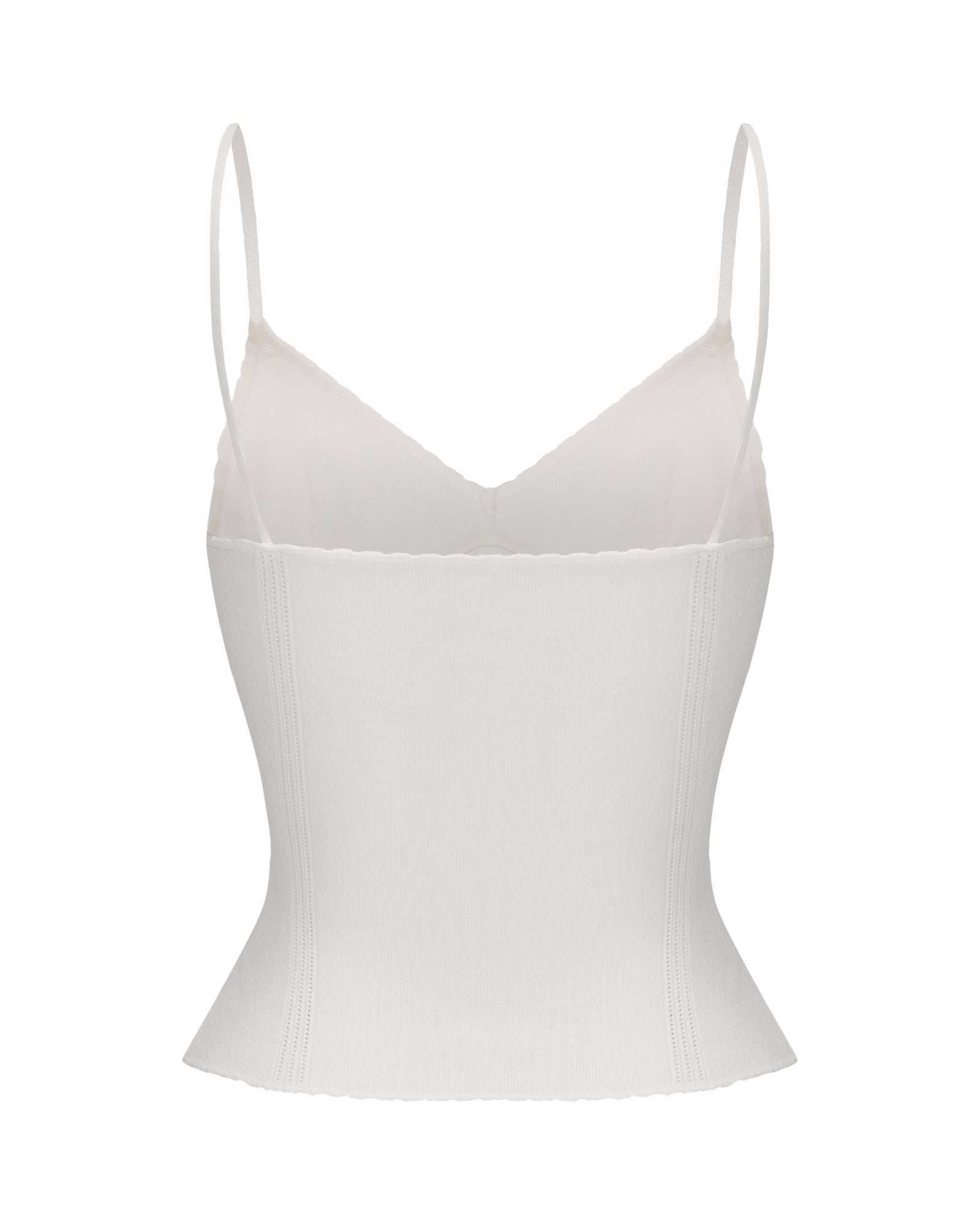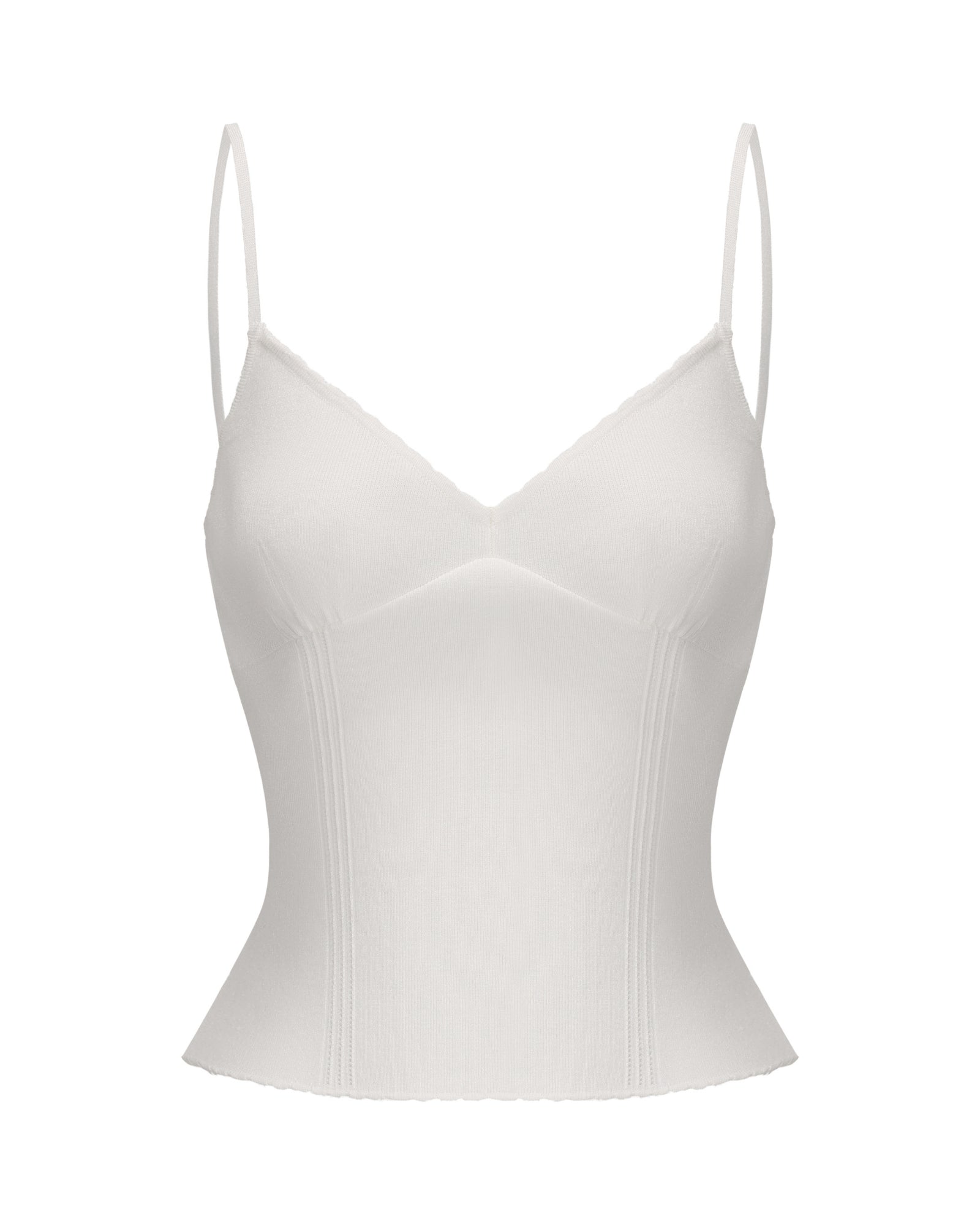 The Carrie Top is a romantic feminine top designed to flatter and charm. Crafted from soft, high-twist core-spun yarn, this elegant knitted tank top features delicate lace trim and a cinched waist that highlights your natural shape. The flattering V-neckline camisole frames the collarbone and creates a graceful, sculpted silhouette.