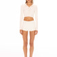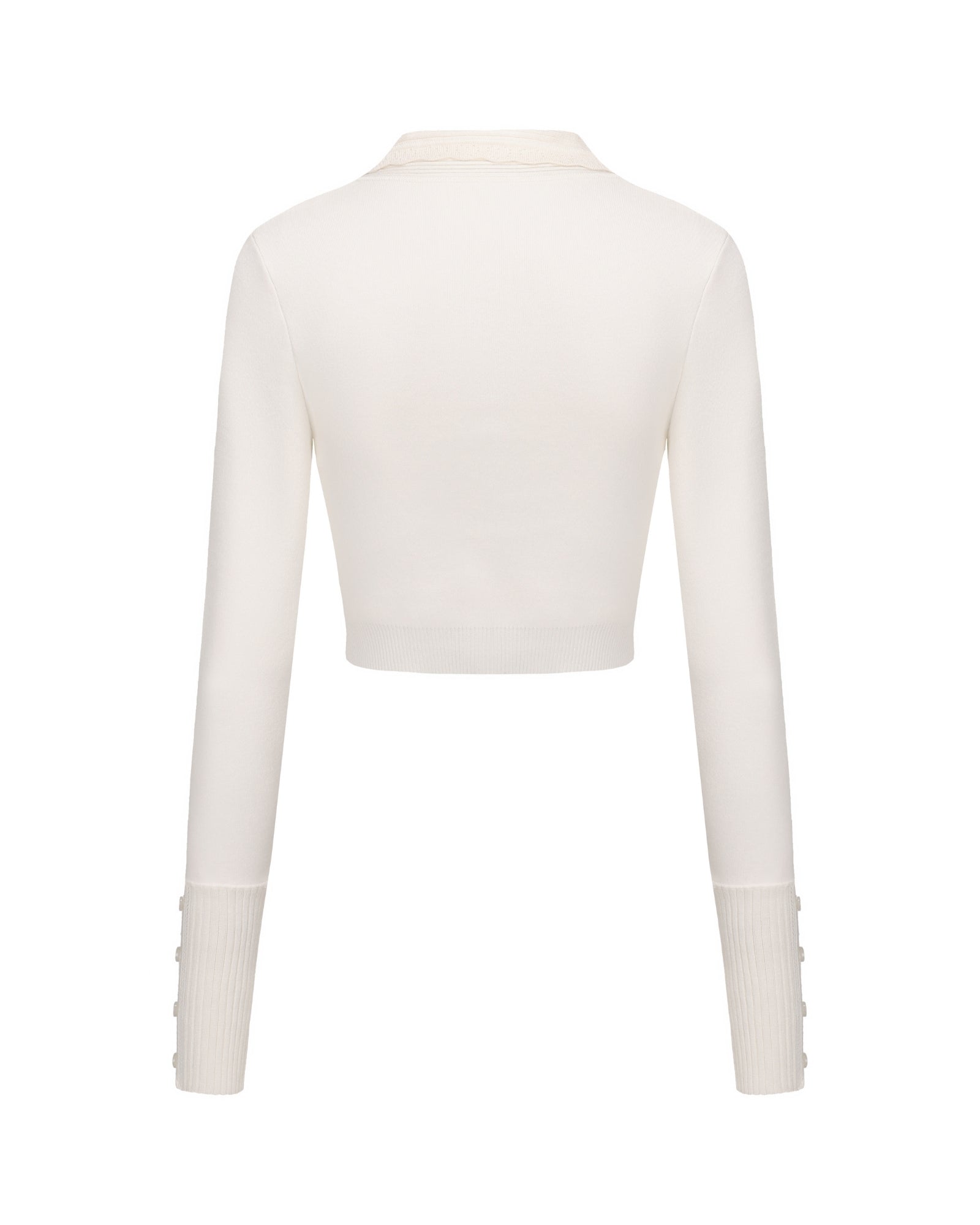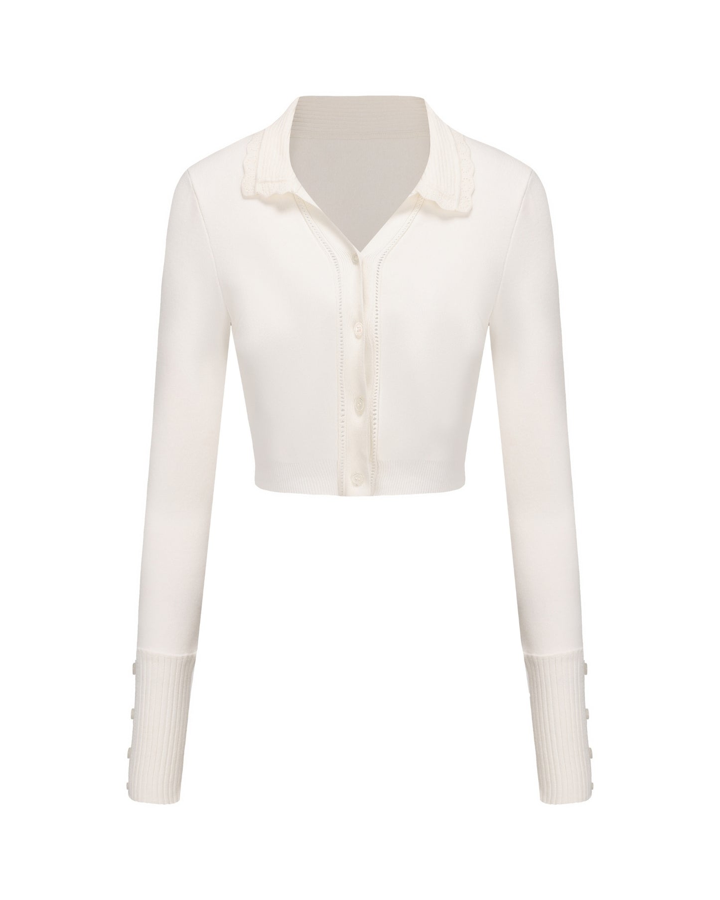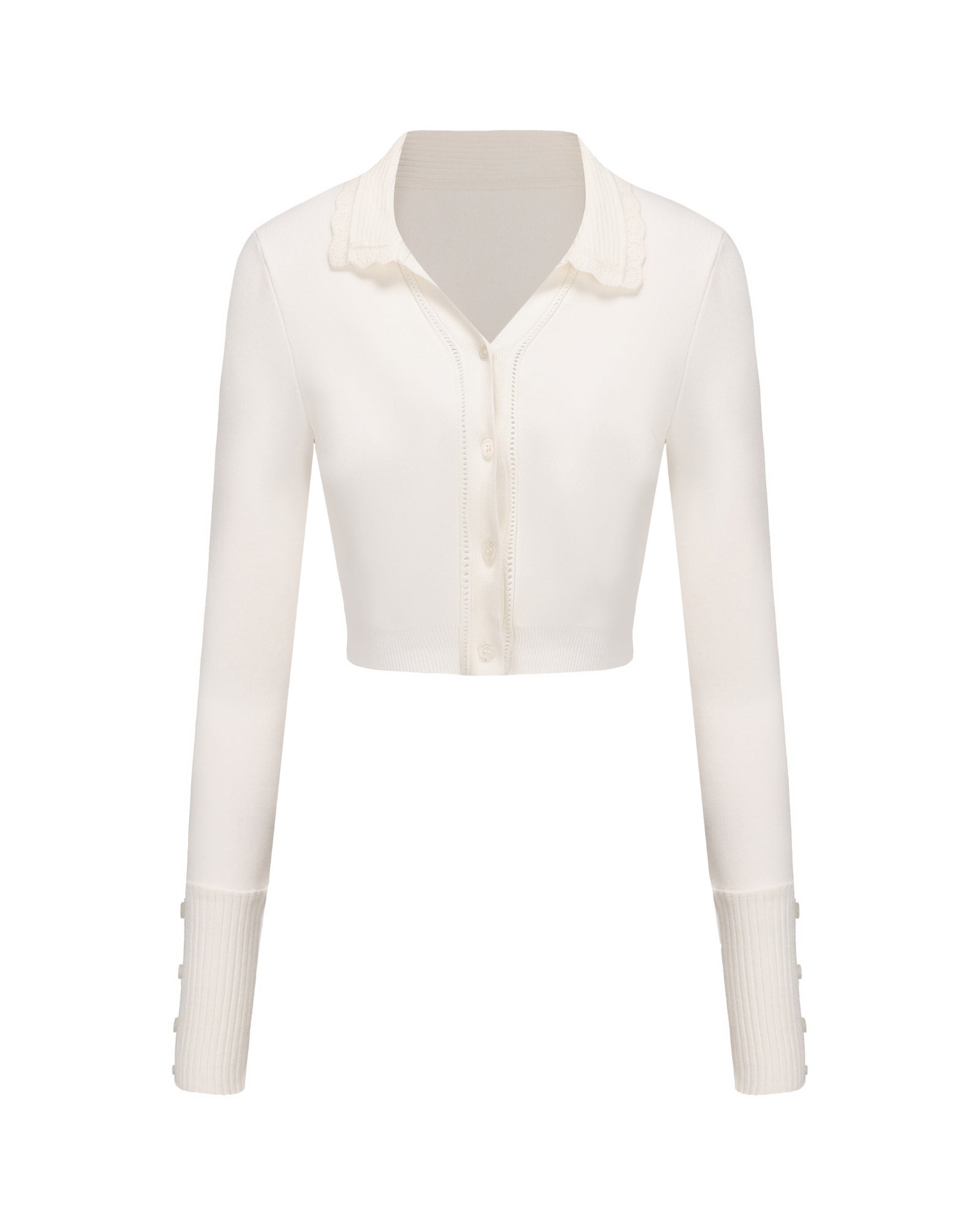 The Jenna Cardigan is a romantic knitwear essential, crafted from high-twist core-spun yarn for a soft and skin-friendly feel. The short length flatters your waist and elongates the figure, while the lace-trimmed lapel and heart-shaped eyelet details add a delicate, feminine charm.