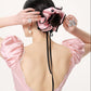Elevate your everyday hairstyle with the Marlene Scrunchie. Crafted from soft blush pink satin with bold black edging, it features playful ruffle detailing and long black ribbon tails for an effortlessly chic look. Gentle on your hair and secure enough for all-day wear, it’s the perfect accessory to tie any outfit together.