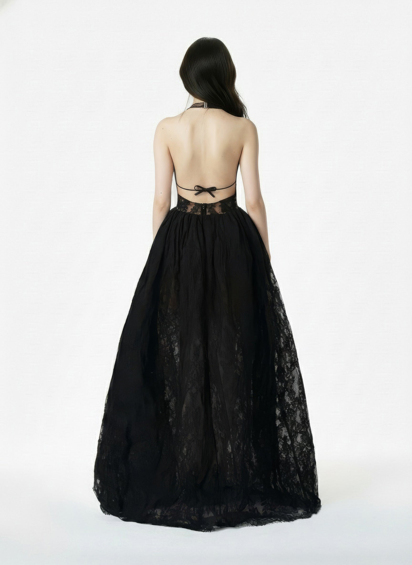 The Mirelle Lace Maxi Dress is a poetic black lace dress crafted for moonlit elegance, a designer dress where sculpted lace blooms across a sheer halter bodice. The bow-touched neckline frames the shoulders, while the cinched waist releases into a full A-line lace skirt that moves like a quiet breath of romance, a halter dress made for unforgettable evenings.
