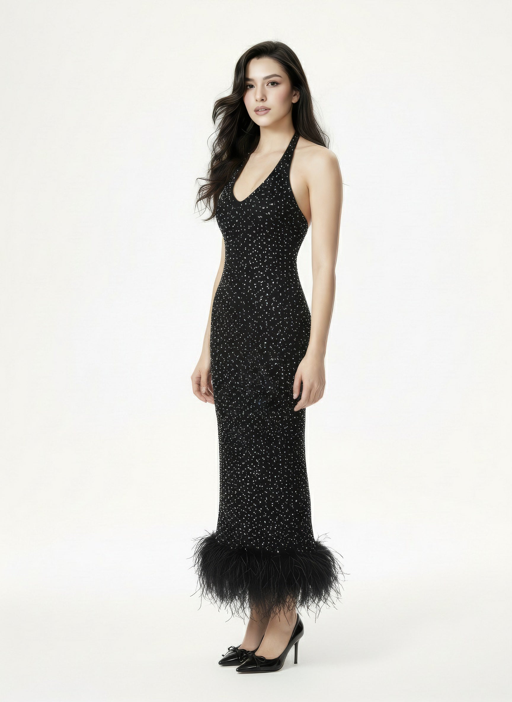 Black halter diamond maxi dress with feathered hem on a white background: -
