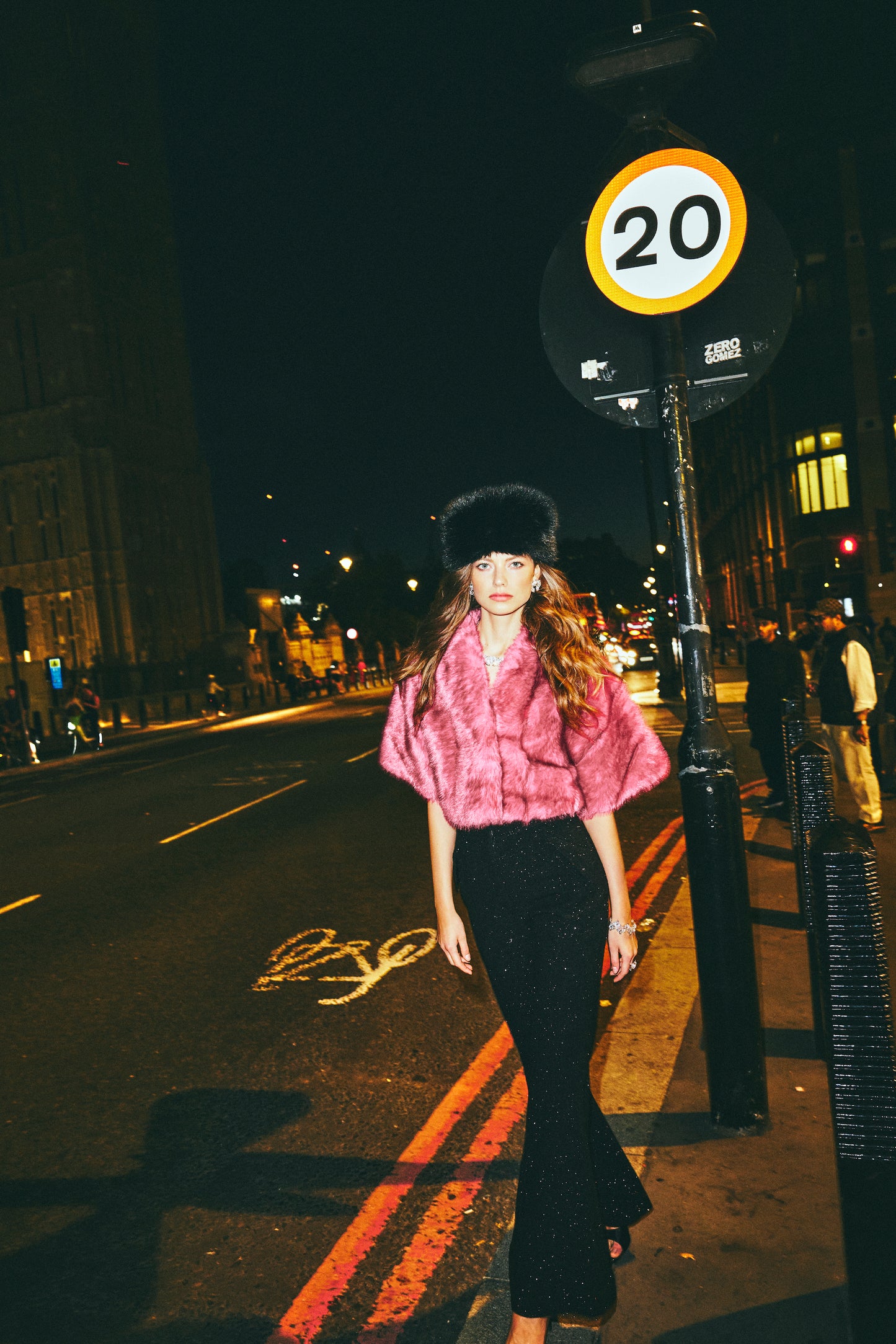 Cropped fur coats are our muse this season. Made of high-quality, environementally-friendly fur fabric, this chic coat is a perfect addition to your wardrobe. Its cropped design adds playfulness while the plush material adds warmth.