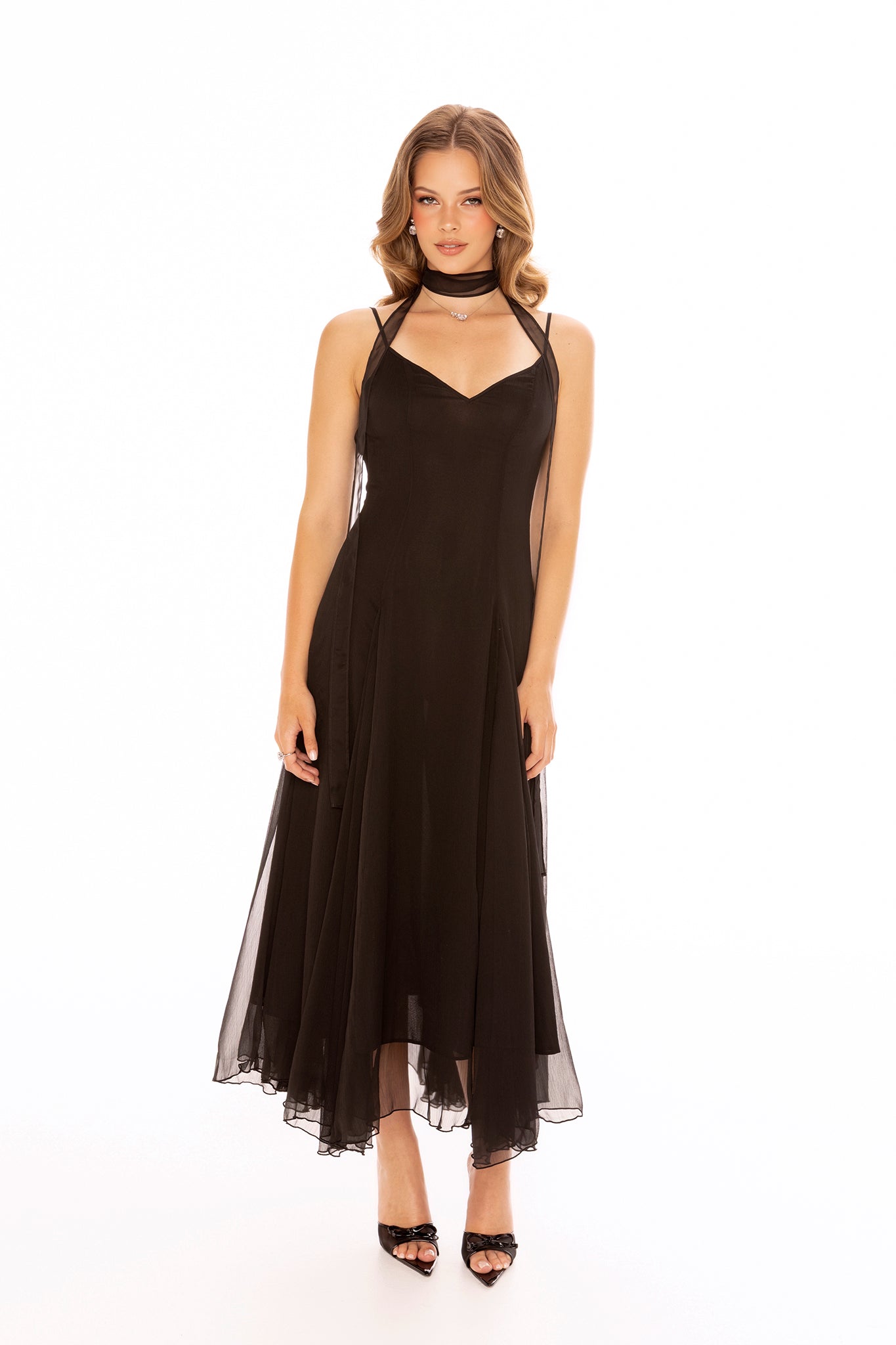 The Irena Dress captures ethereal elegance in motion. Designed with a soft outer chiffon layer and gently supportive lining, this flowing A-line maxi dress skims the silhouette with every step. A dramatic open back and delicate bow accents add feminine charm, while the high-low hem reveals a hint of ankle for a graceful finish.