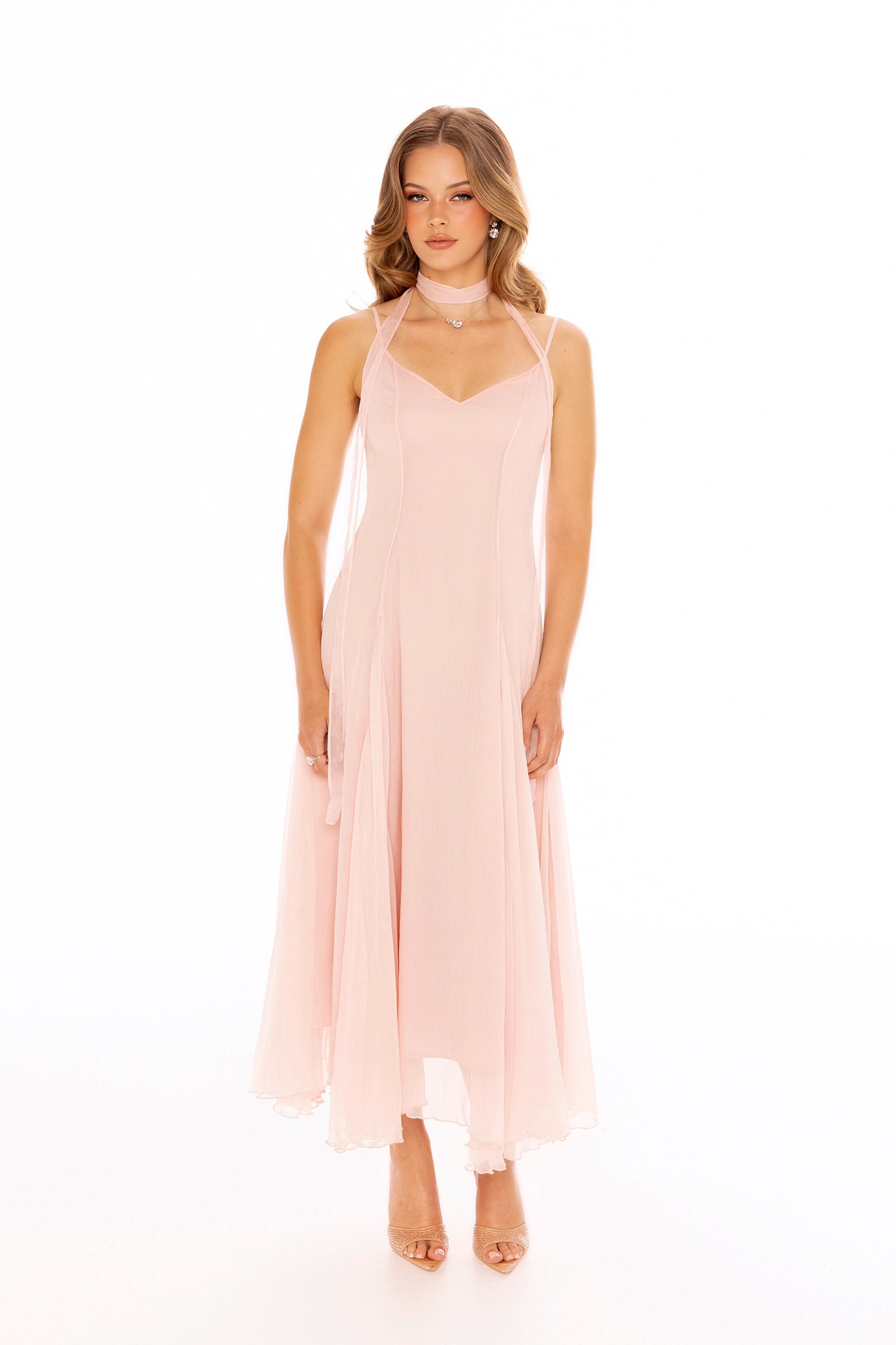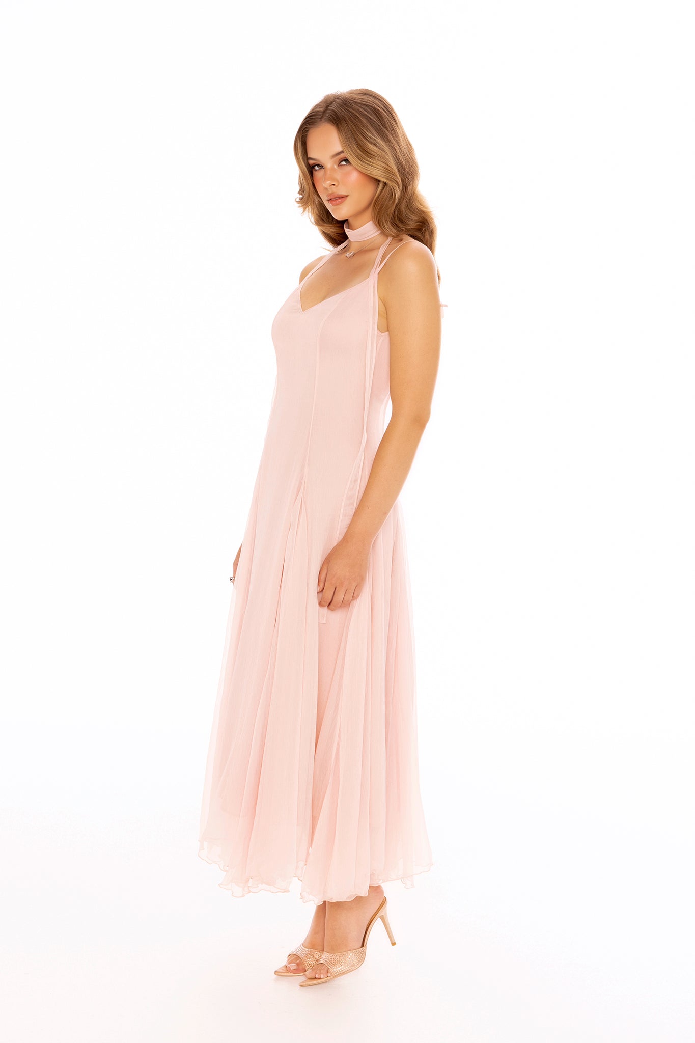 The Irena Dress captures ethereal elegance in motion. Designed with a soft outer chiffon layer and gently supportive lining, this flowing A-line maxi dress skims the silhouette with every step. A dramatic open back and delicate bow accents add feminine charm, while the high-low hem reveals a hint of ankle for a graceful finish.