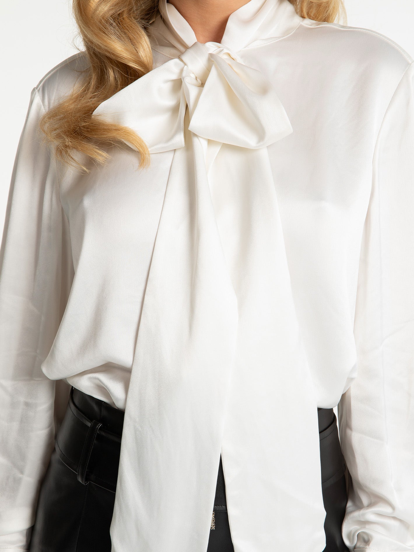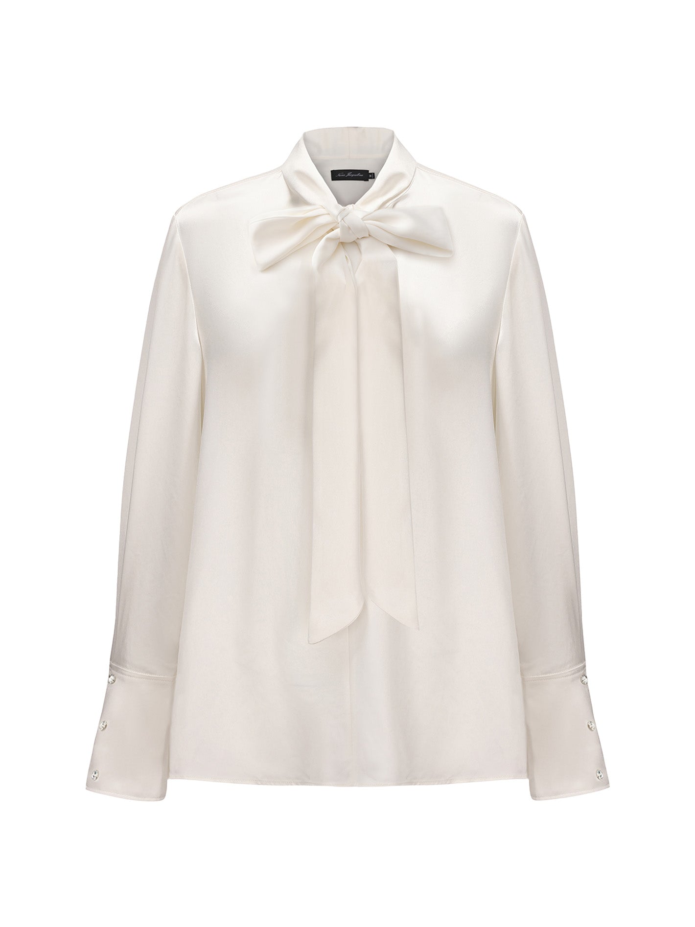 The Louisa Top is crafted from luxurious double-sided satin, offering a smooth, lustrous finish both inside and out for an ultra-high-end feel. The sophisticated high-neck design is balanced by a front open collar, adorned with a ribbon that can be tied into an elegant bow, draping gracefully over the chest to enhance its feminine allure. The back features a carefully segmented design that adds structure and definition, while the lengthened cuffs create clean, refined lines. This top embodies a perfect blend of elegance and modernity, making it a standout piece for any wardrobe.