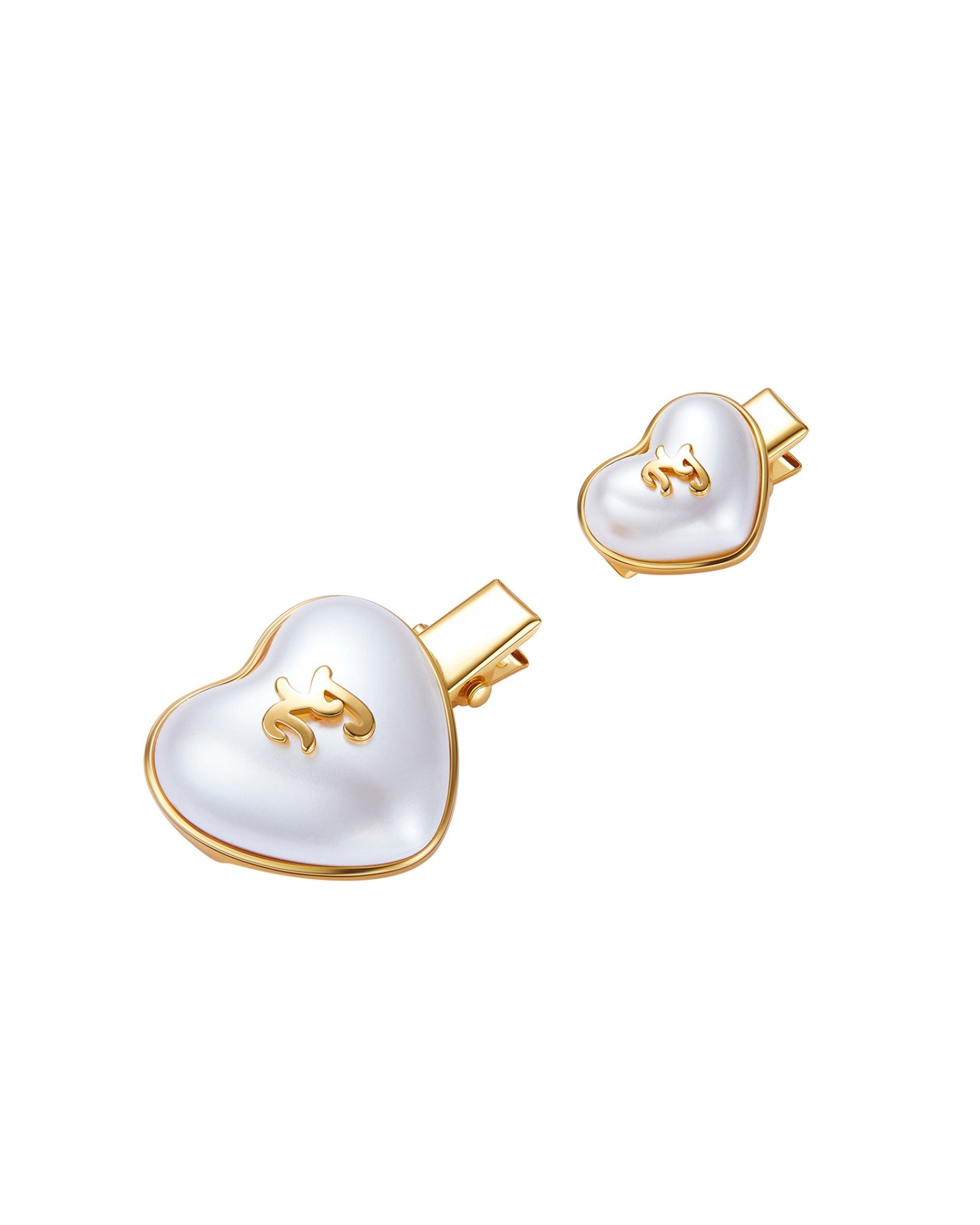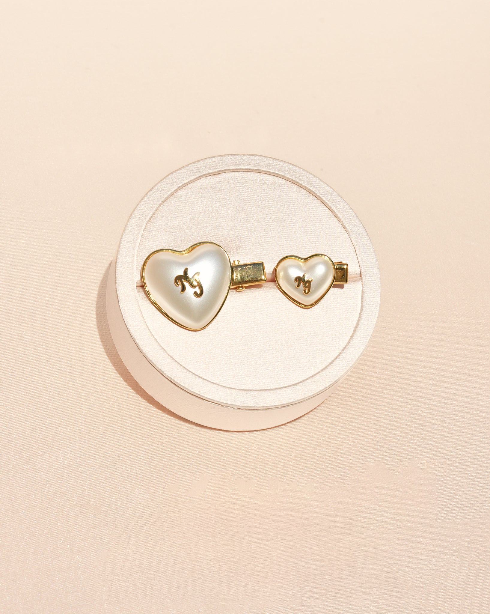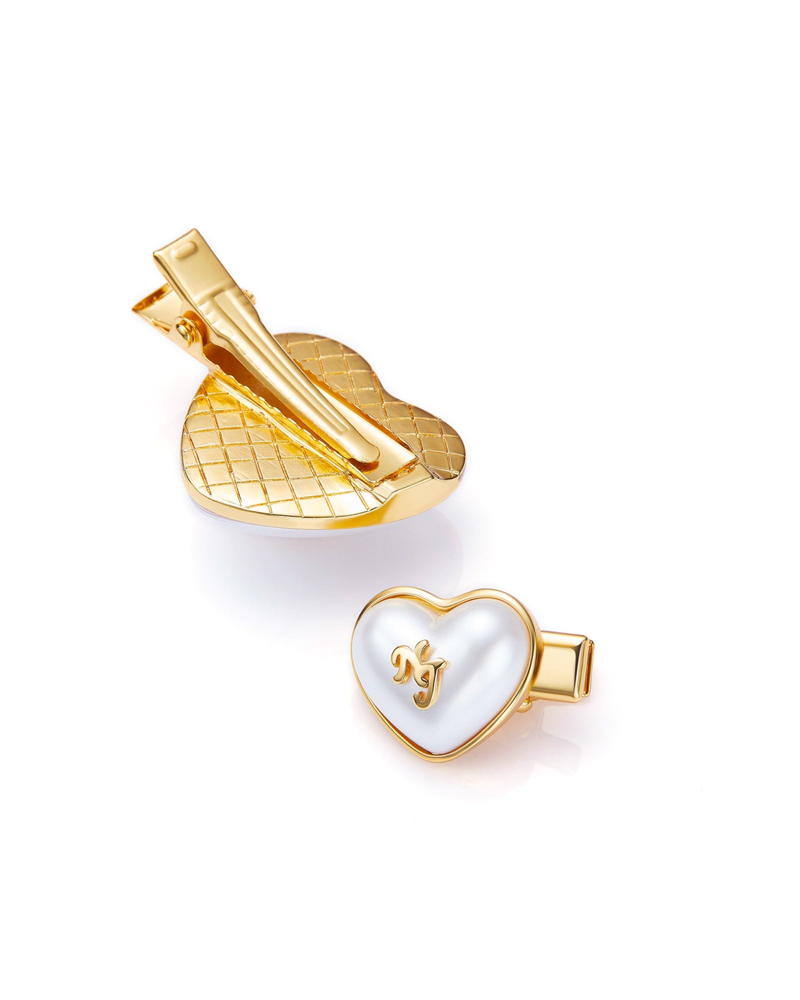 Add a romantic touch with the Valencia Hair Pin. These gold heart hair clips feature smooth pearl effect hearts embossed with the NJ logo, set on sleek mini barrettes in two complementary sizes. They’re perfect for styling soft waves, pinning back bangs, or adding a romantic detail to any outfit. A sweet and subtle upgrade to your everyday hair accessories.