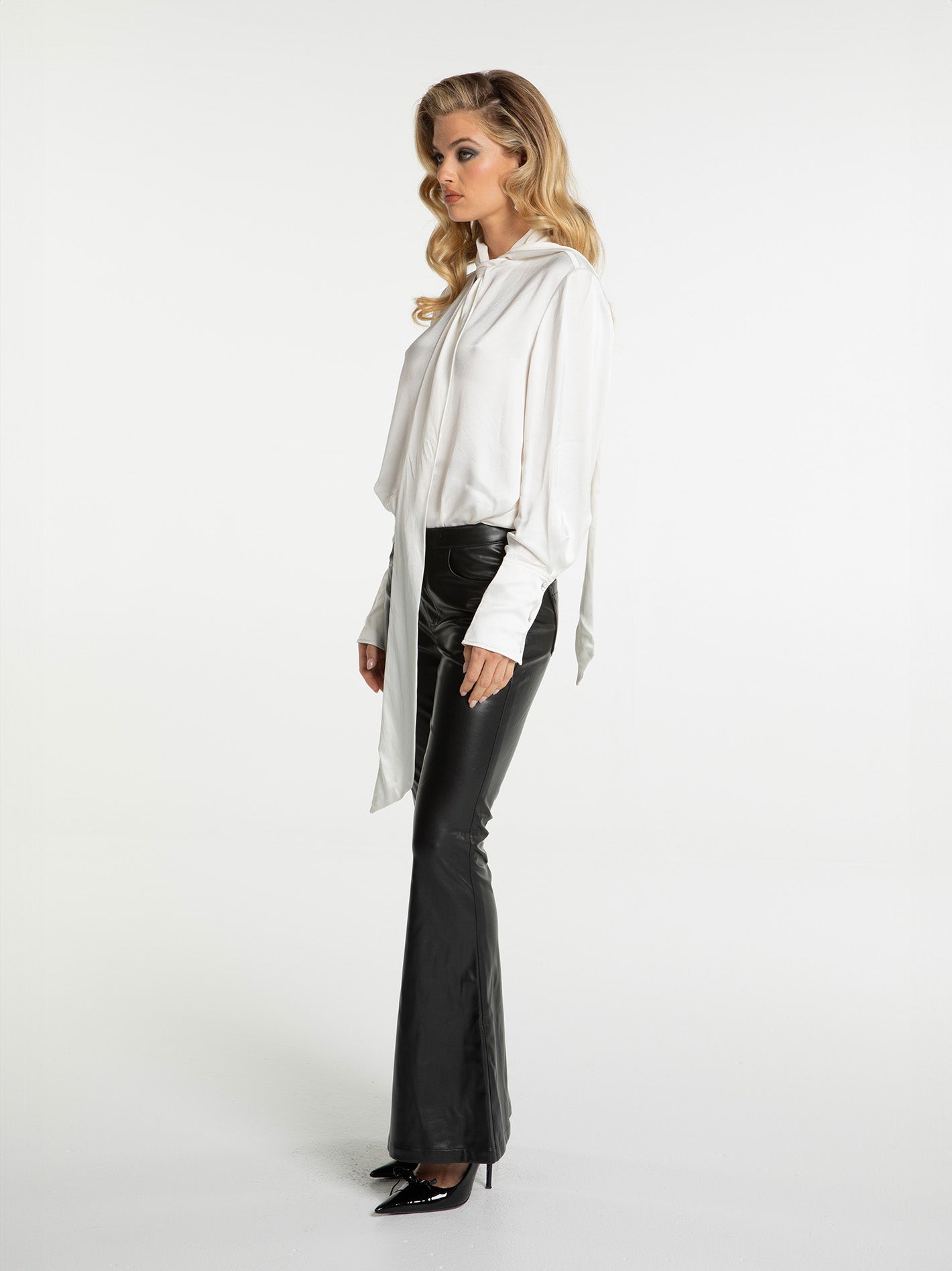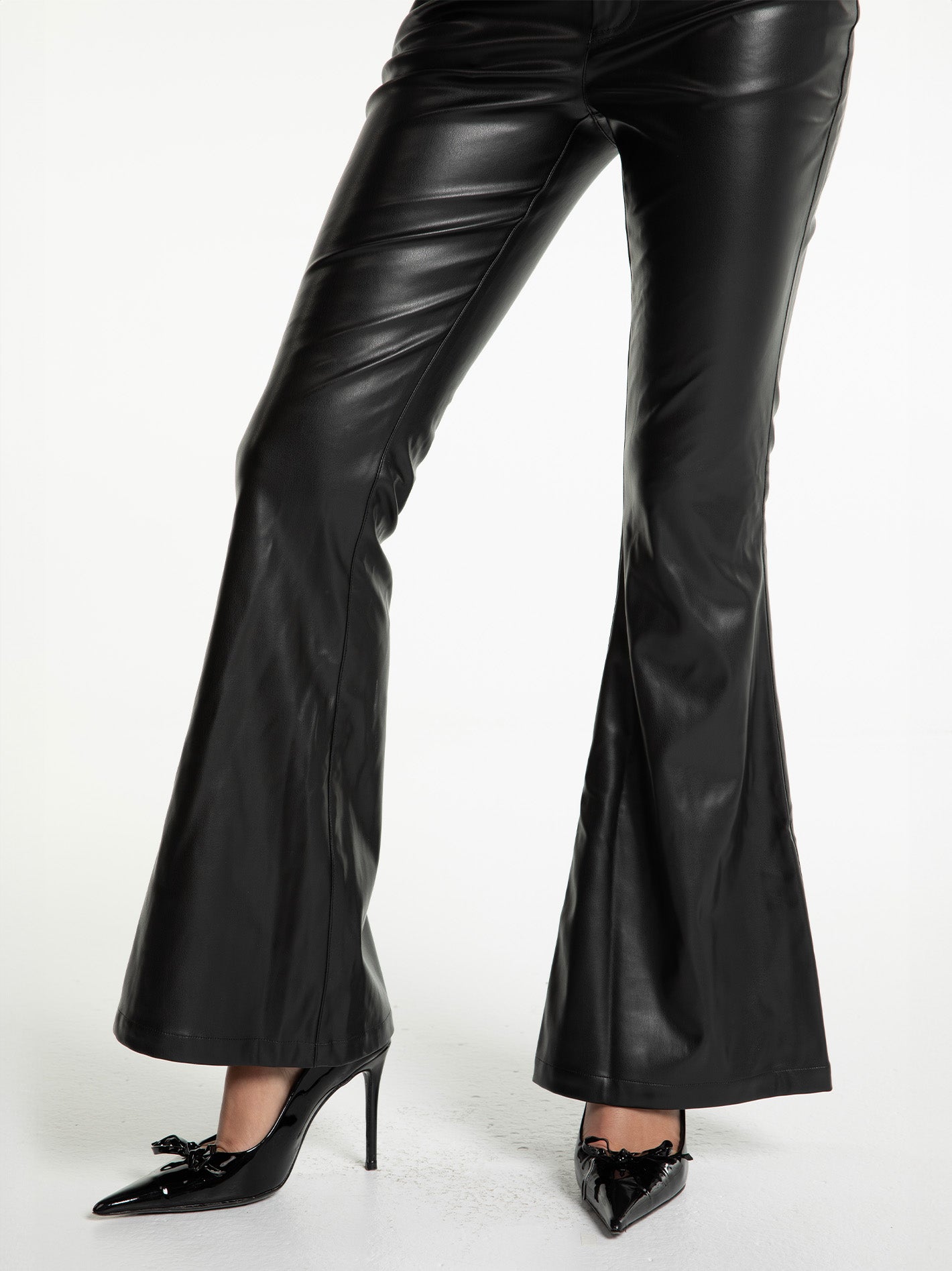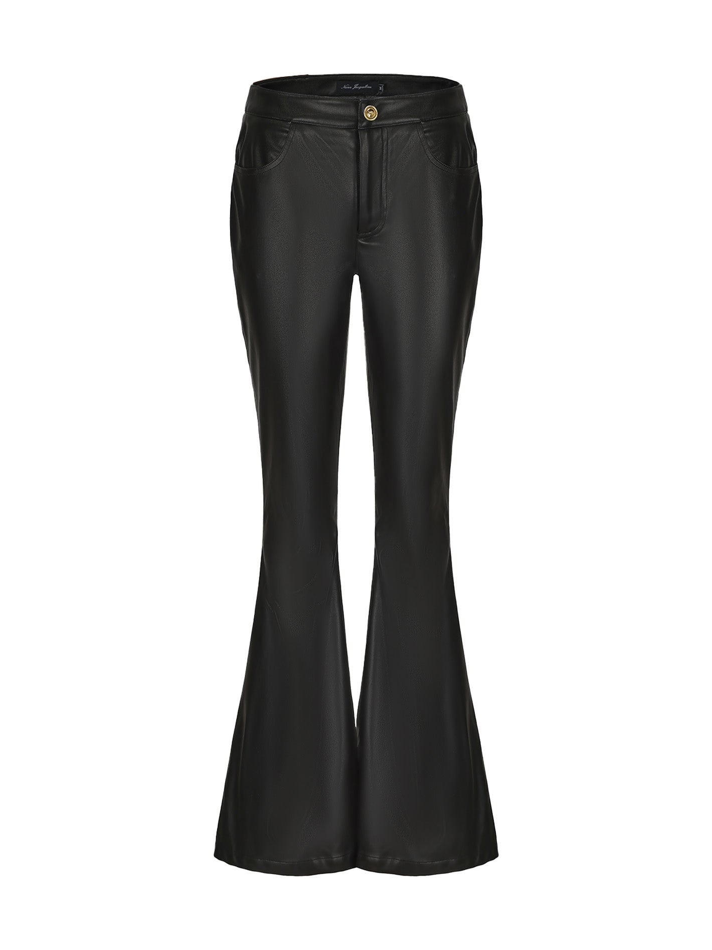 The Vera Pants are crafted from large elastic PU leather fabric, offering a soft, shaping fit with exceptional comfort. The hip-hugging, flared design adds a touch of sensuality and modern style. The waistband is adorned with gold buttons featuring the original logo and a buttonhole closure, adding a luxurious detail. A leather patch trim on the back waist enhances the overall design, creating a sleek and stylish look.
