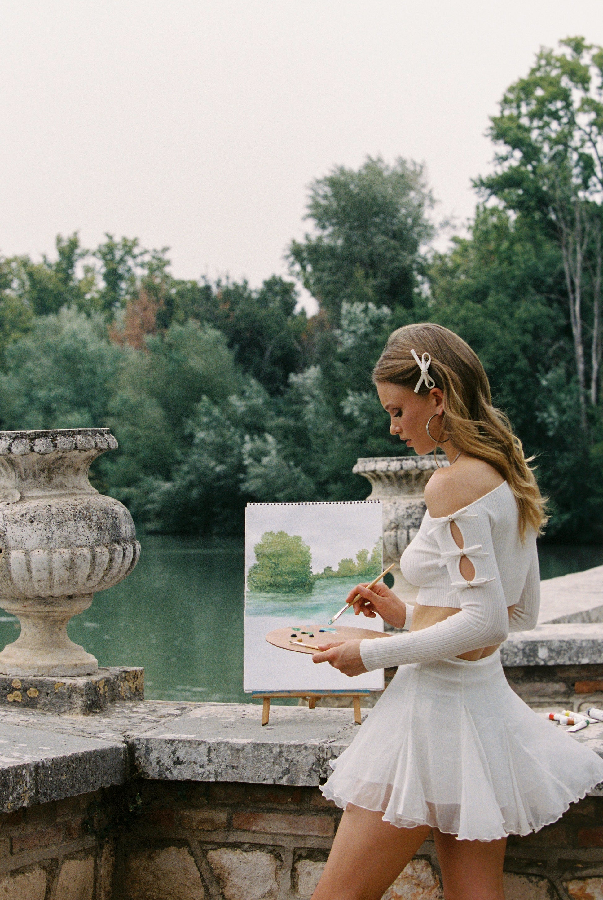 The Zara Top blends elegance and playfulness with its off-shoulder design, subtly showcasing the collarbone for a chic, feminine look. Crafted in soft ribbed knit, this white knit top offers stretch, comfort, and a flattering fit that hugs the waist without feeling restrictive. Satin bows at the hollowed cuffs add a sweet, youthful charm, making this long sleeve off-shoulder top perfect for both casual styling and elevated evening looks.