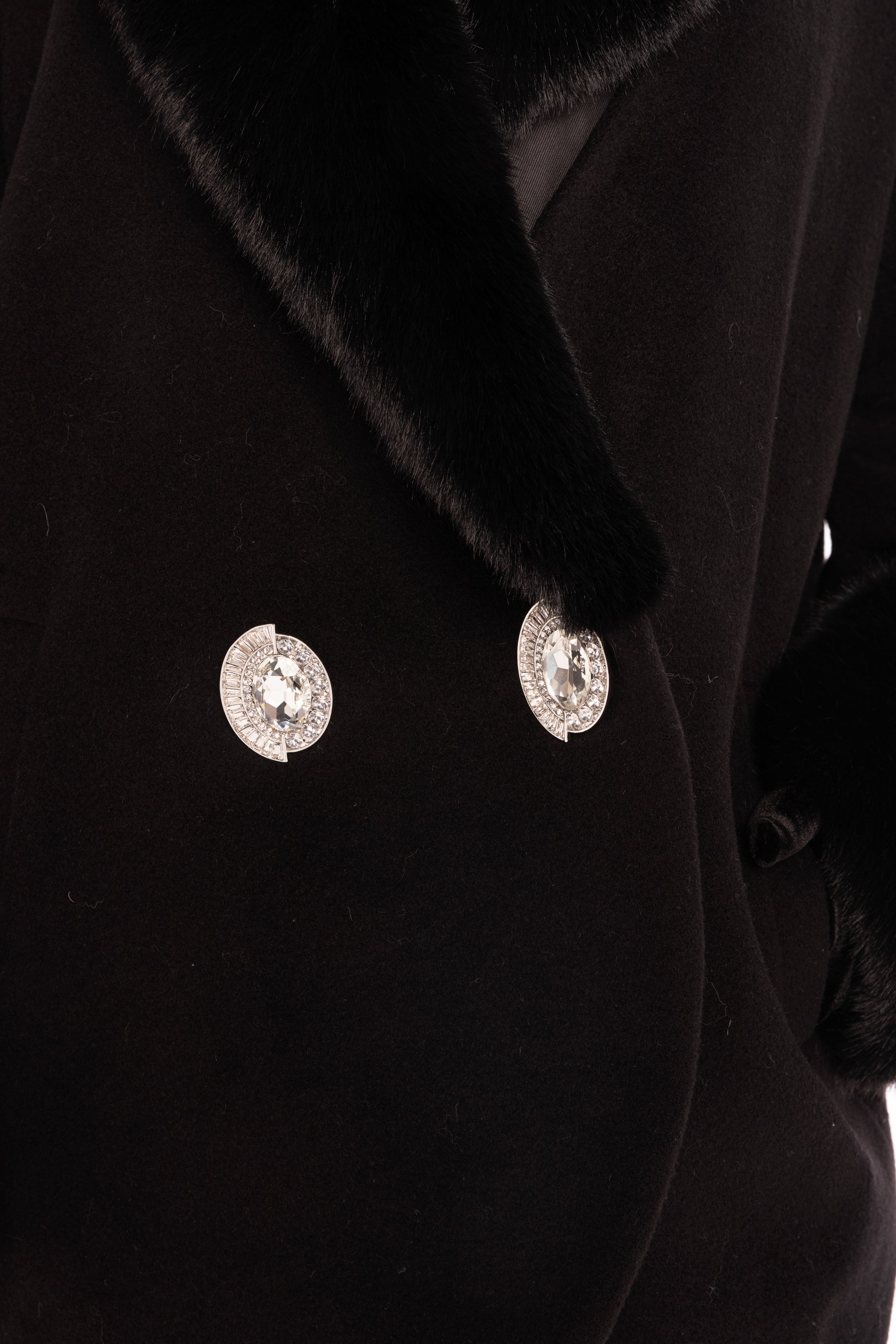 Black large fur collar and diamond embellished cocoon coat on a white background: -