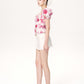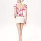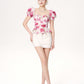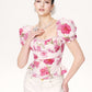 Design: Floral print blouse with puff sleeves, asymmetric waist pleating, and lace trim.