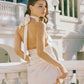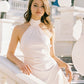 The Isadora Dress is an elegant satin dress in a soft champagne tone, designed to capture quiet glamour and effortless romance. Made from pearlescent satin that catches the light with a delicate sheen, this lace halter dress features an adjustable neckline and a flowing, backless silhouette that gently traces the curves of your back. Asymmetric pleats at the waist enhance the shape, while the hem is finished with eyelash lace that stretches outwards gently, adding soft movement and charm.