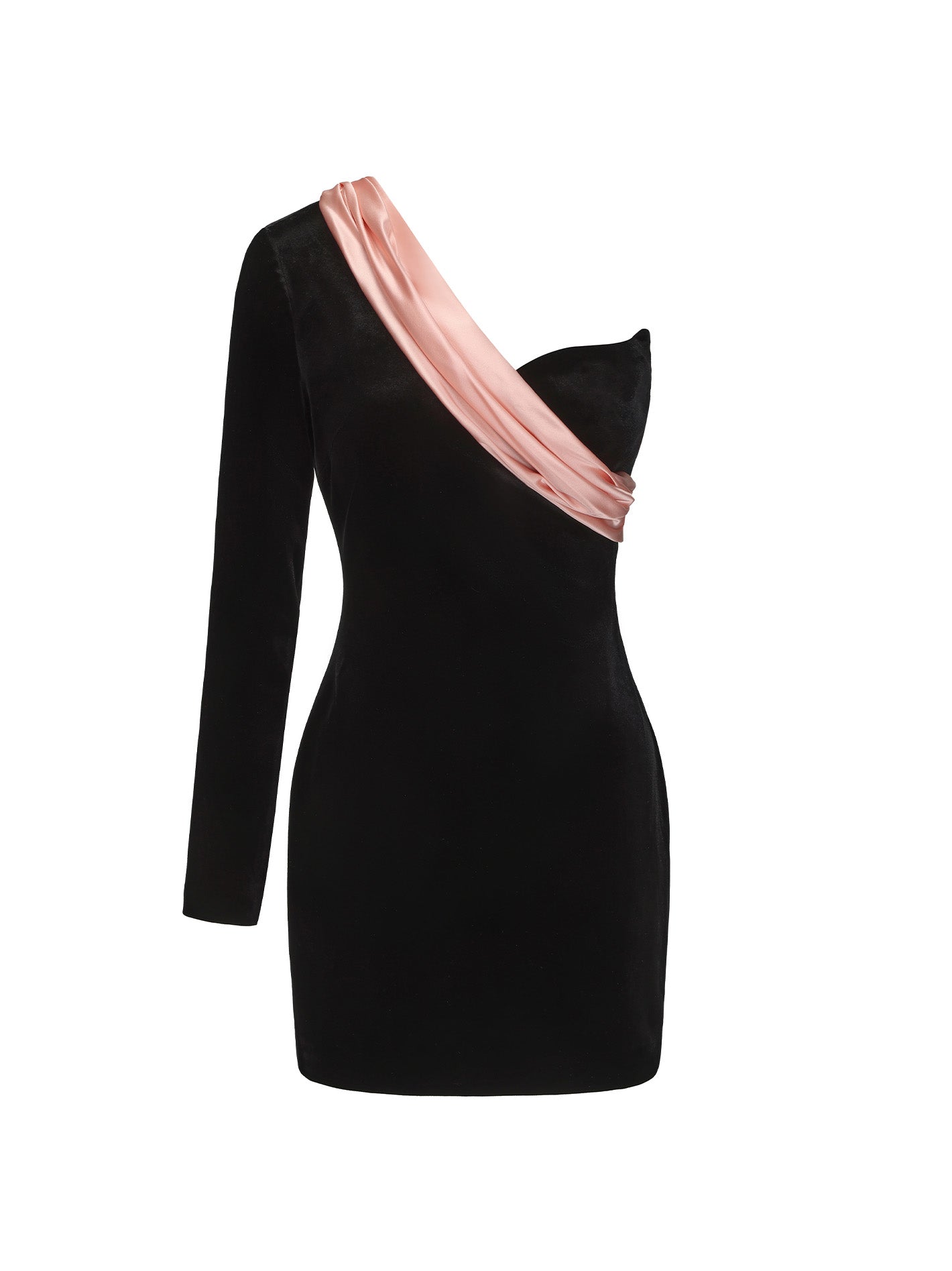 The Marisa velvet dress is the perfect balance of elegance and allure, crafted from stretch velvet for a luxurious, body-hugging fit. Its one-shoulder design features a non-slip strap for a secure and comfortable wear, while the cat-eye upturned bust adds a bold, structured touch. The smocked, satin shoulder collar enhances the asymmetrical neckline, bringing a unique texture contrast. With a waisted fit and an invisible side zipper for a seamless look, the dress is lined with a diamond-embellished logo for a subtle touch of glamour.
