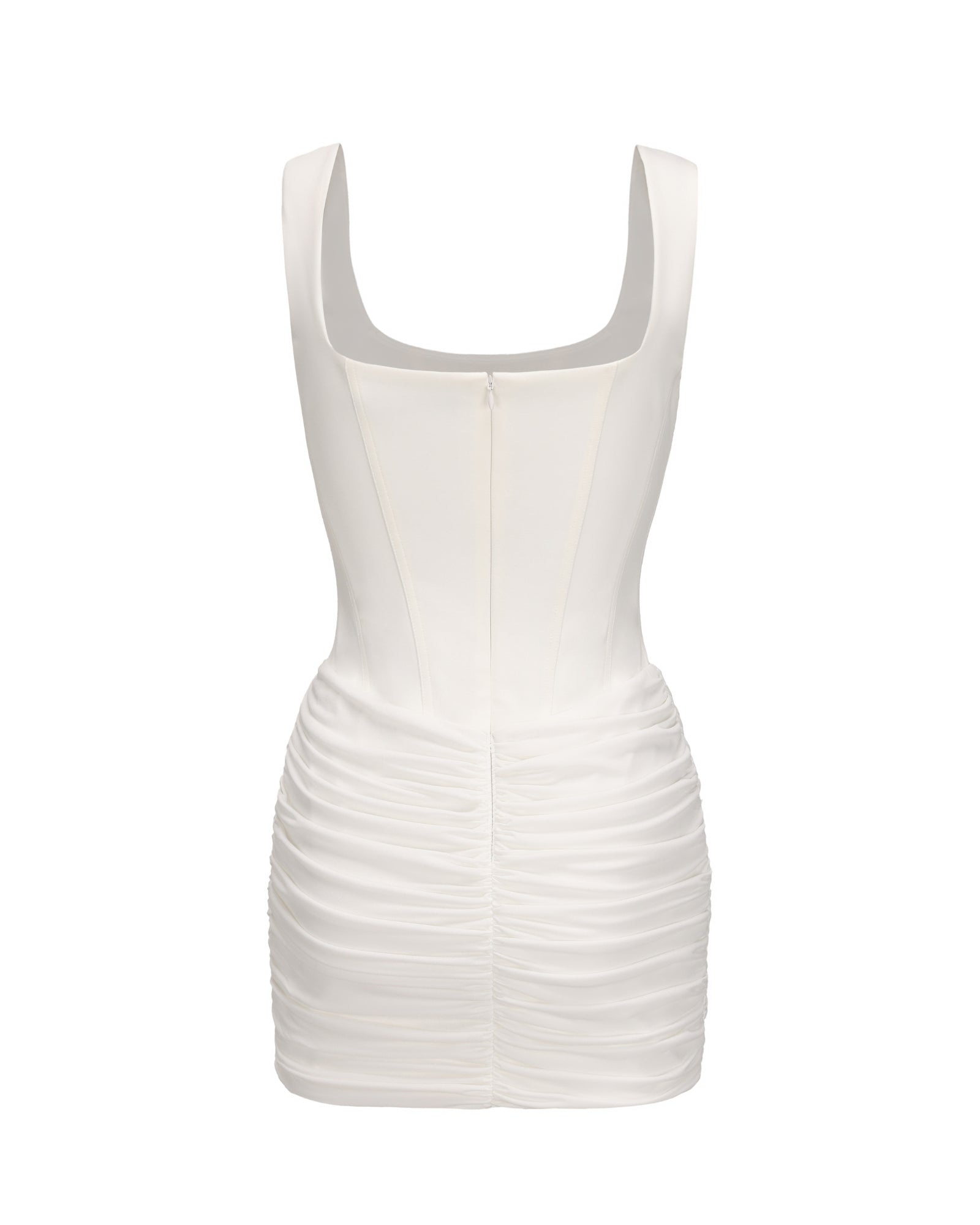 The Mirella Dress is a stunning piece that accentuates your natural curves with elegance. Crafted from soft white stretch-fabric, it offers a comfortable, flexible fit that moves with your body. The fishbone-inspired side support creates a flattering, three-dimensional silhouette, while the front’s cross-shirring design extends the visual lines, adding depth and grace. The result is a perfect balance of sophistication and understated luxury, ideal for any special occasion.