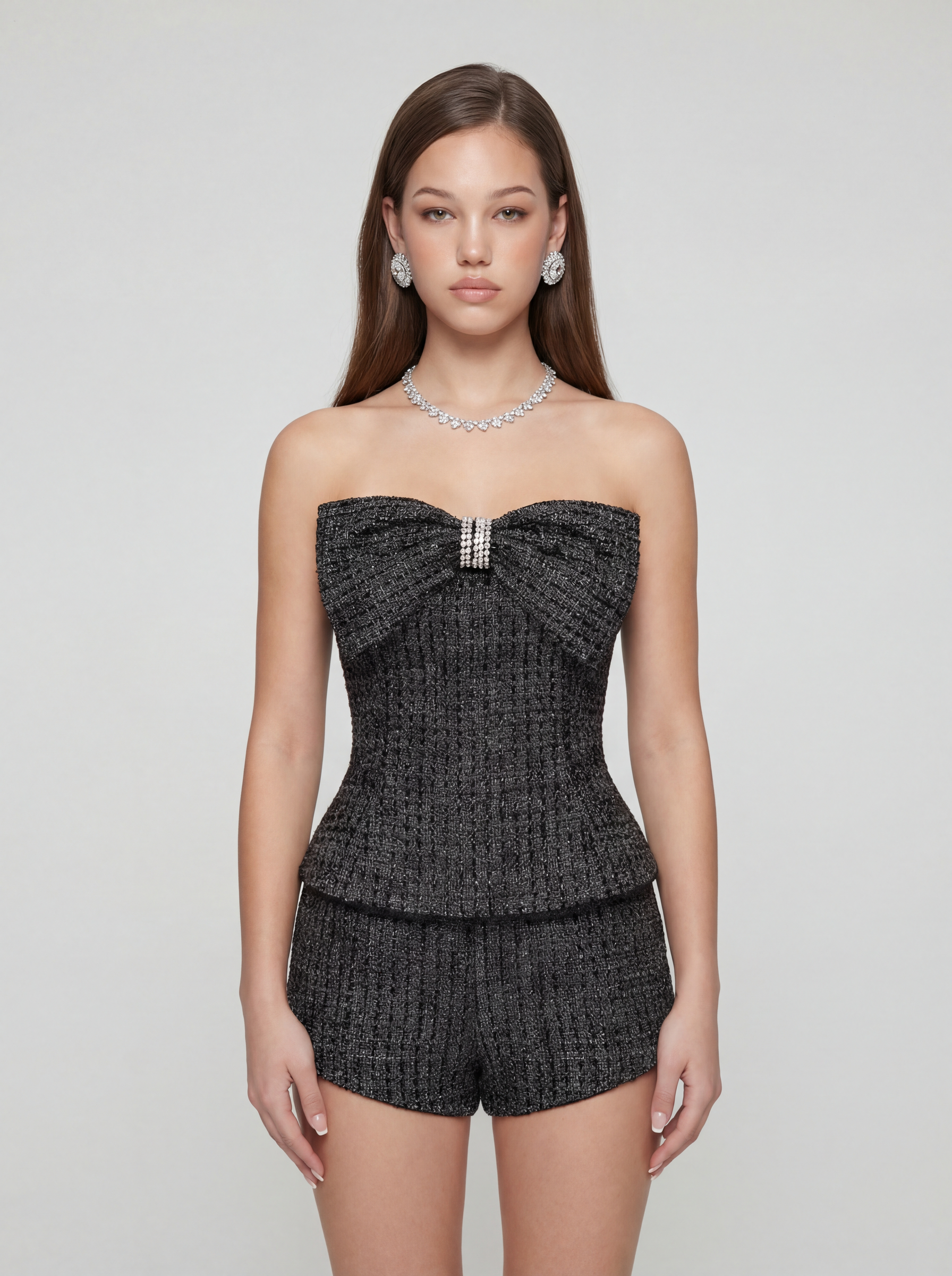 The Renée Strapless Bow Top blends feminine sculpting with couture charm. A black and silver textured strapless top shaped with a refined slim waist and a shimmering rhinestone bow that catches every glimmer of evening light. Designed to feel romantic yet structured, destined for an elevated evening outfit.