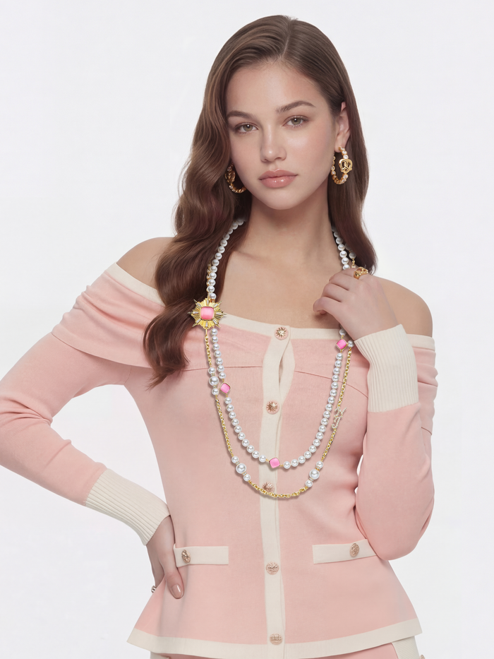"title":"Colette Off-Shoulder Contrast Knit Pink Top",
