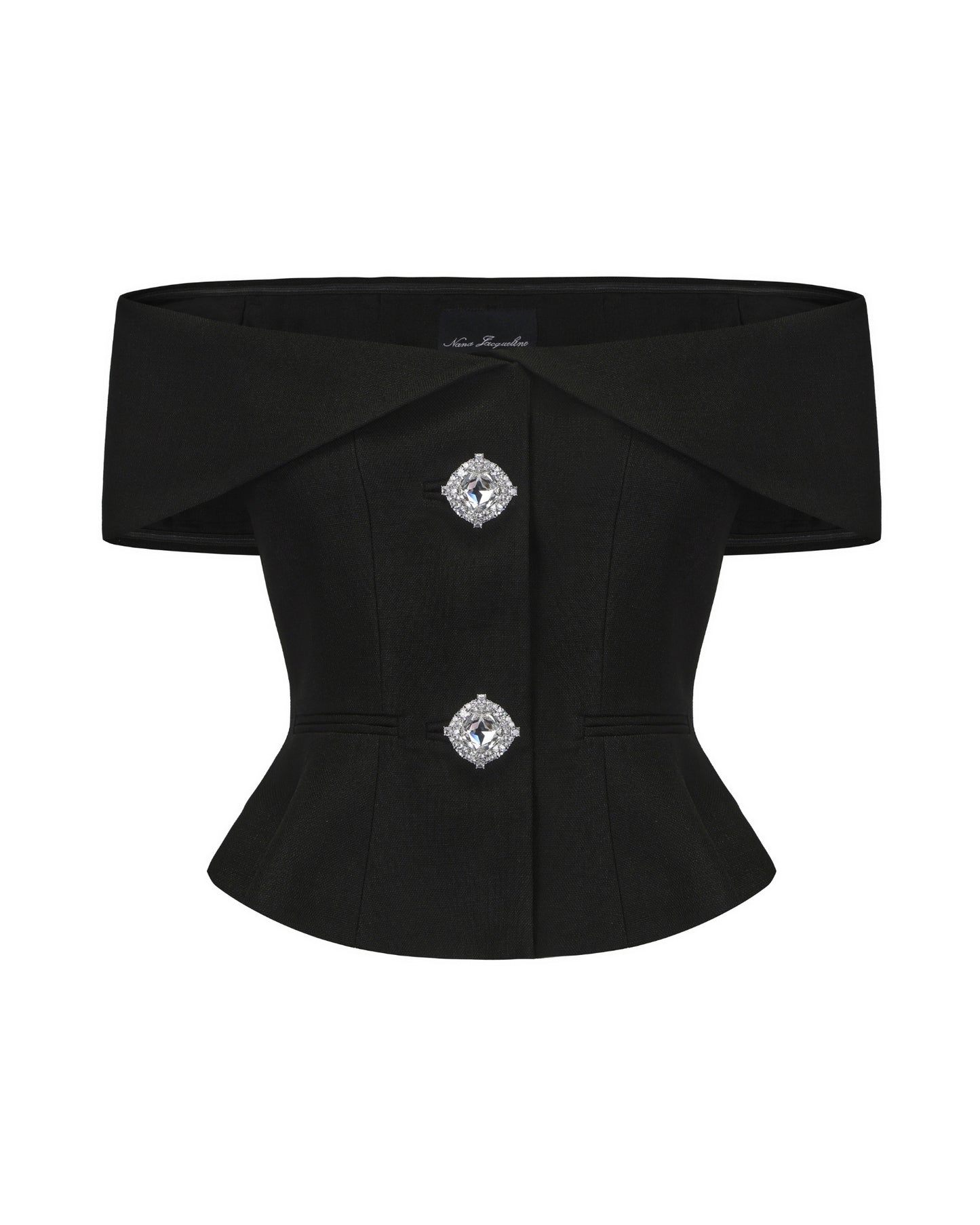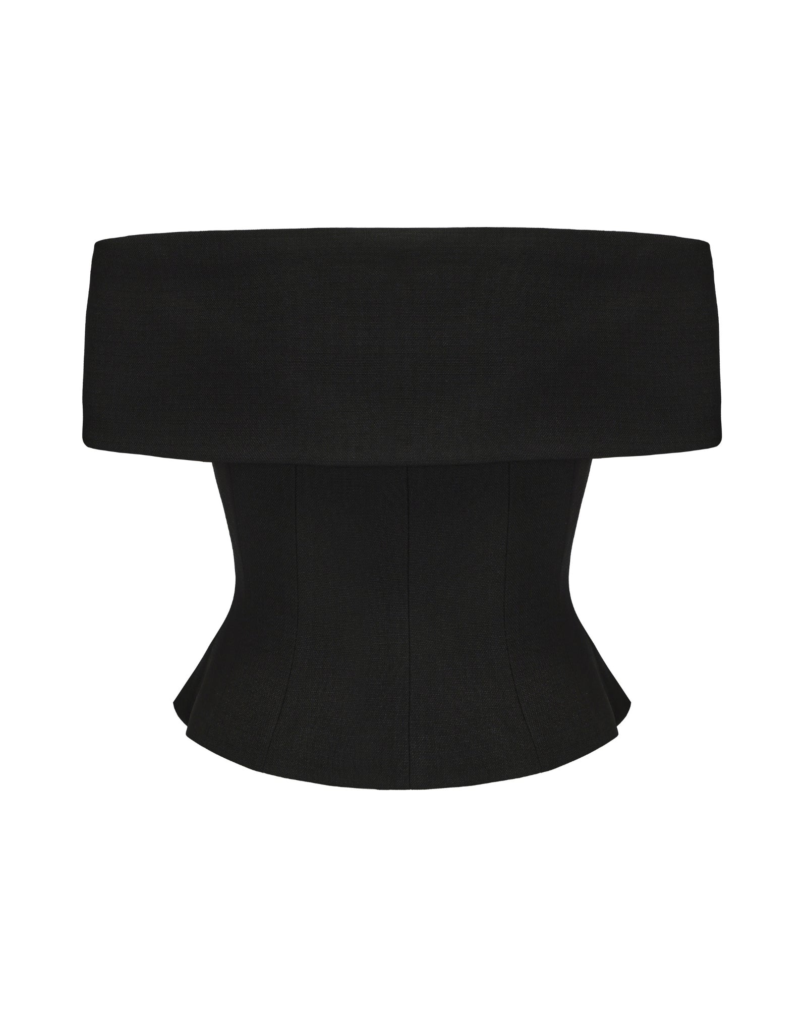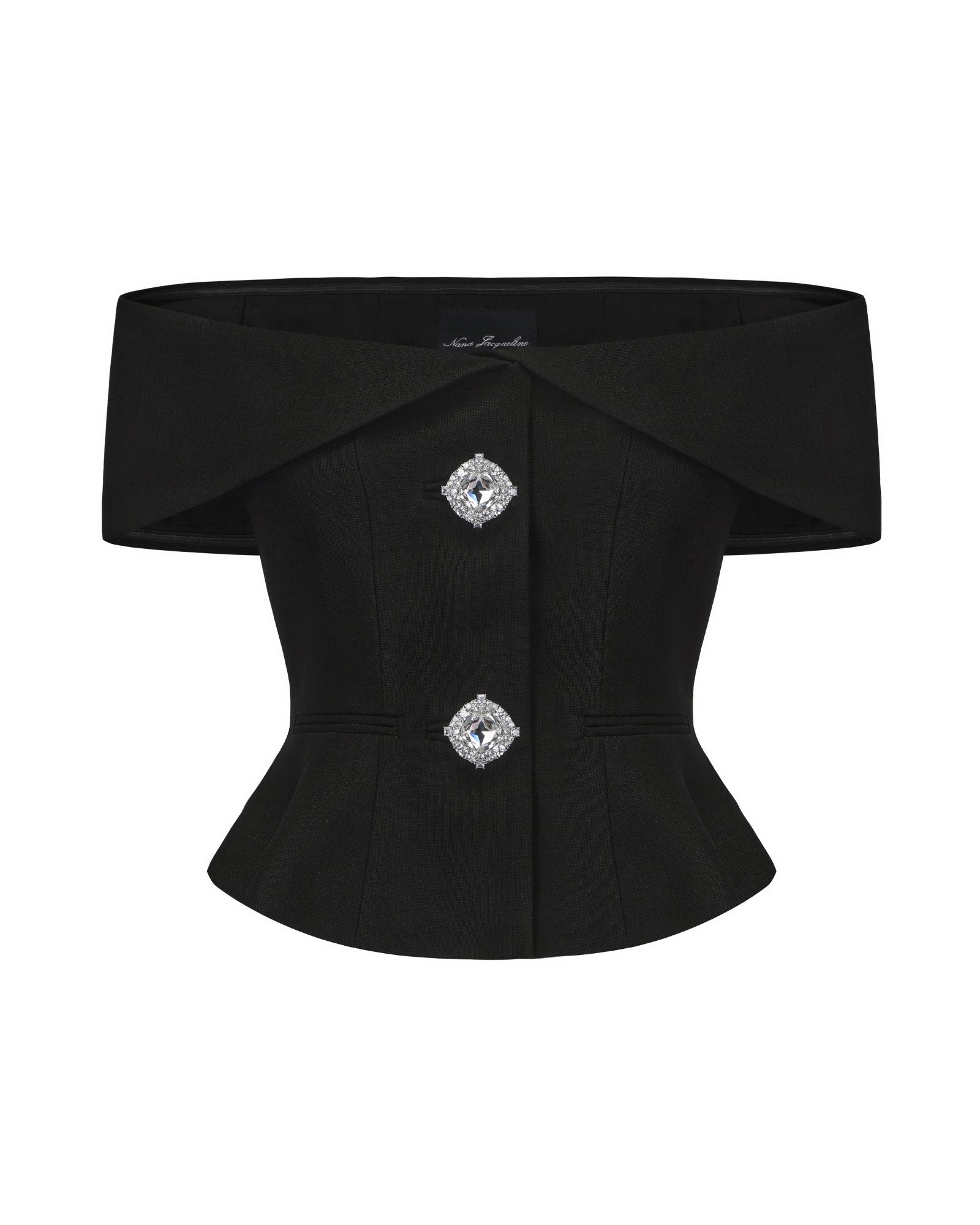 Fit: Fitted off-shoulder blazer top with sculpted seams and a gentle flared peplum hem.