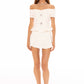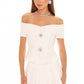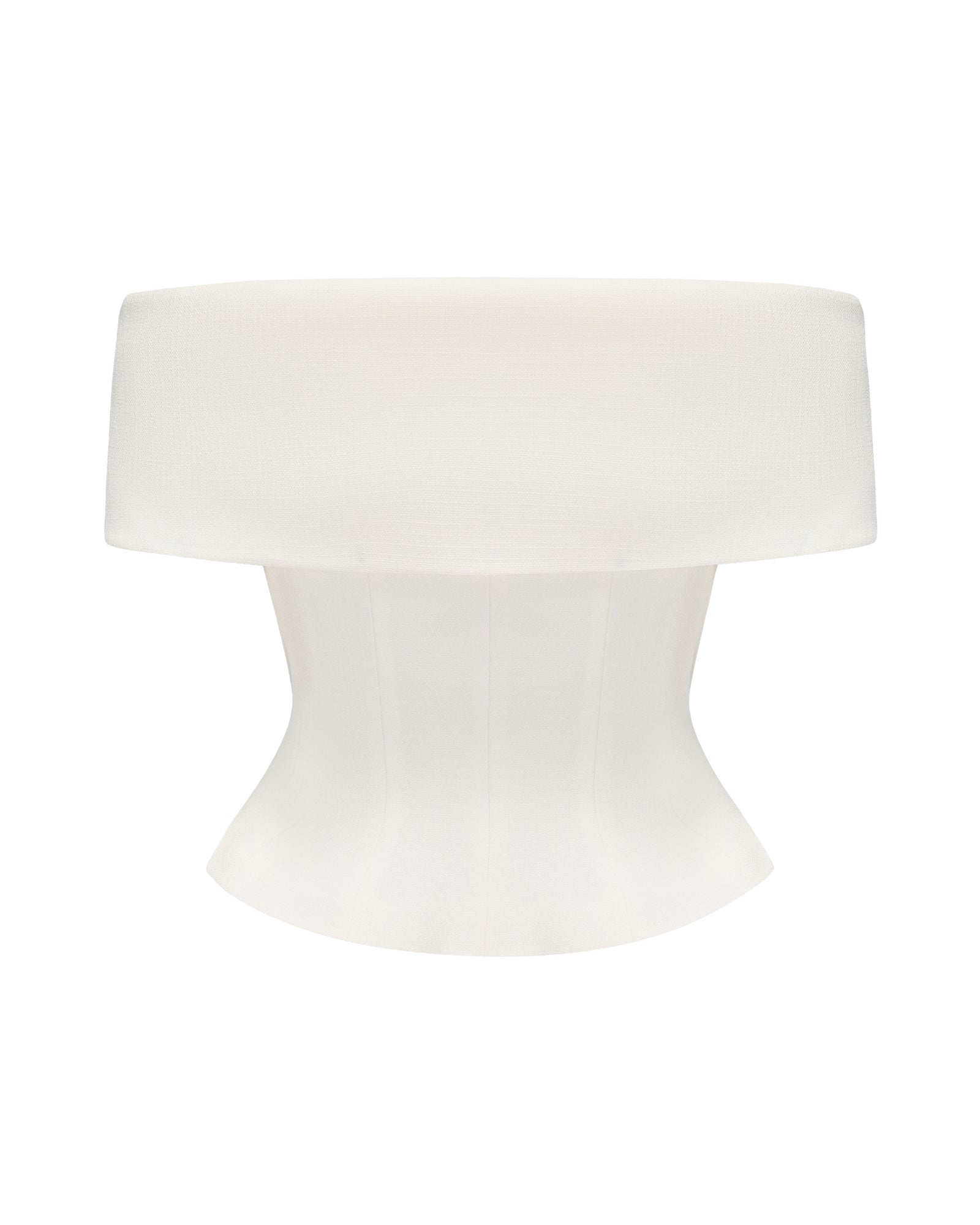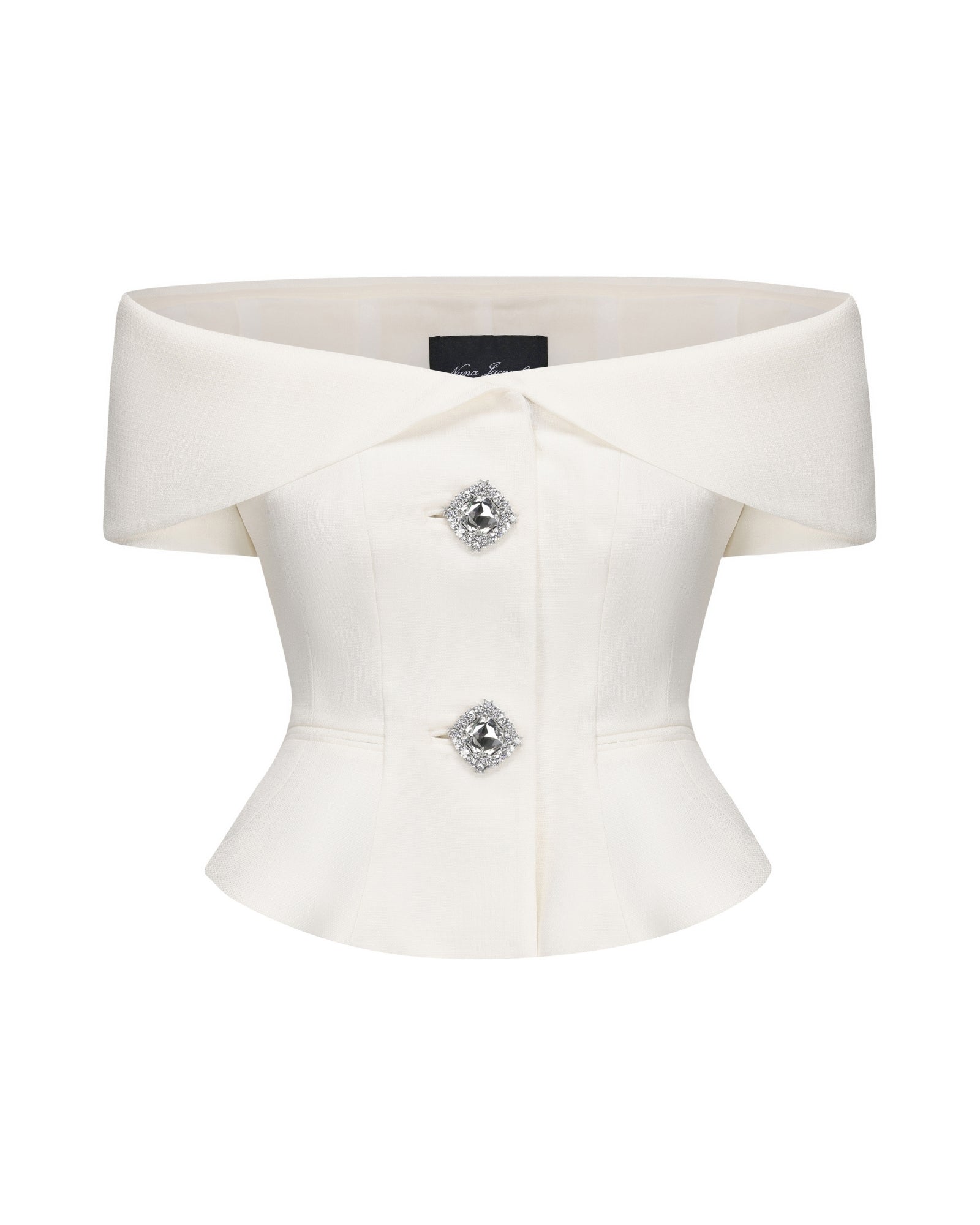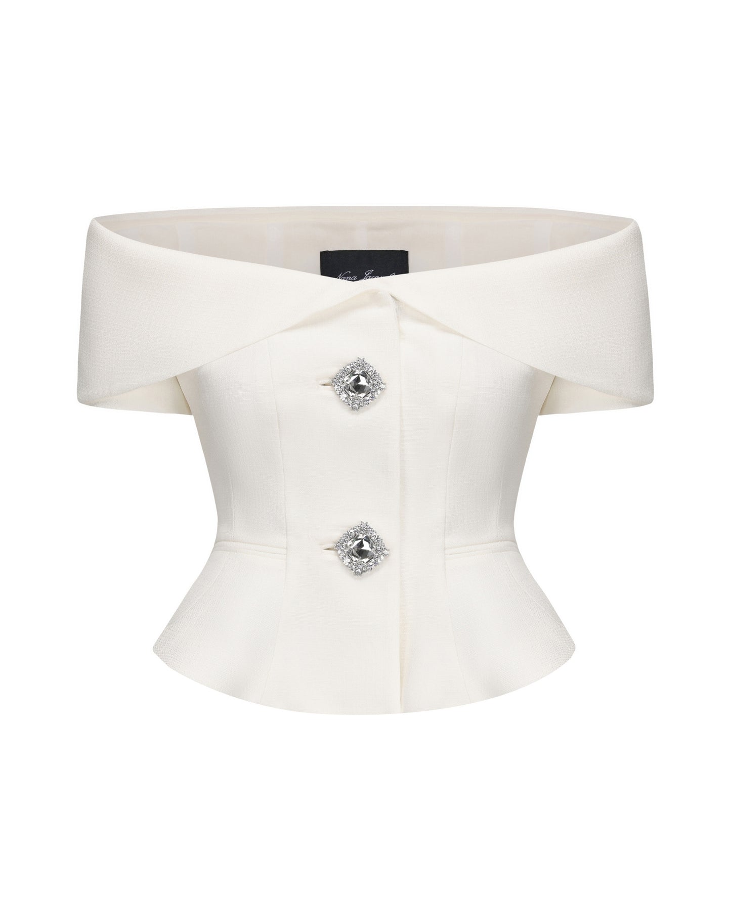 Fit: Fitted off-shoulder blazer top with sculpted seams and a gentle flared peplum hem.