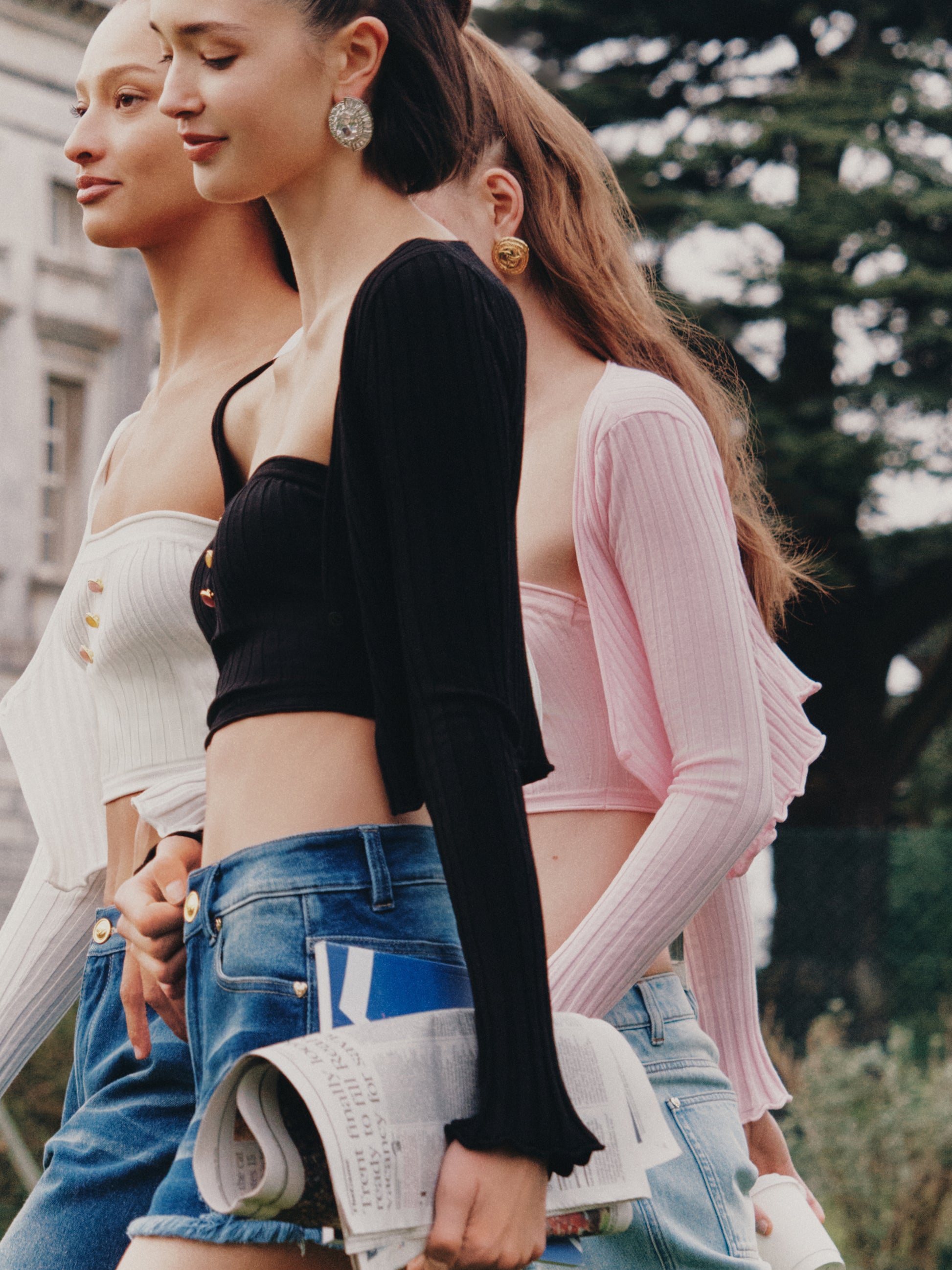 The focus here is proportion and texture. We love the cropped length bringing clarity to the silhouette. The ribbed knit adds quiet structure, and rolled edges soften the finish—allowing the cardigan to move easily while maintaining its shape.