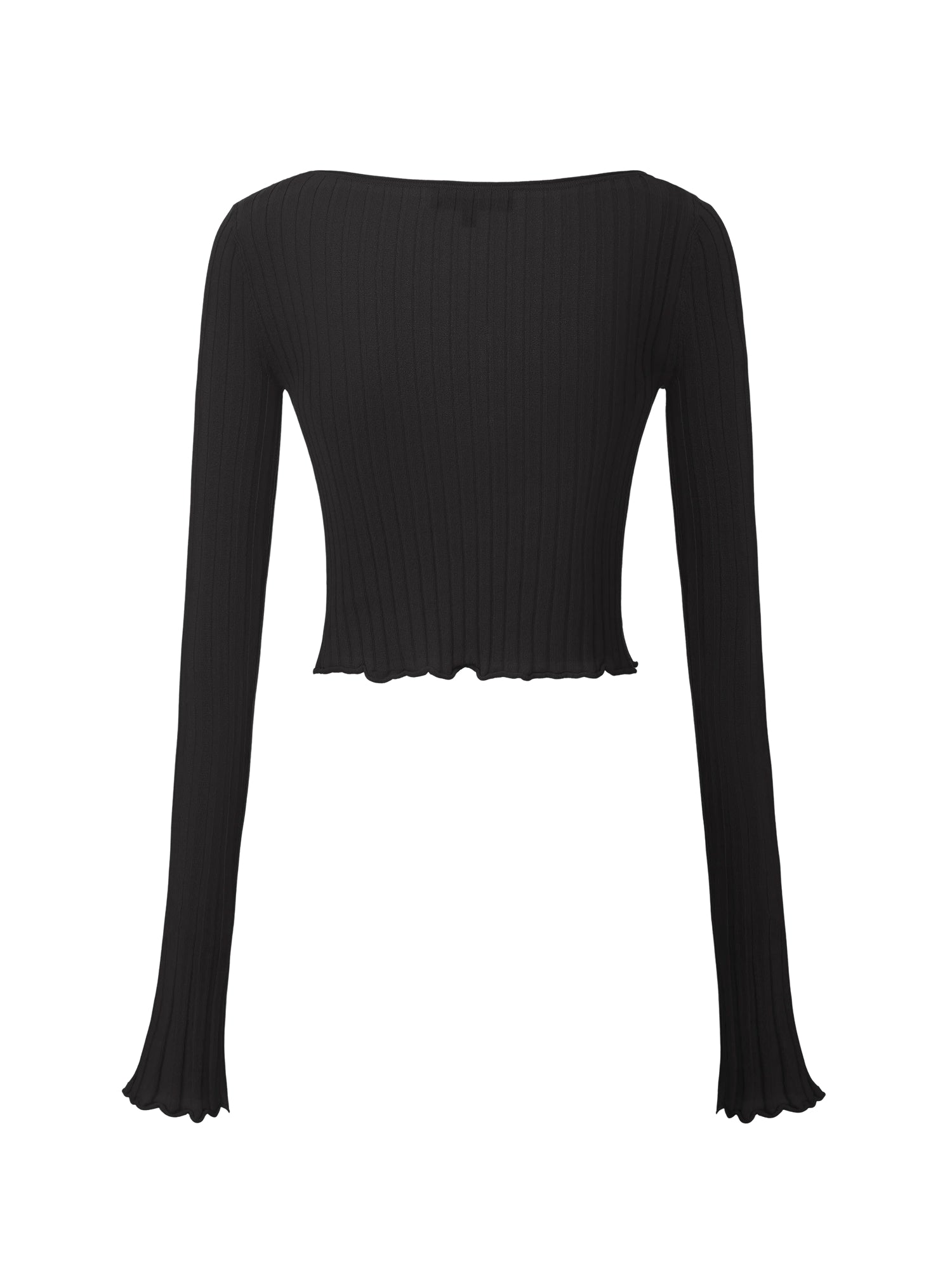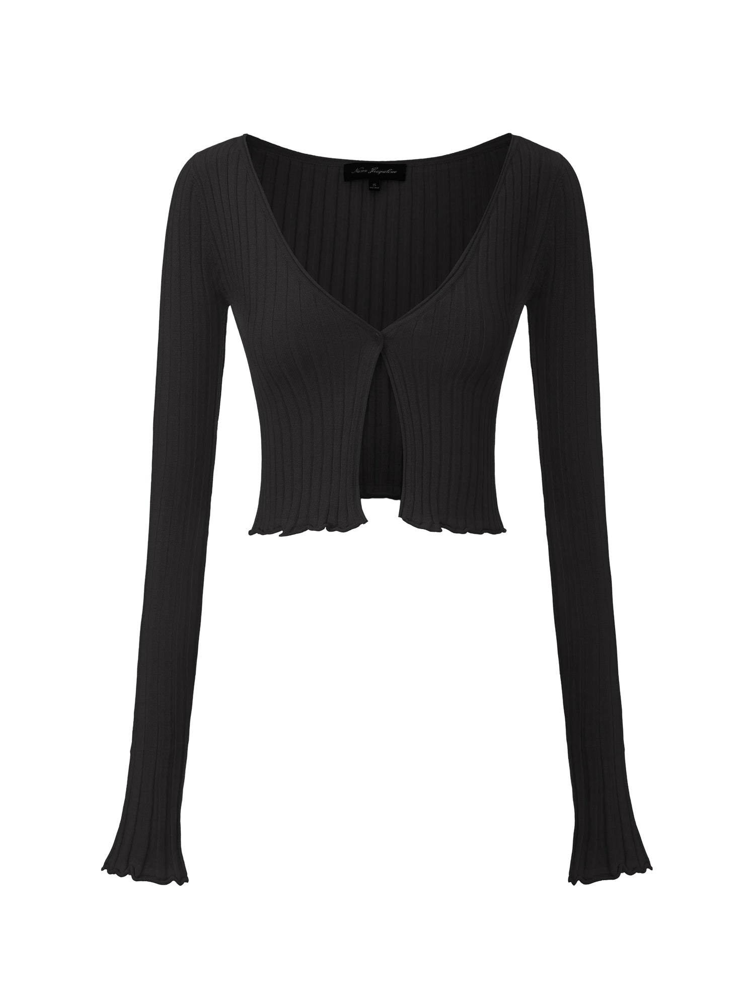 The Jane Cardigan in black feels sleek, modern, and quietly expressive. The cropped silhouette sharpens proportion, while ribbed knit texture shapes the body with subtle definition. Softly rolled edges and a single tonal button keep the finish relaxed and refined.