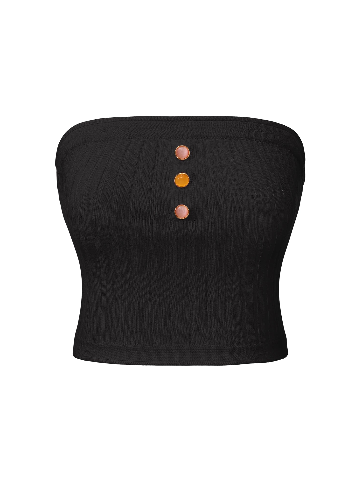 The Tessa Tube Top in black feels sleek, confident, and quietly alluring. The strapless silhouette opens the shoulders, while the fitted knit contours smoothly through the waist. Three gemstone buttons at the front catch the light, adding a refined vintage accent to the clean, modern line.