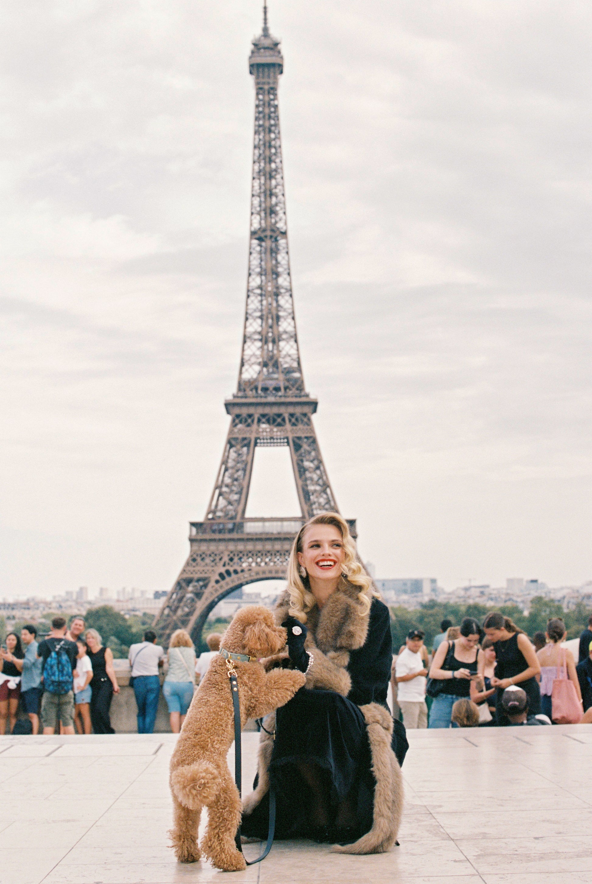 • Collar: Oversized faux fur collar adds vintage Parisian elegance.