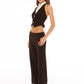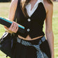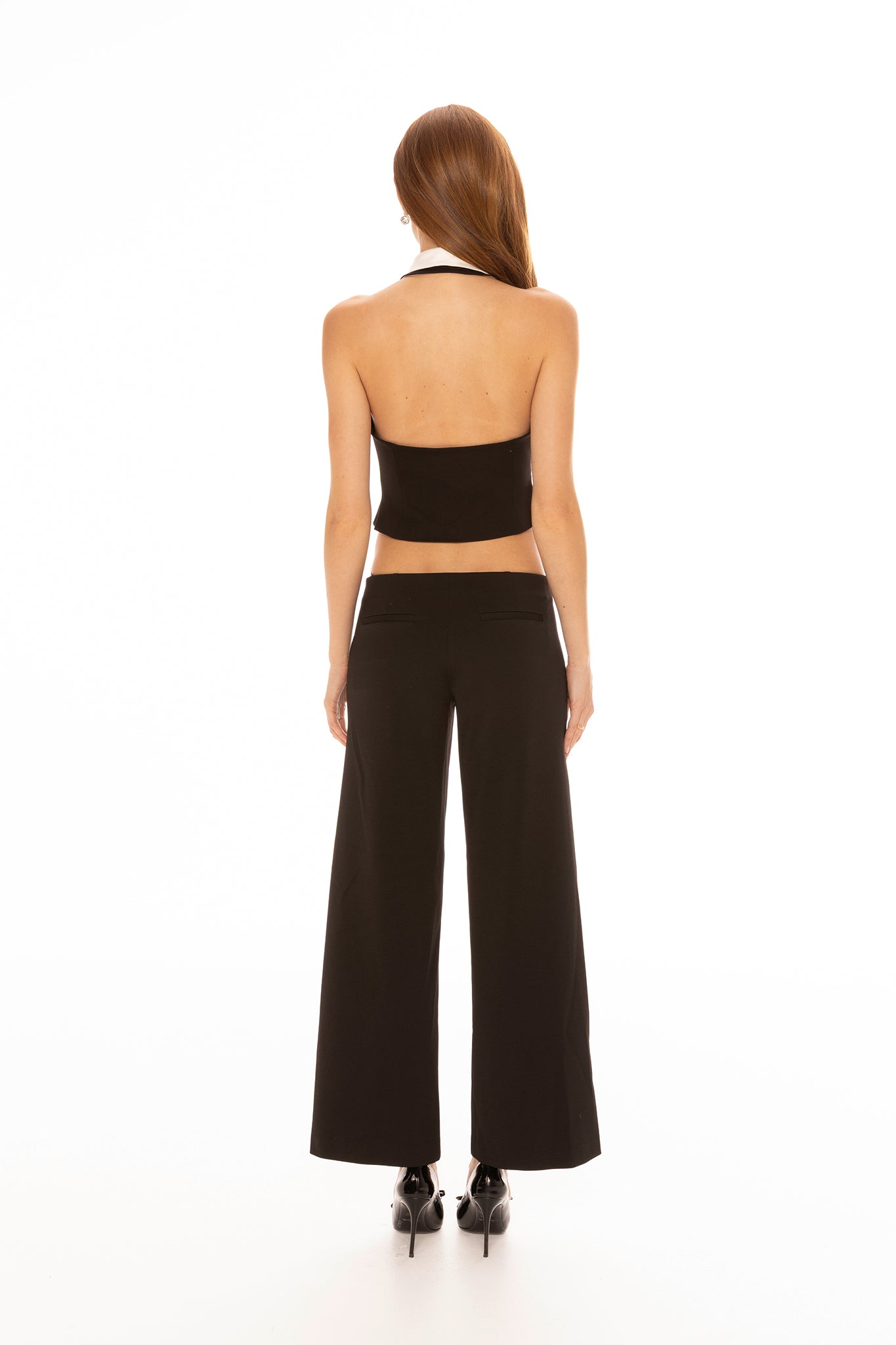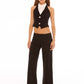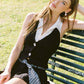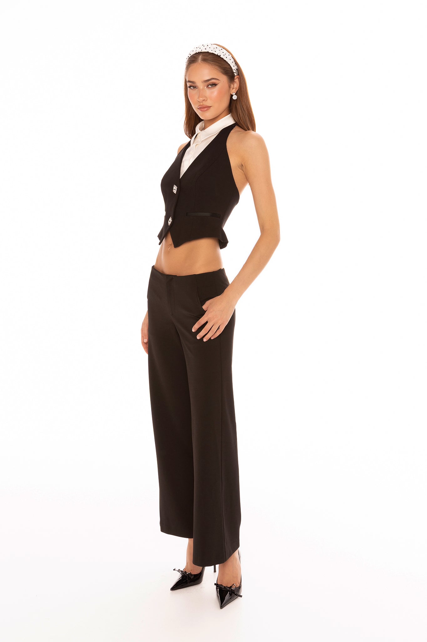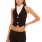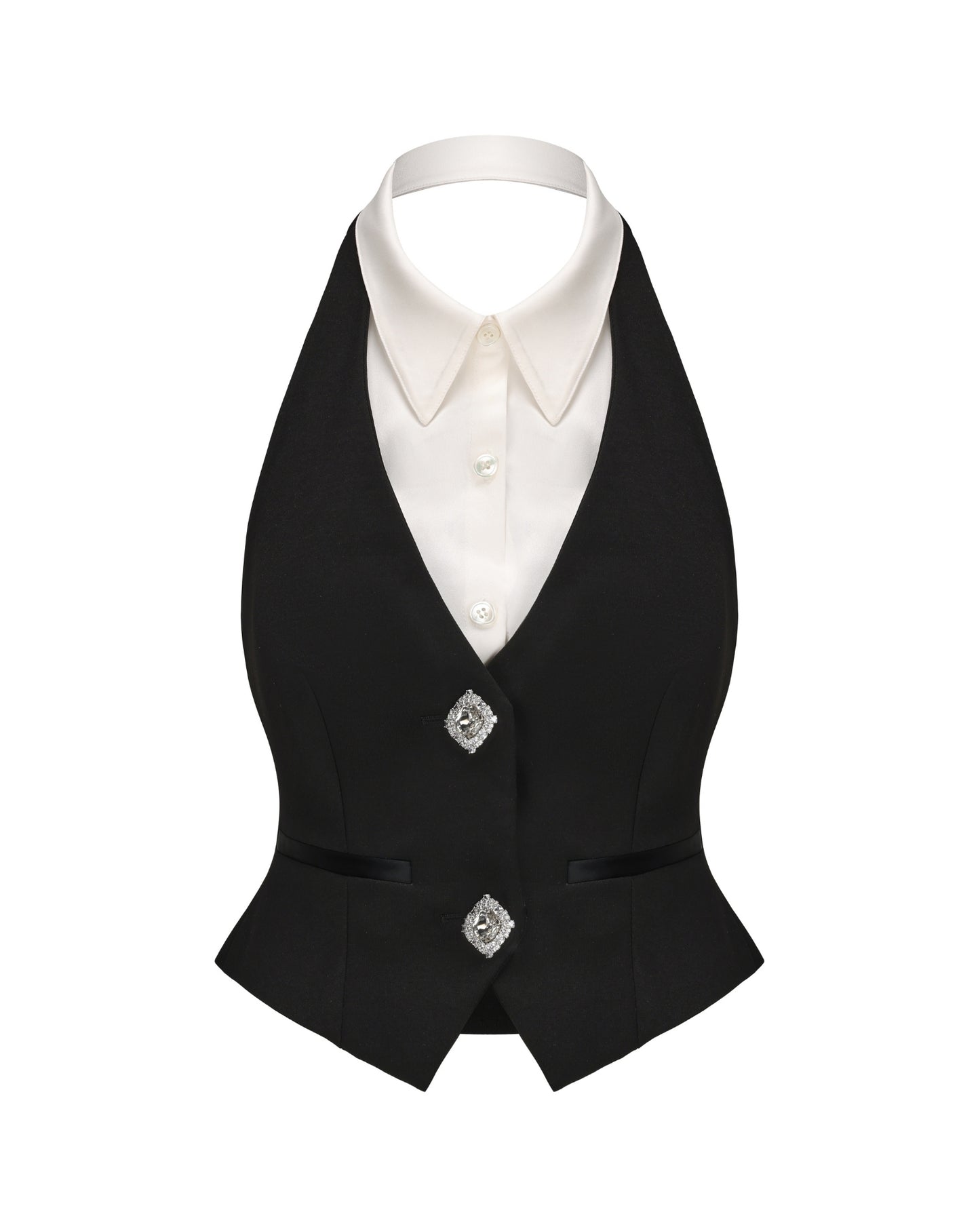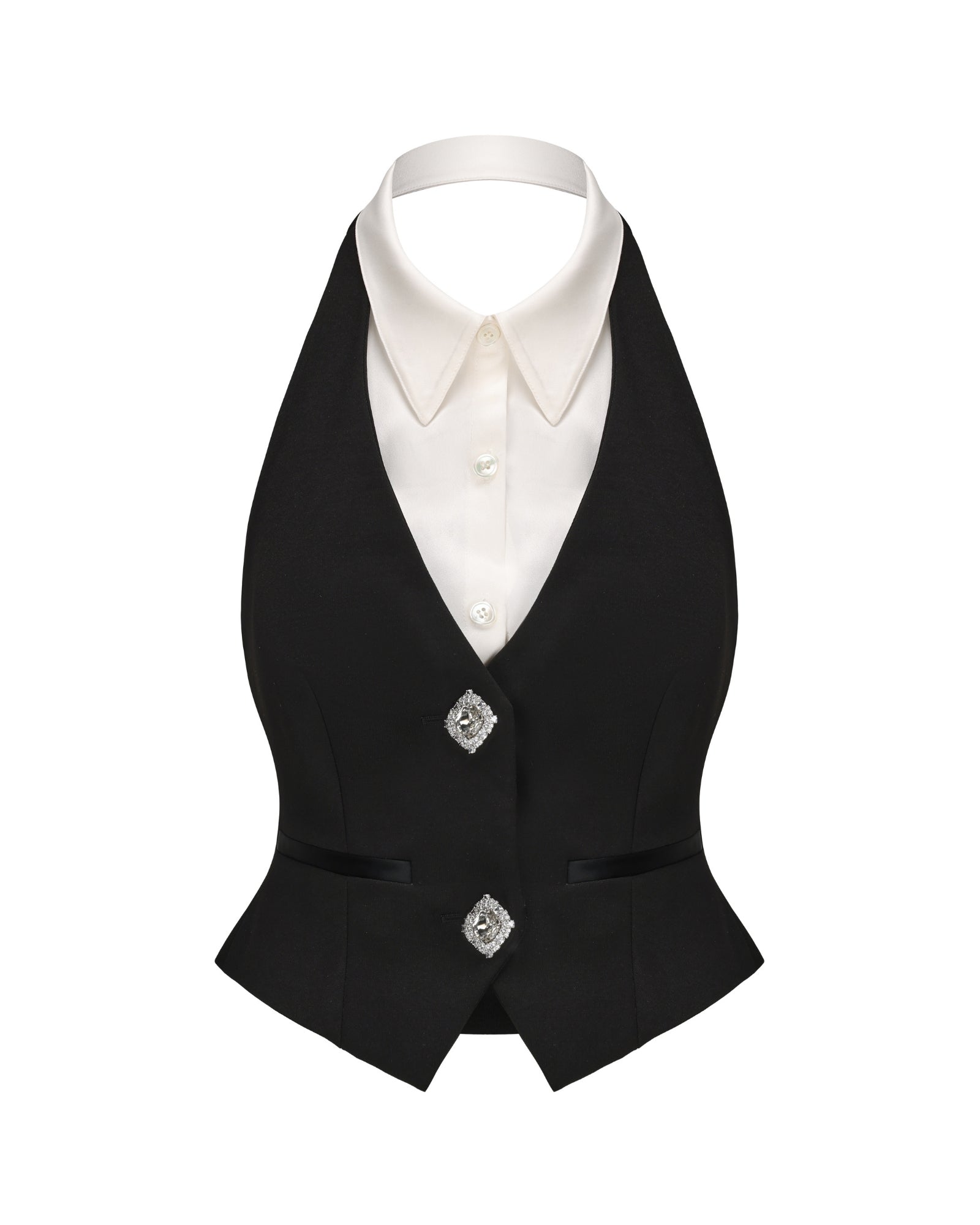 The Anya Vest Top blends structure and sparkle in a refined silhouette. Designed in a black-and-white two-piece illusion, this halter neck vest top features a satin-trimmed collar, sparkling zircon buttons, and a fitted waist with a soft flare at the hem. It’s a modern take on coquette tailoring—polished, playful, and feminine.