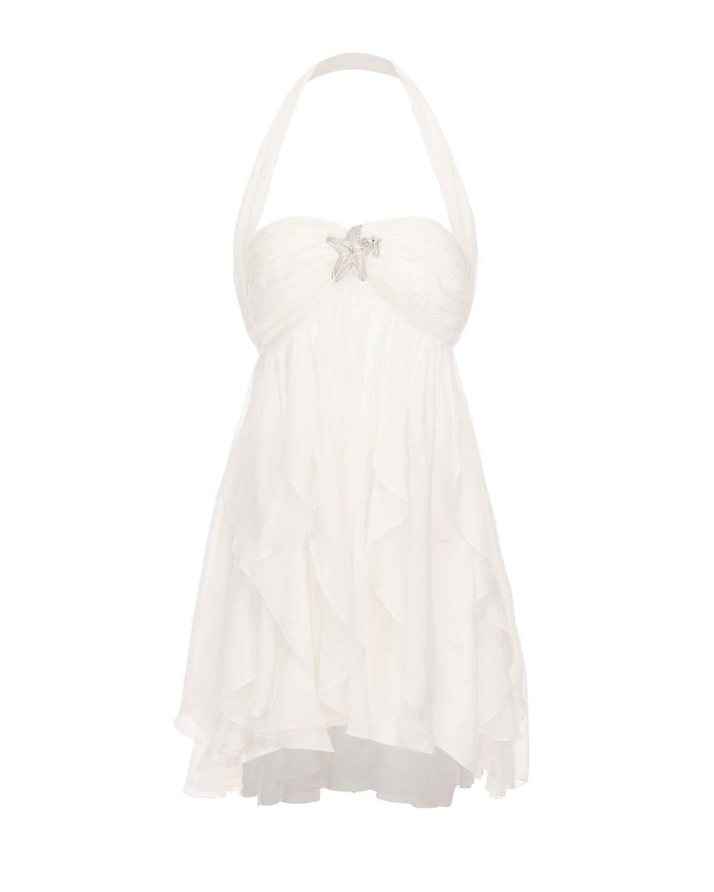 Elevate your style with Arabella Dress, featuring an inverted halter neck, ruched chest with a removable starfish brooch, and a slitted double-layered hem for effortless elegance. A hidden back closure ensures a sleek fit, making it perfect for any occasion.