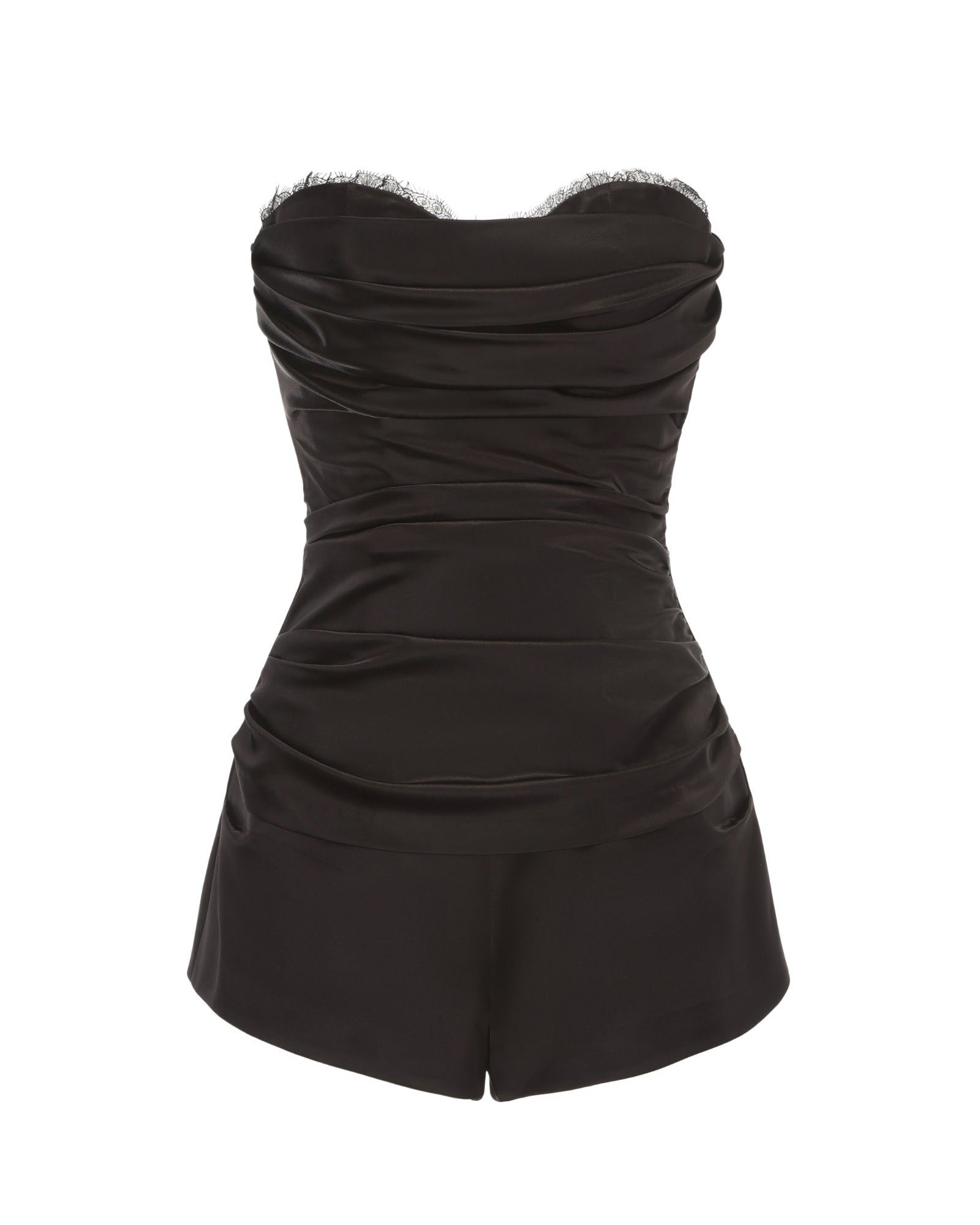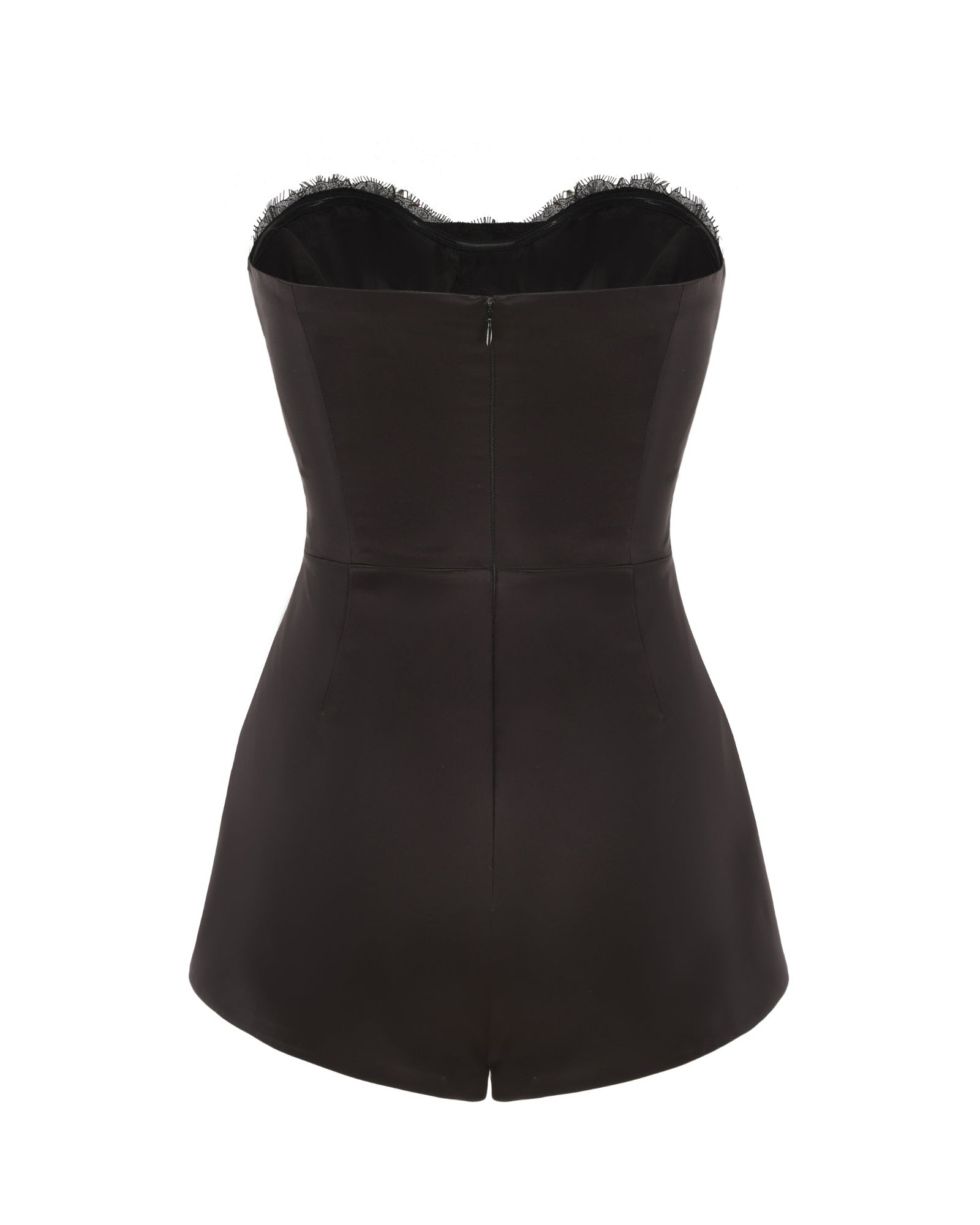 The Athena Jumpsuit is an elegant satin jumpsuit crafted from pearlescent black satin that glows with a subtle, luxurious luster. This strapless black jumpsuit beautifully highlights the shoulders and neck, with a delicate lace panel that adds a romantic and sophisticated softness. The pleated jumpsuit design creates a flattering faux two-piece look, while the side boning sculpts a neat and elegant silhouette.