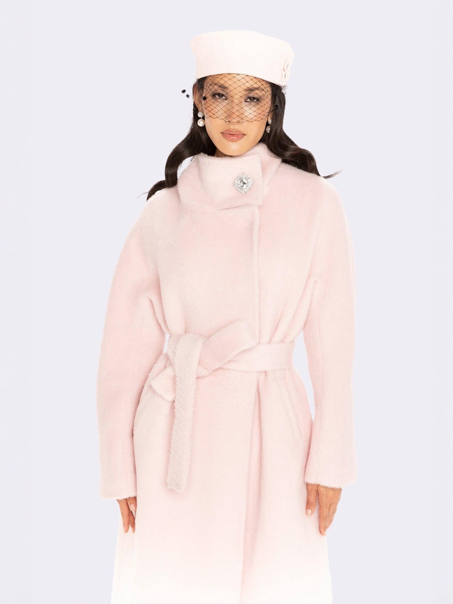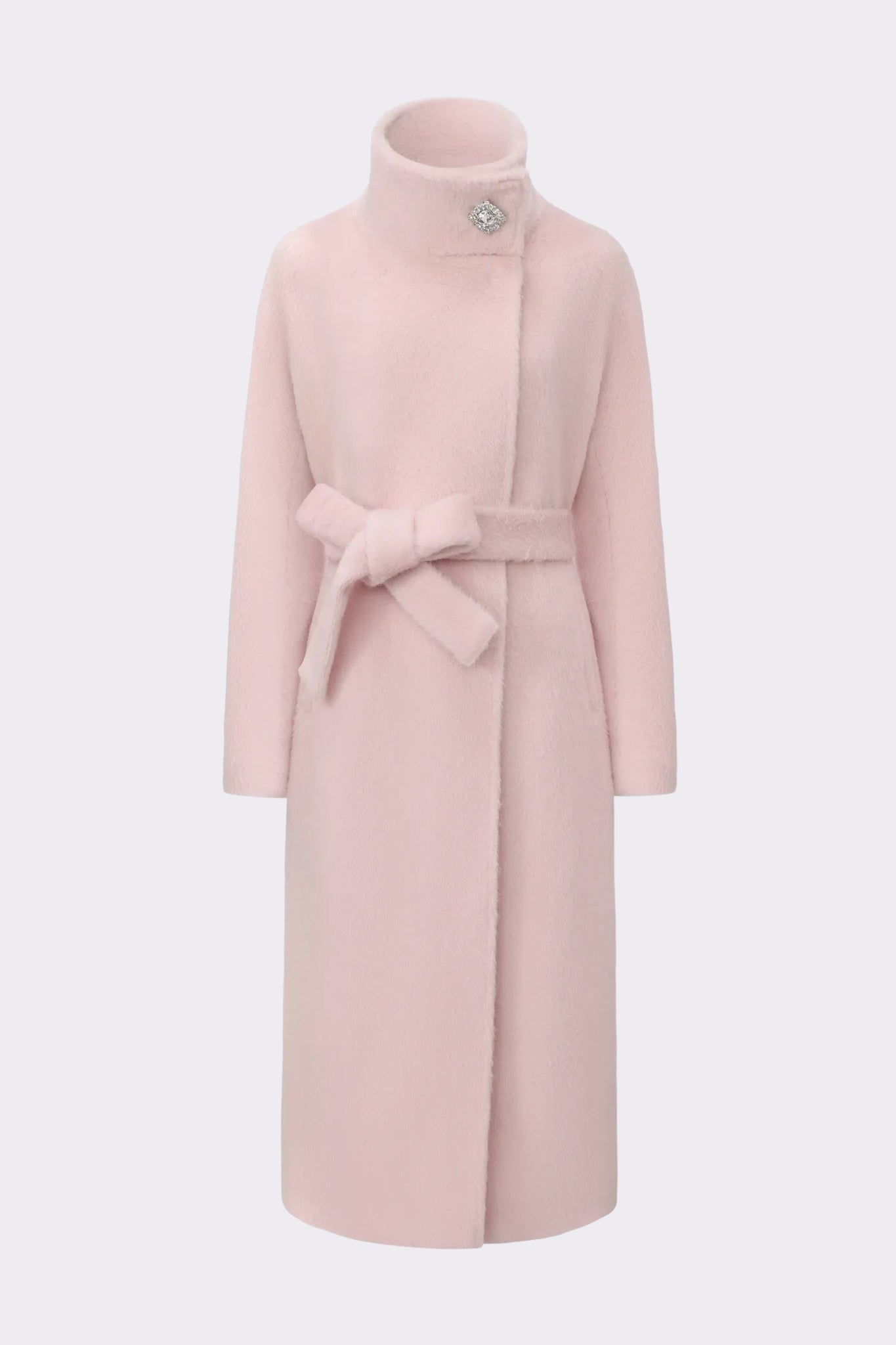 The Audrey Coat wraps you in timeless elegance, crafted from Suli Australian wool with a radiant sheen. The chic stand collar frames the neckline, while sparkling diamond buttons and a waist-tie bow add refined femininity. This long wool coat blends luxury outerwear with effortless winter romance.