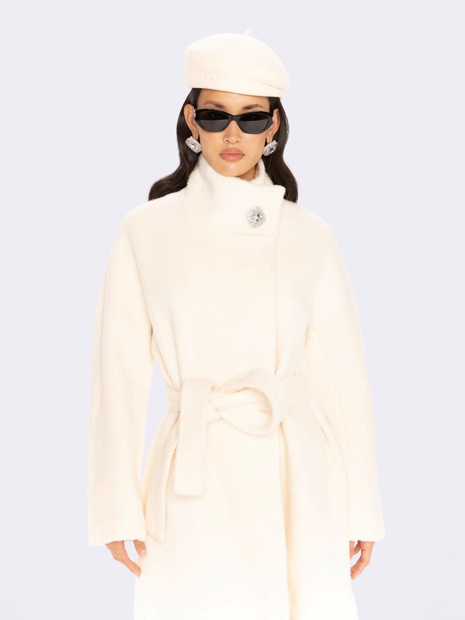 The Audrey Coat wraps you in timeless elegance, crafted from Suli Australian wool with a radiant sheen. The chic stand collar frames the neckline, while sparkling diamond buttons and a waist-tie bow add refined femininity. This long wool coat blends luxury outerwear with effortless winter romance.