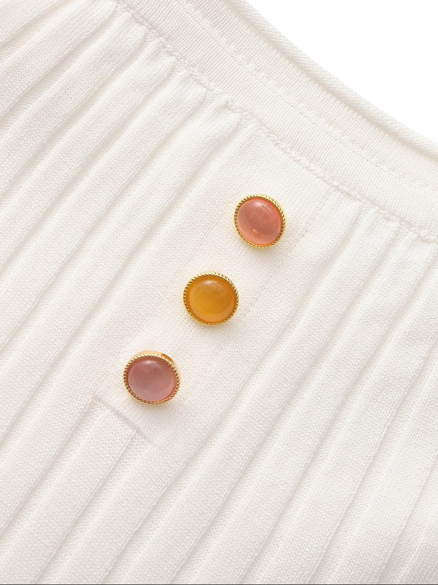 The Ava Dress is light, fluid, and softly expressive. The reverse halter neckline opens the shoulders and collarbone, while the knit flares gently into a flowing A-line skirt that moves with ease. Subtle detailing through the bodice and hem gives the dress dimension without overwhelming its clean silhouette. Three gemstone buttons add visual interest.
