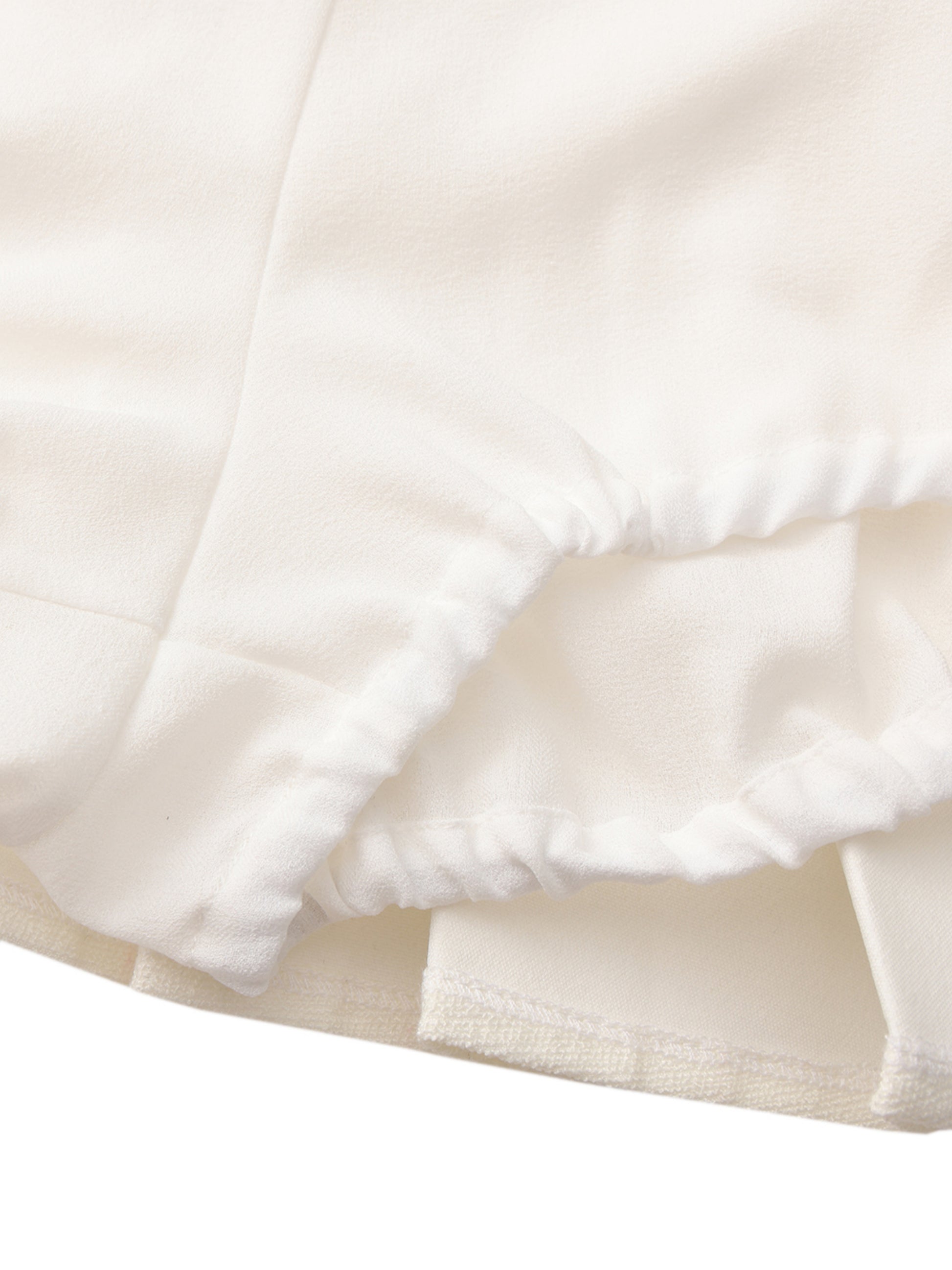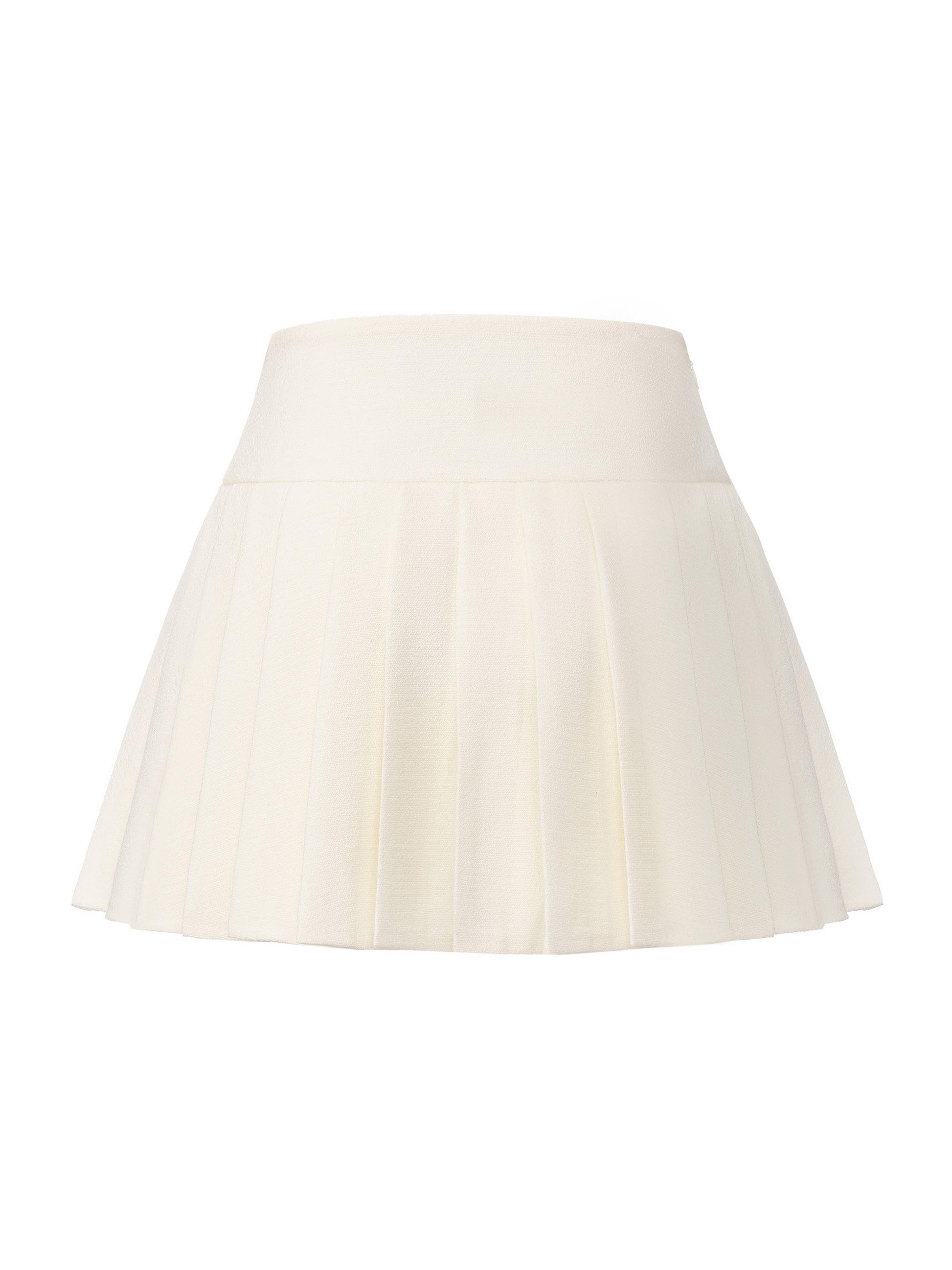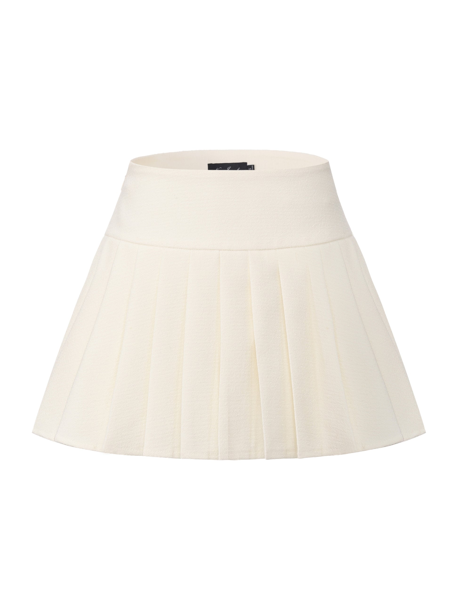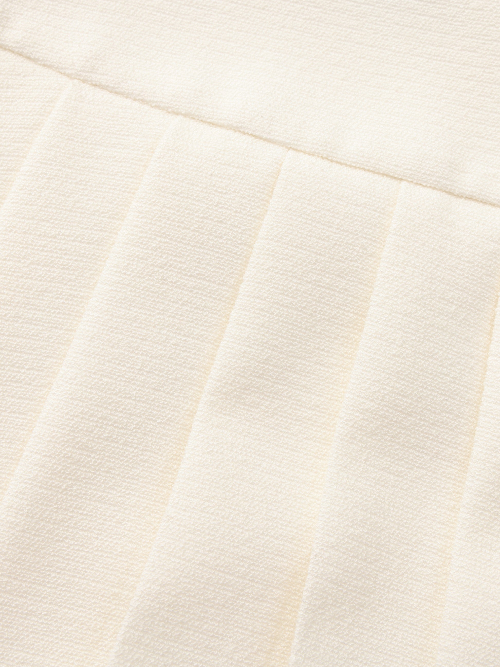 A refined textured suiting fabric gives the skirt its crisp structure and smooth finish. The weave holds the pleats neatly while keeping the white tone clean and luminous.