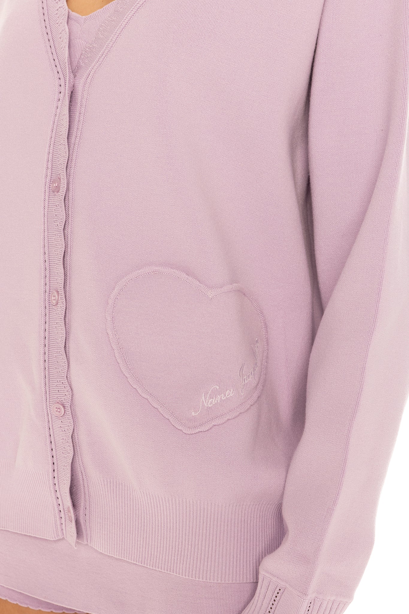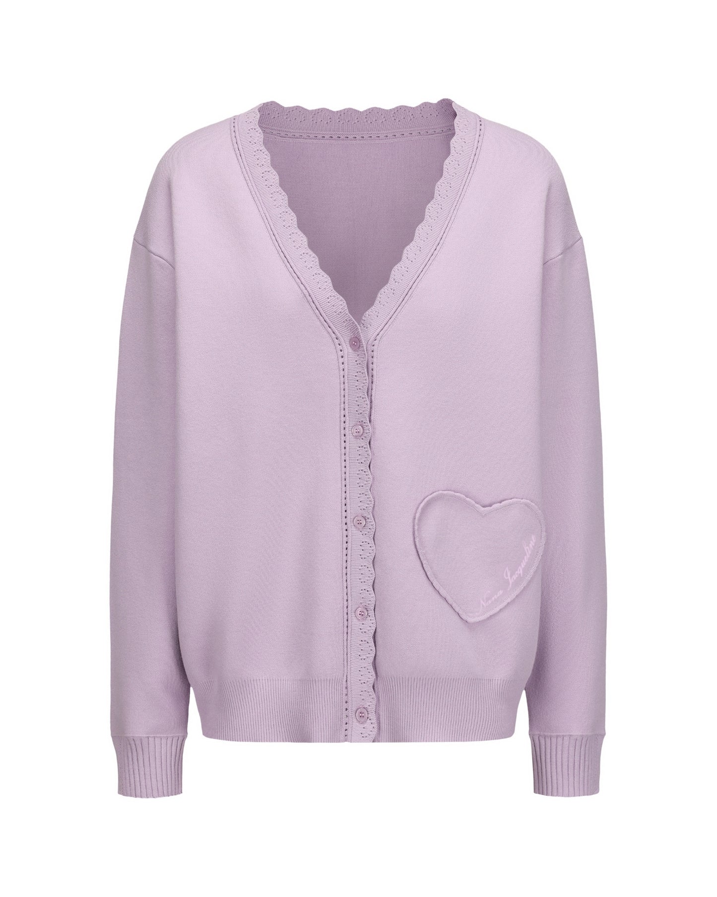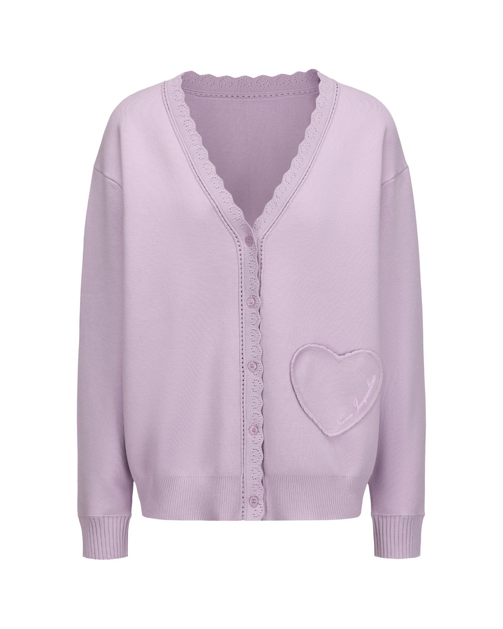 The Carrie Cardigan is a sweet and feminine cardigan made from soft, skin-friendly yarn with a relaxed silhouette. Heart-shaped lace details and tonal buttons bring romantic charm, while a heart-shaped patch pocket with embroidery adds playful elegance. This soft knit cardigan for women is perfect for both lounging at home and stepping out with grace.