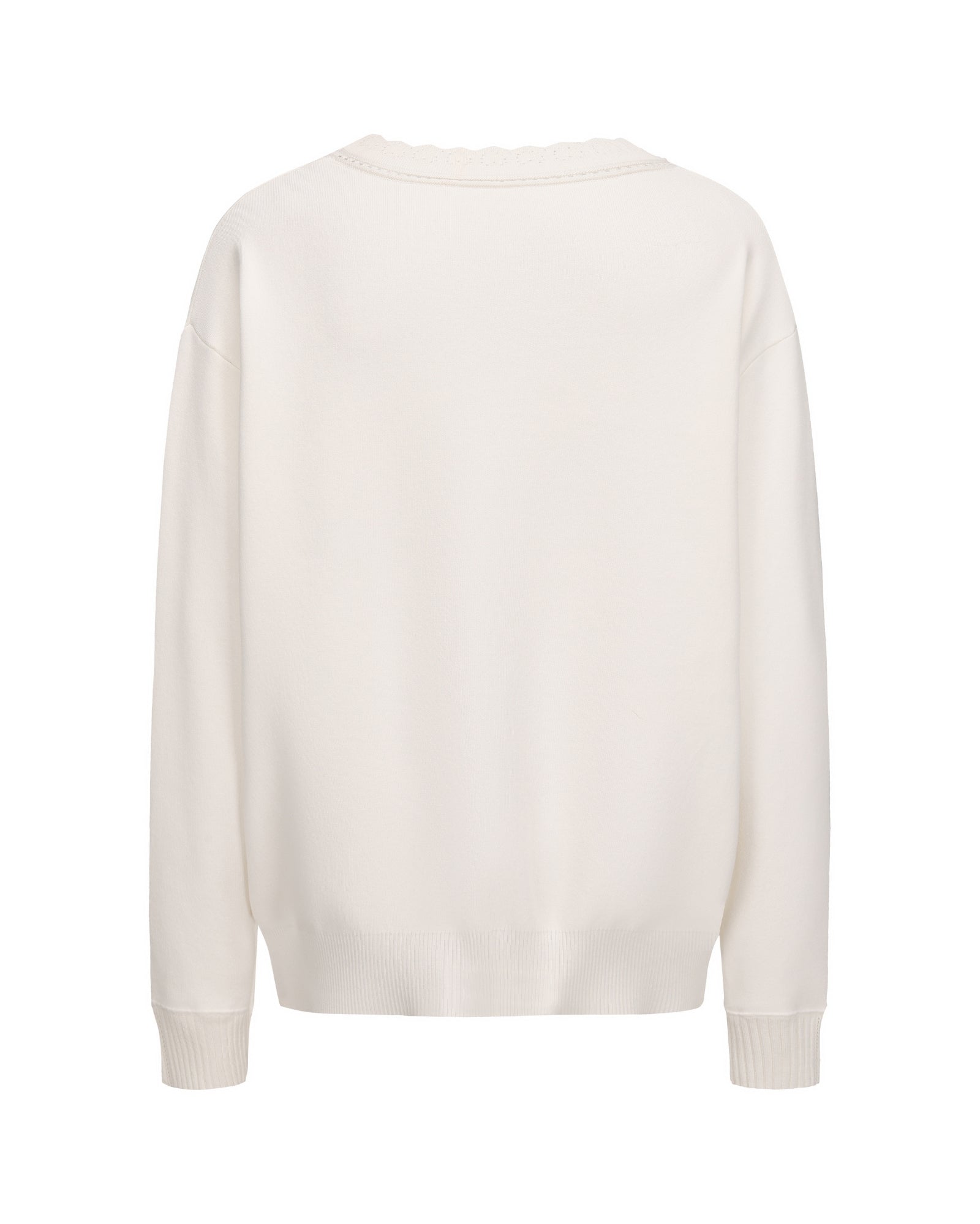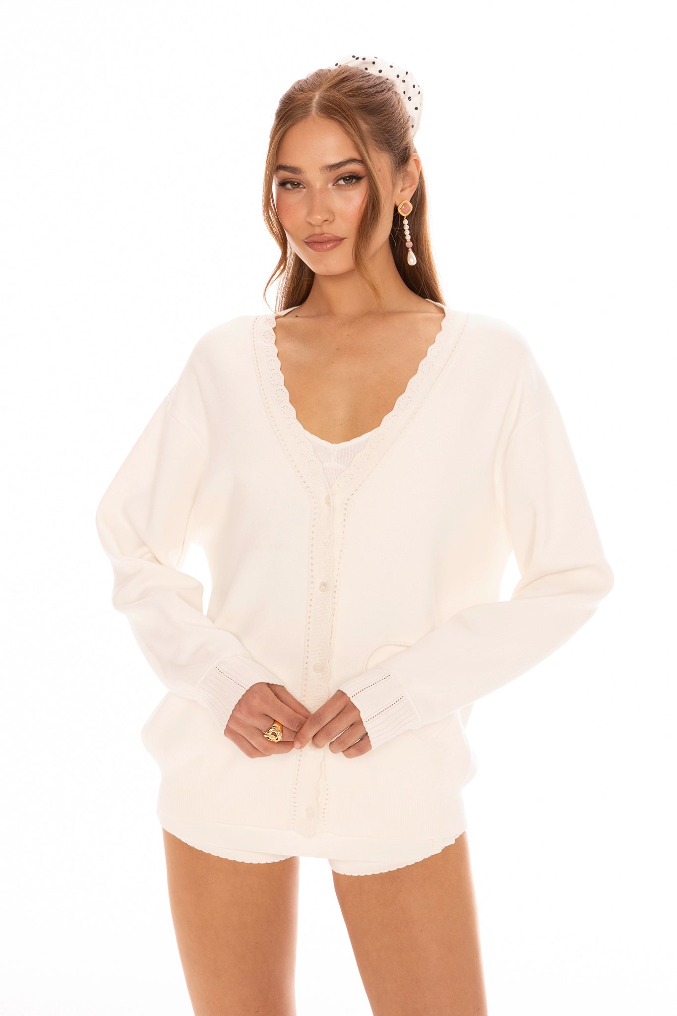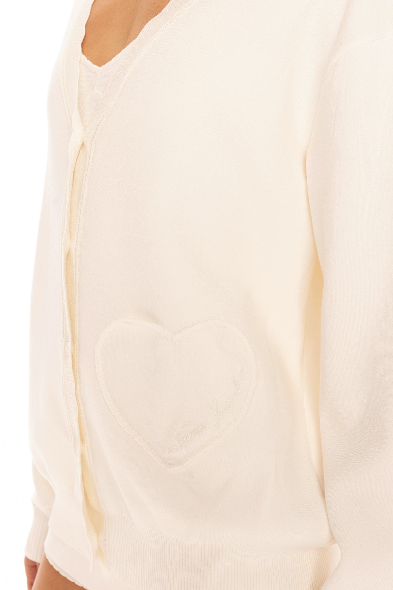 The Carrie Cardigan is a sweet and feminine cardigan made from soft, skin-friendly yarn with a relaxed silhouette. Heart-shaped lace details and tonal buttons bring romantic charm, while a heart-shaped patch pocket with embroidery adds playful elegance. This soft knit cardigan for women is perfect for both lounging at home and stepping out with grace.