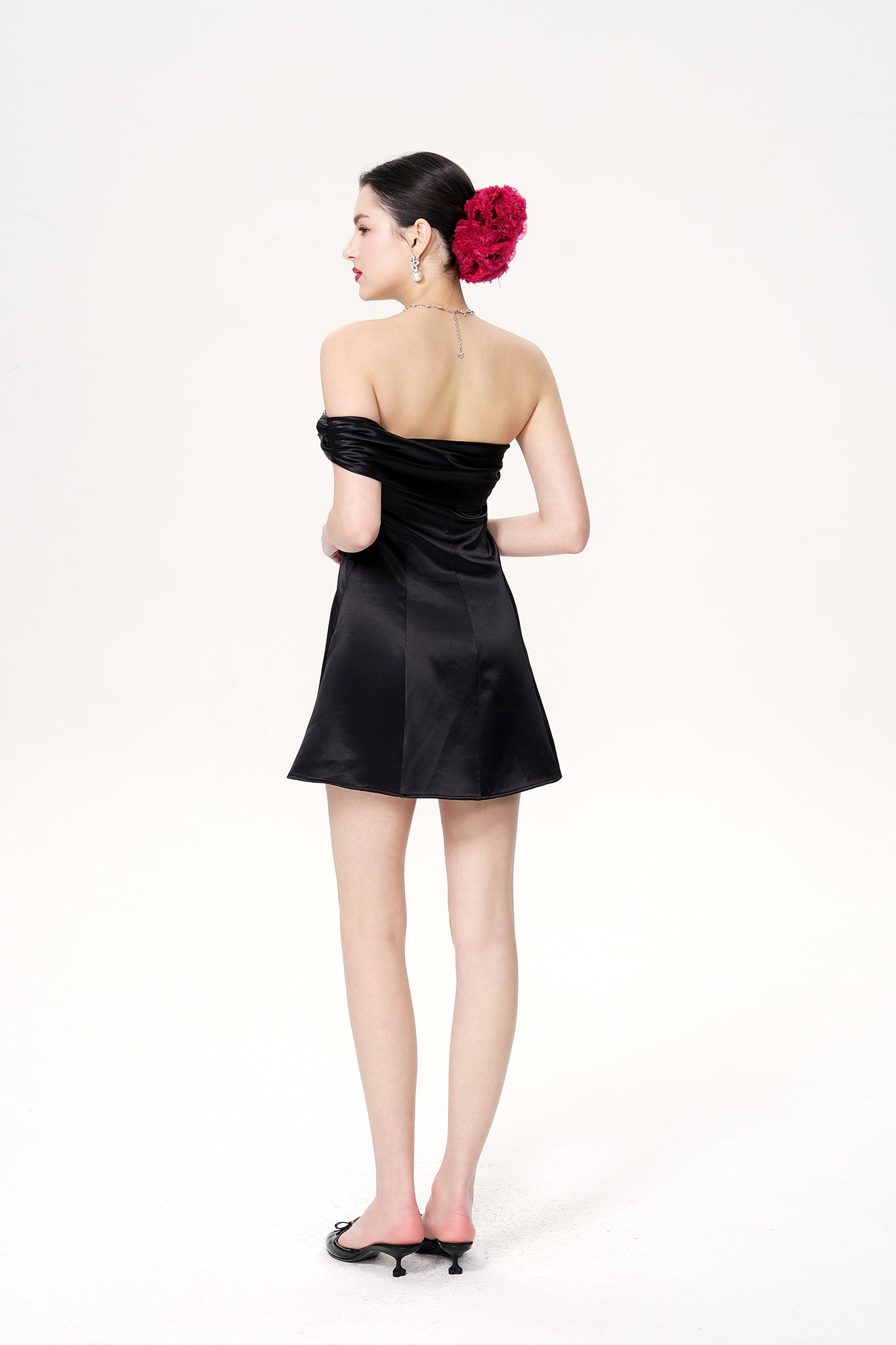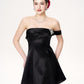 The Cornelia Dress, an elegant satin dress that shines with soft pearlescent glow, perfect for making a graceful statement. The strapless, asymmetrical design features soft pleats that wrap gently around the chest, with a single side sleeve for a unique, romantic touch. The fitted waist highlights your curves, while the A-line skirt flows beautifully.