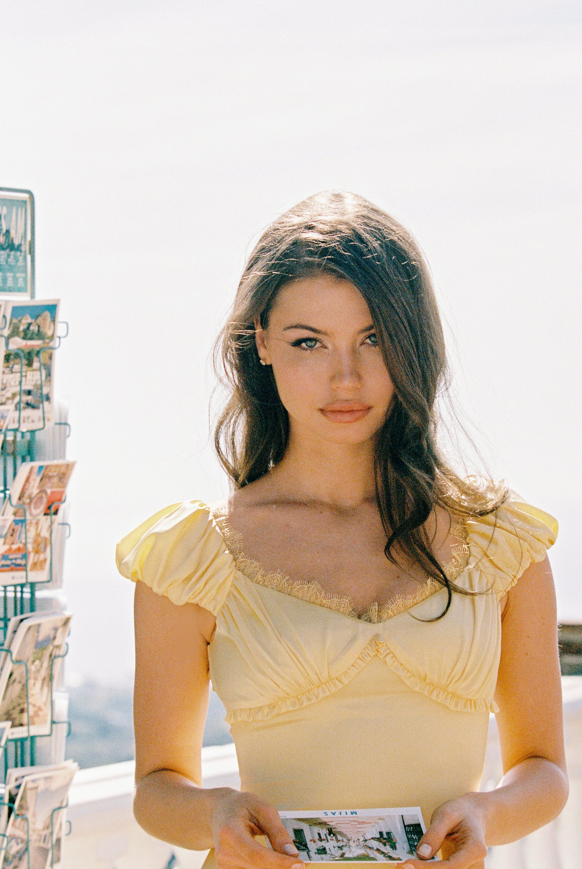 Fit: Softly sculpted silhouette with airy puff sleeves and a fluid A-line skirt.