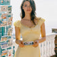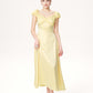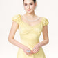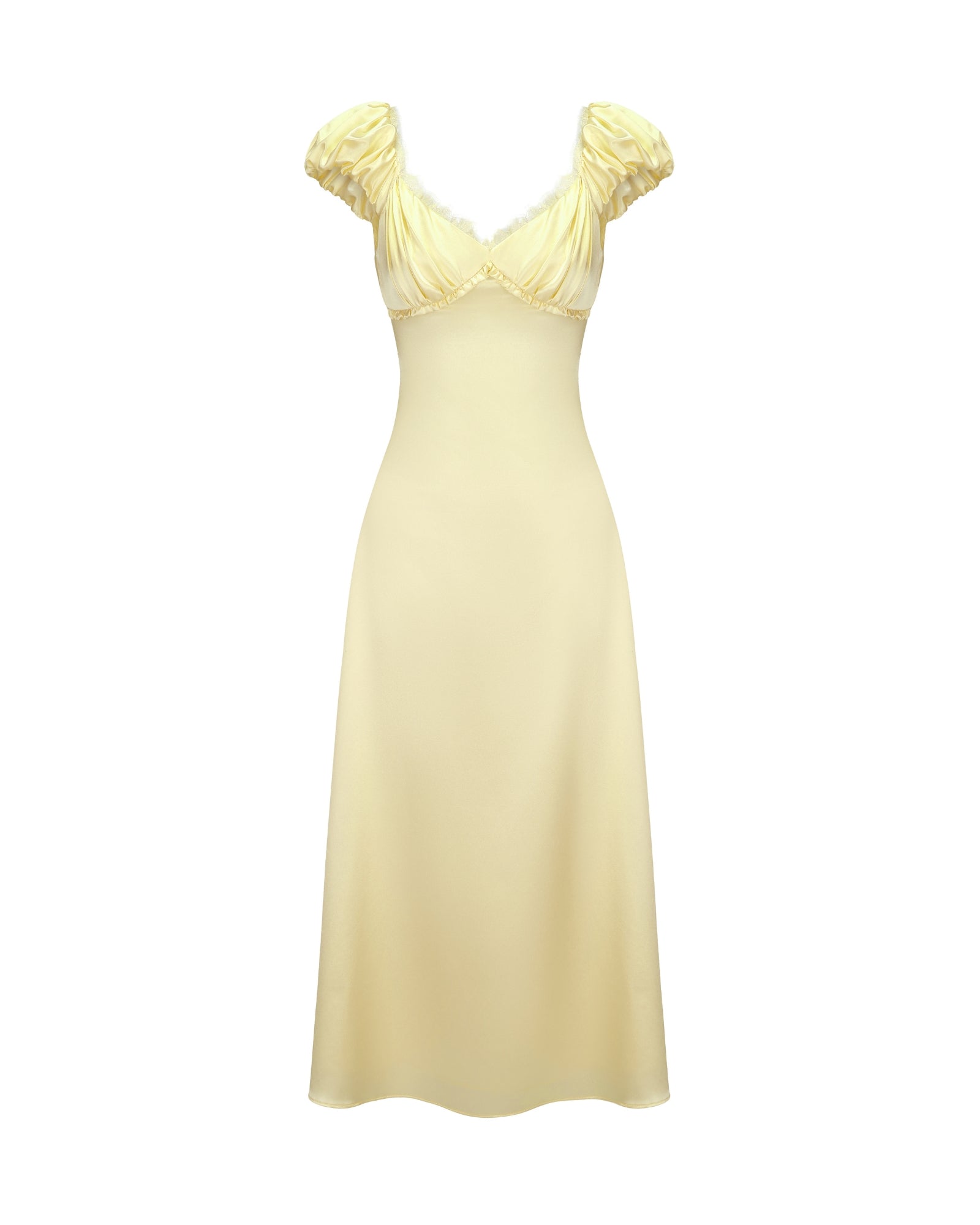Design: Feminine satin dress featuring pleated bodice, sleeve detailing, and romantic lace trim.