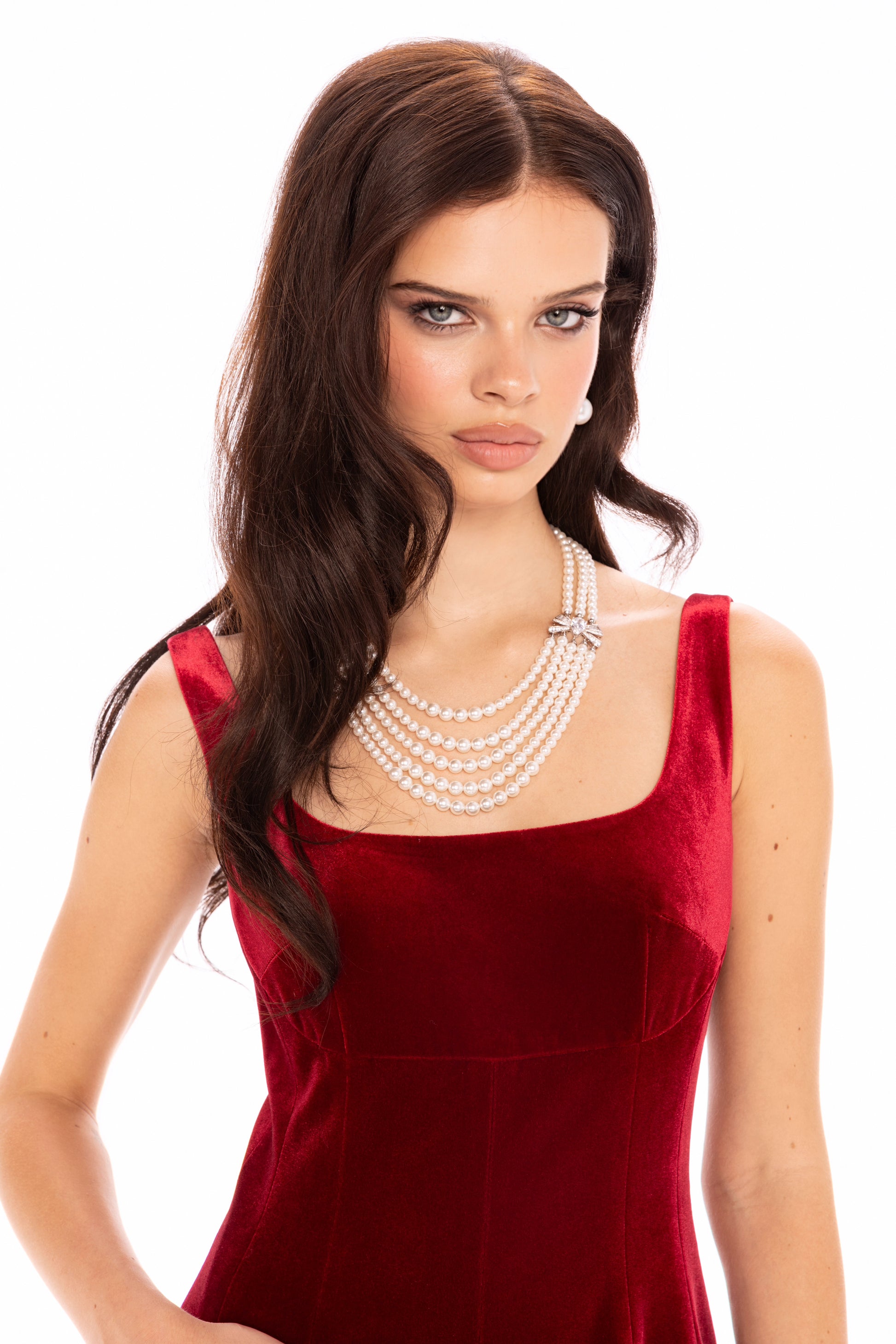 Red long velvet suspender dress on a white background: -