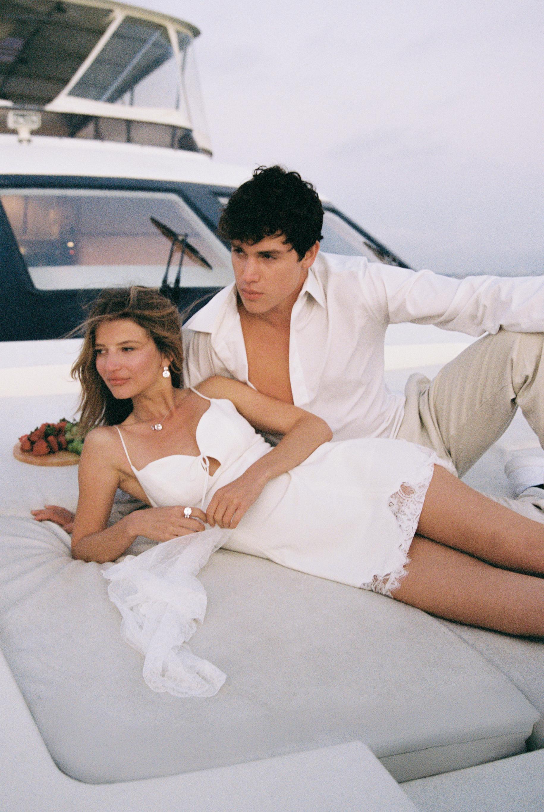 The Emira Dress reimagines the classic suspender dress with a structured, tailored twist. Crafted from sleek suit fabric, this fitted dress hugs the waist and flares gently into an A-line hem with soft lace detailing. A lace bow and cut-out neckline add just the right amount of feminine contrast, blending elegance with quiet sophistication.