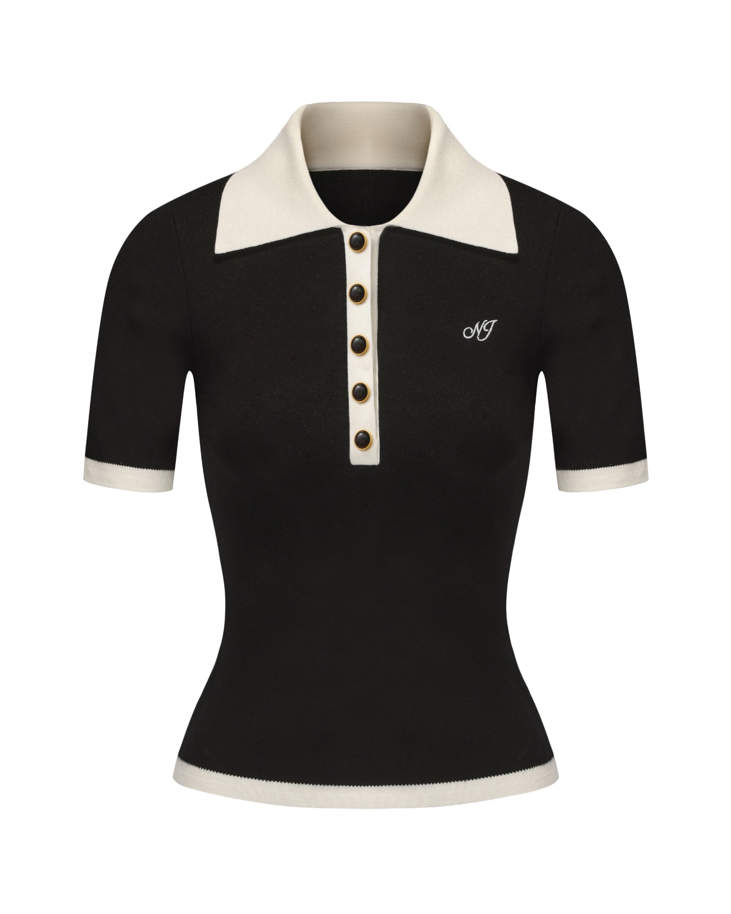 The Hazel Polo Top blends timeless elegance with modern sophistication. Crafted from high-twist core-spun yarn, this luxurious piece features bold contrasting colors and exquisite details. The retro stand-up collar gracefully frames the neckline, while the gold-rimmed gem buttons and embroidered Nana Jacqueline's initials add a touch of elegance. Perfectly fitted to highlight your shape, this versatile polo top is ideal for both casual and formal occasions, offering comfort, style, and refined charm.