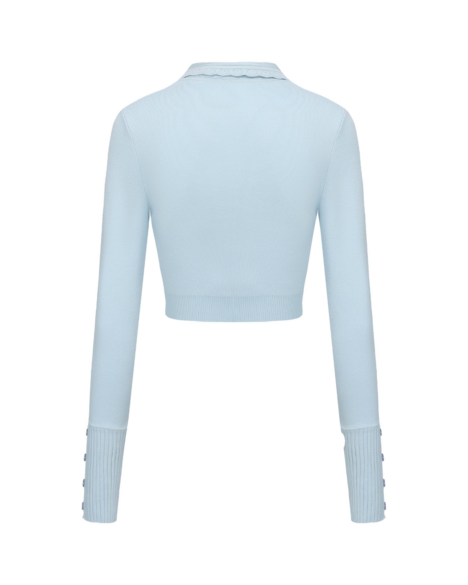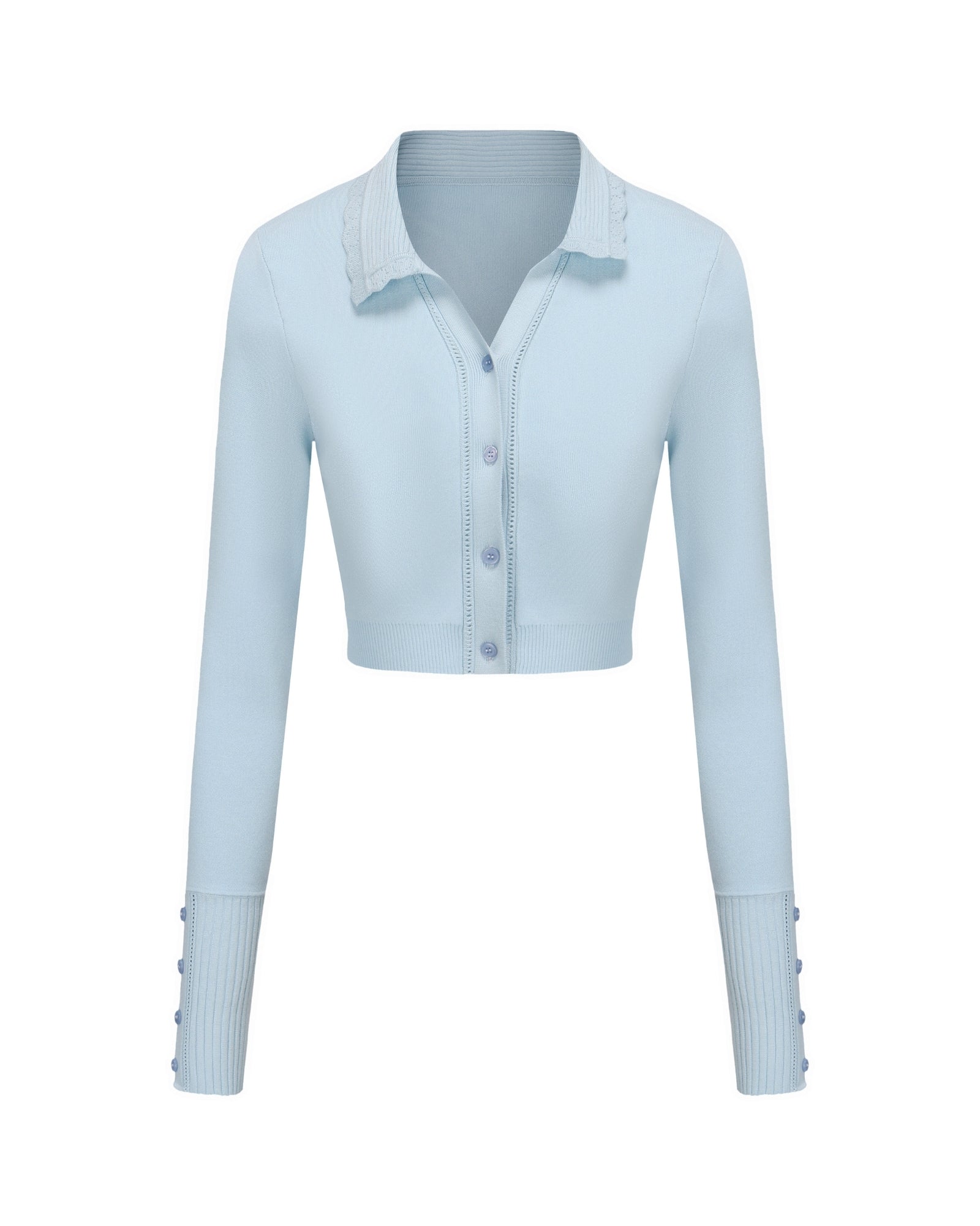 The Jenna Cardigan is a romantic knitwear essential, crafted from high-twist core-spun yarn for a soft and skin-friendly feel. The short length flatters your waist and elongates the figure, while the lace-trimmed lapel and heart-shaped eyelet details add a delicate, feminine charm.