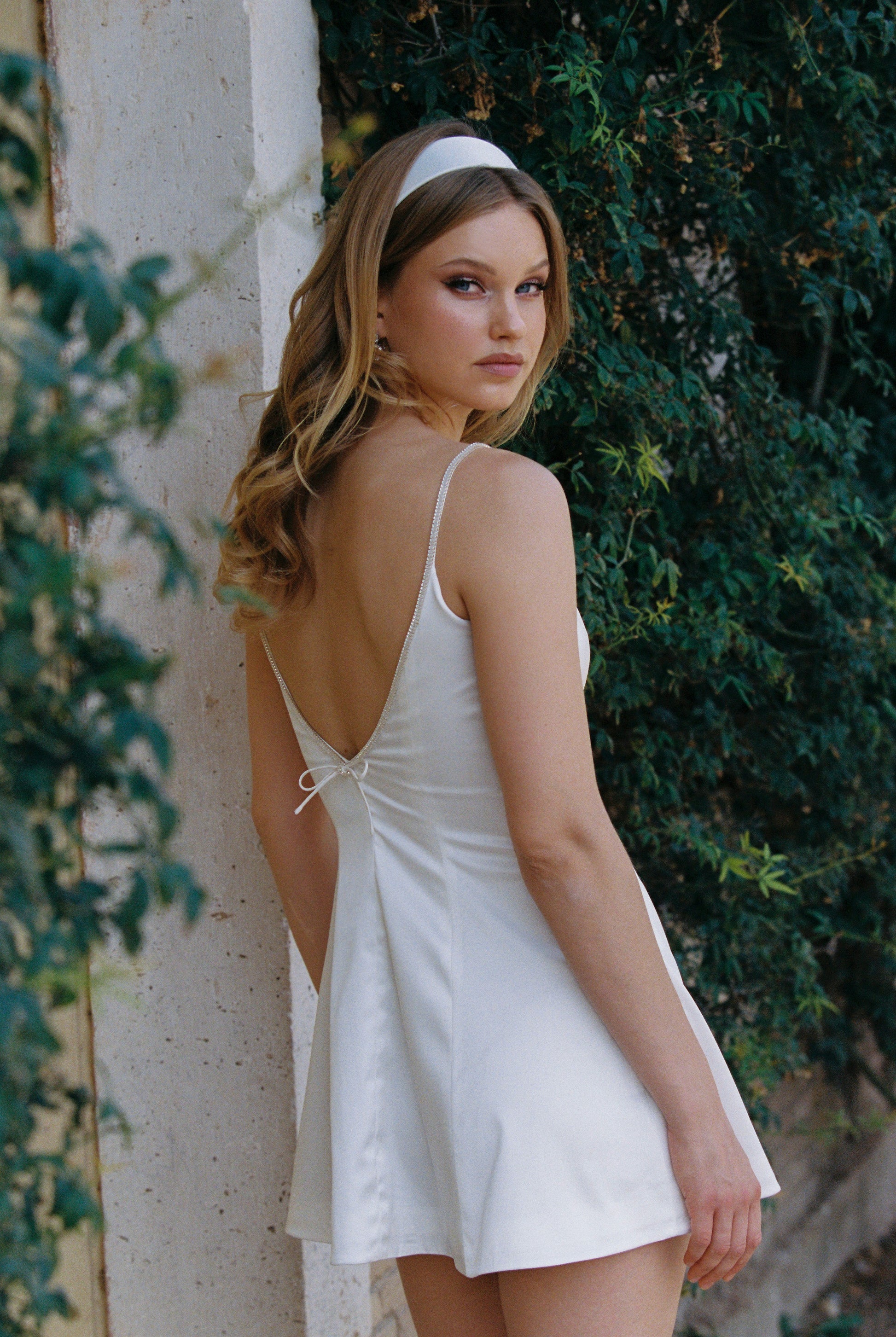 The Julisa Dress is a white satin mini dress that radiates elegance and sophistication. Crafted from lustrous stretch satin, it skims the body for a smooth, flattering fit while offering comfortable movement. The shimmering zircon diamond chain along the neckline adds a touch of luxury, catching the light from every angle. A delicate satin bow at the back completes the look, while the flared A-line skirt creates a playful yet refined silhouette — perfect for bridal showers, cocktail parties, and special occasions.