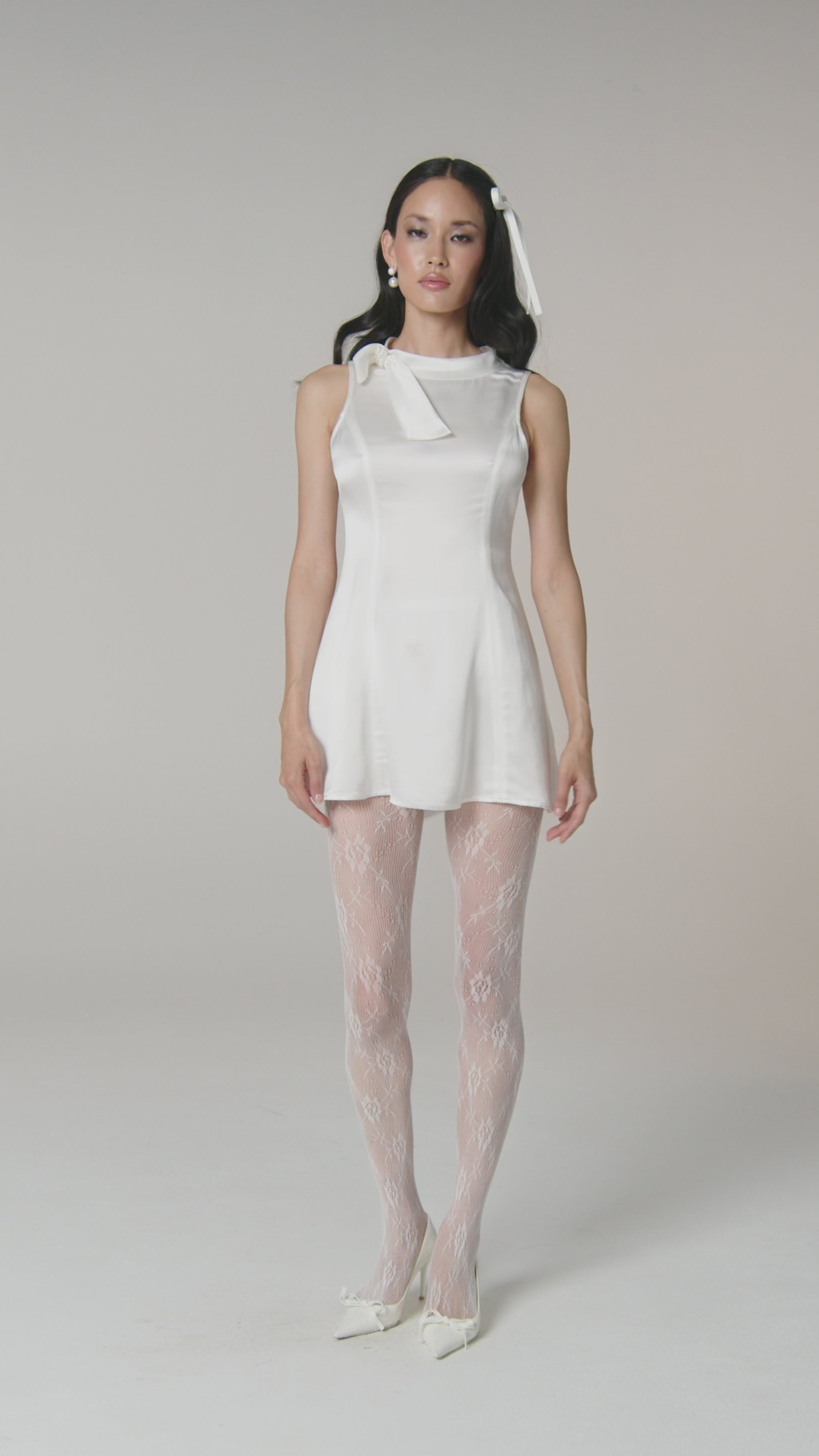 White sleeveless satin mini dress with a bow detail on a white background: -