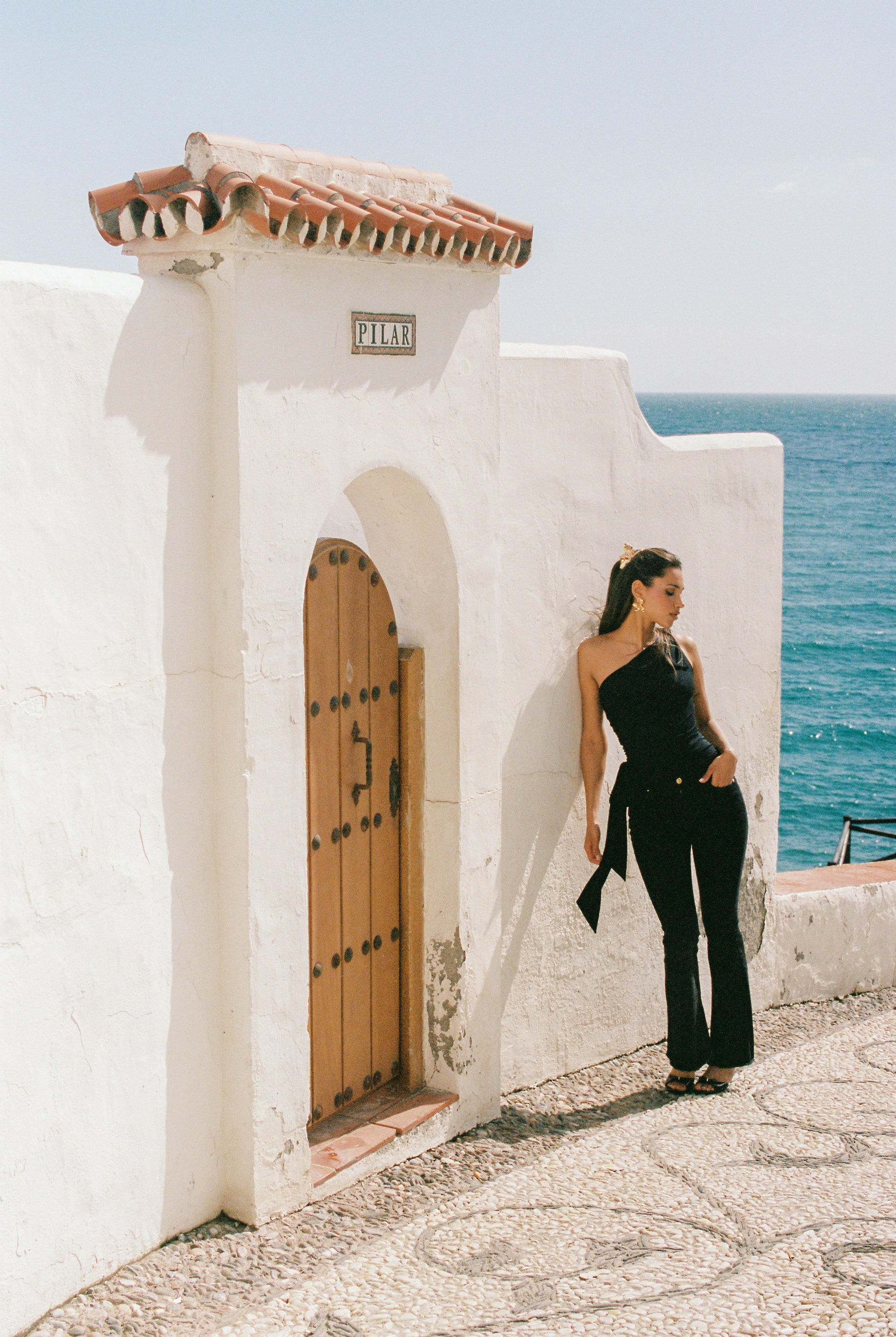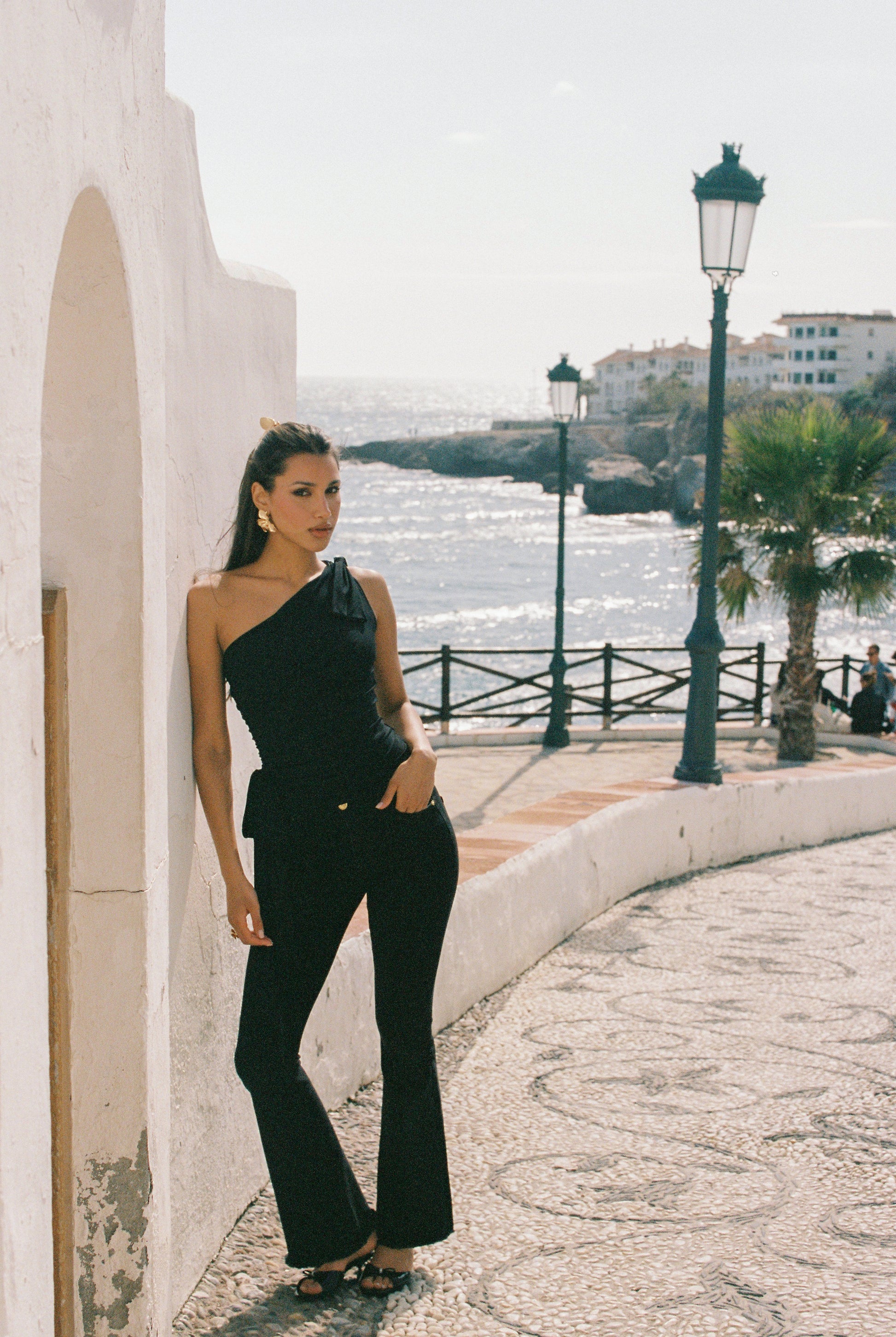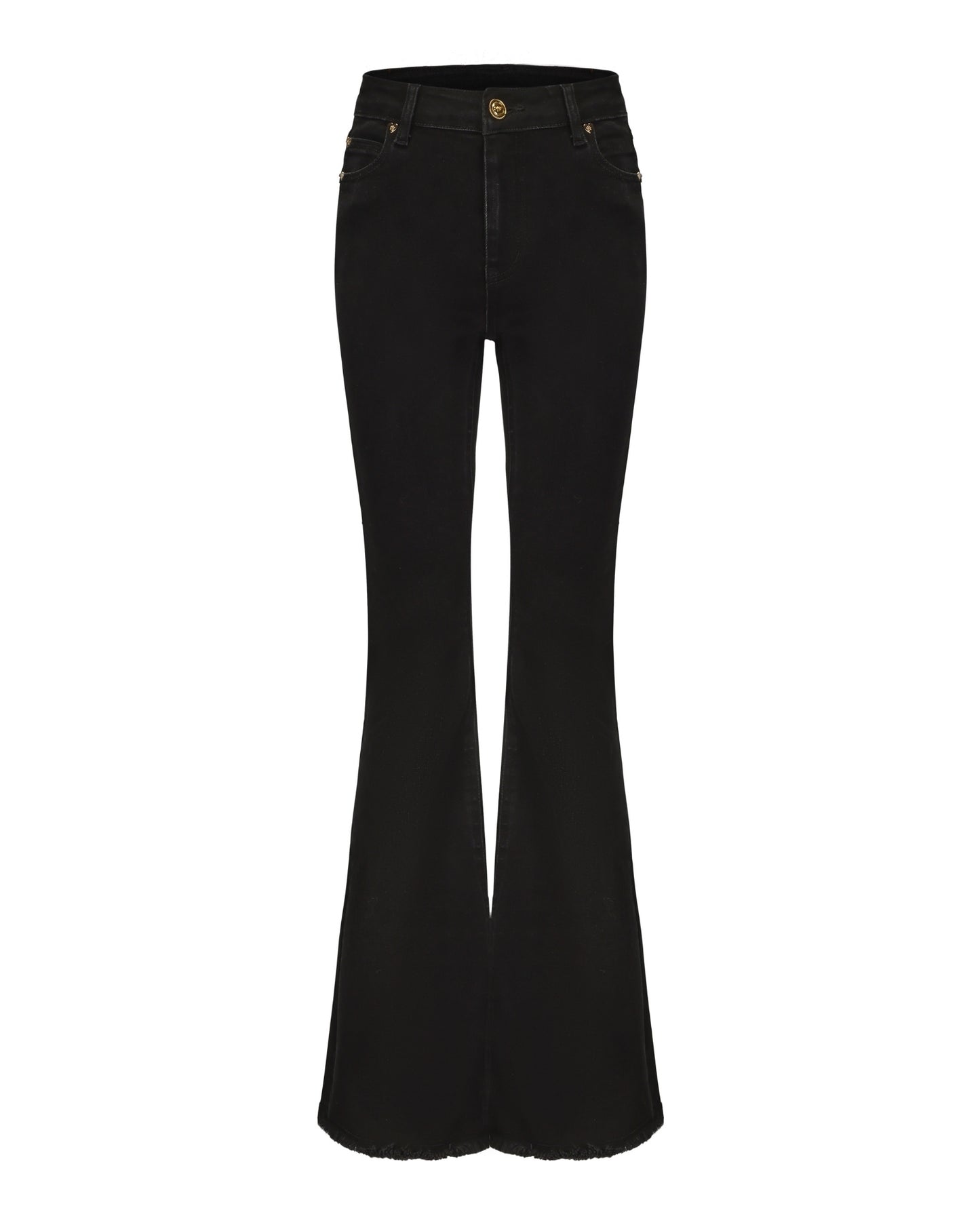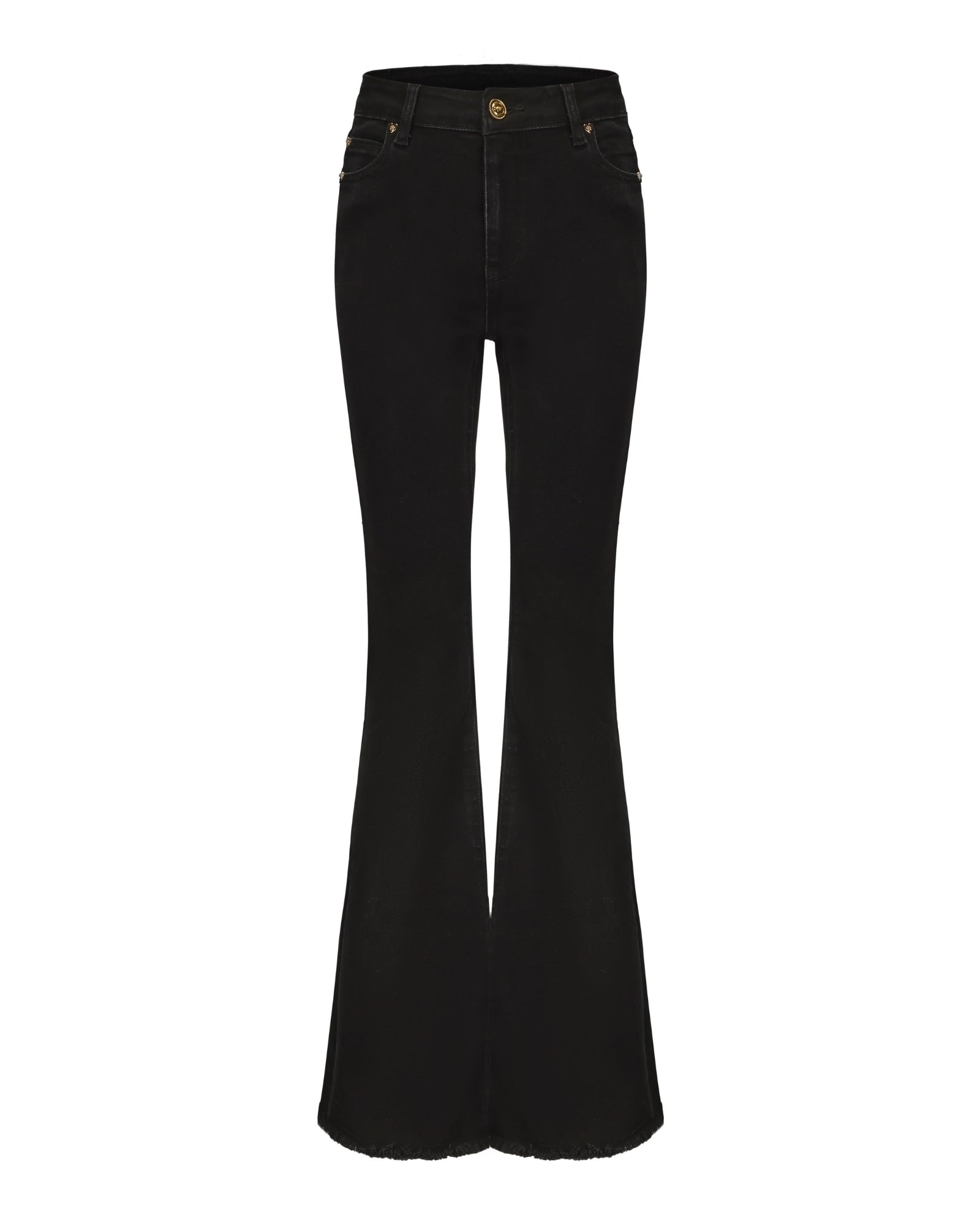 The Margaux Jeans are as deep as the night, with a sleek black color that enhances the figure. Golden love rivets sparkle like stars, adding a touch of dazzling elegance. The flared silhouette flatters the legs, elongating the proportions with smooth, flowing lines. A subtle raw edge at the feet adds a touch of spontaneity and freedom, completing the look with effortless style.